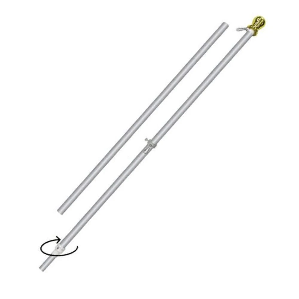 6ft Spinning Stabilizer Pole – Silver 2 Section Aluminum Spinning Stabilizer Pole is 6 feet long with a 1-inch diameter and gold ball top and silver finish. These poles were recently upgraded from our previous model for strength and durability. they now include a mid-section ball joint so that the pole spins freely, and the flag never tangles. These Poles are for Wall mounting Only -- NOT for Flag Bases. Flag and mounting bracket sold separately.