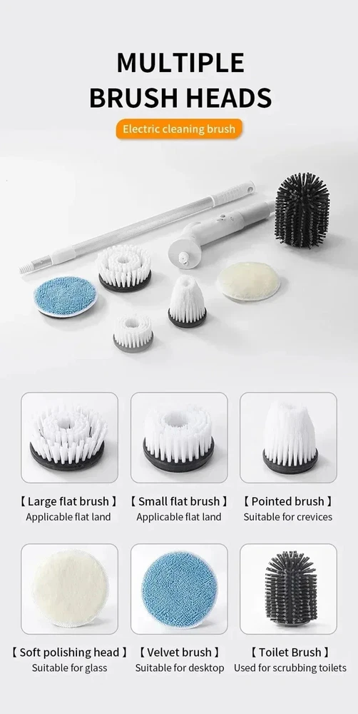 Features: 1. Powerful: Strong magnetic motor, high torque, non burning, high power. 2. Simple operation: Electric operation saves time and effort, freeing hands. 3. Humanized design: Scalable design, cleaning without bending down, making cleaning more convenient. 4. Multipurpose: Suitable for flooring, furniture, bathroom, kitchen, car, interior, etc. Specifications: Function: mopping/cleaning/washing dishes Product category: Cleaning brush Material: Plastic Package List: Electric cleaning brush * 1 Soft polishing head * 1 Velvet brush * 1 Toilet brush * 1 Large flat brush * 1 Small flat brush * 1