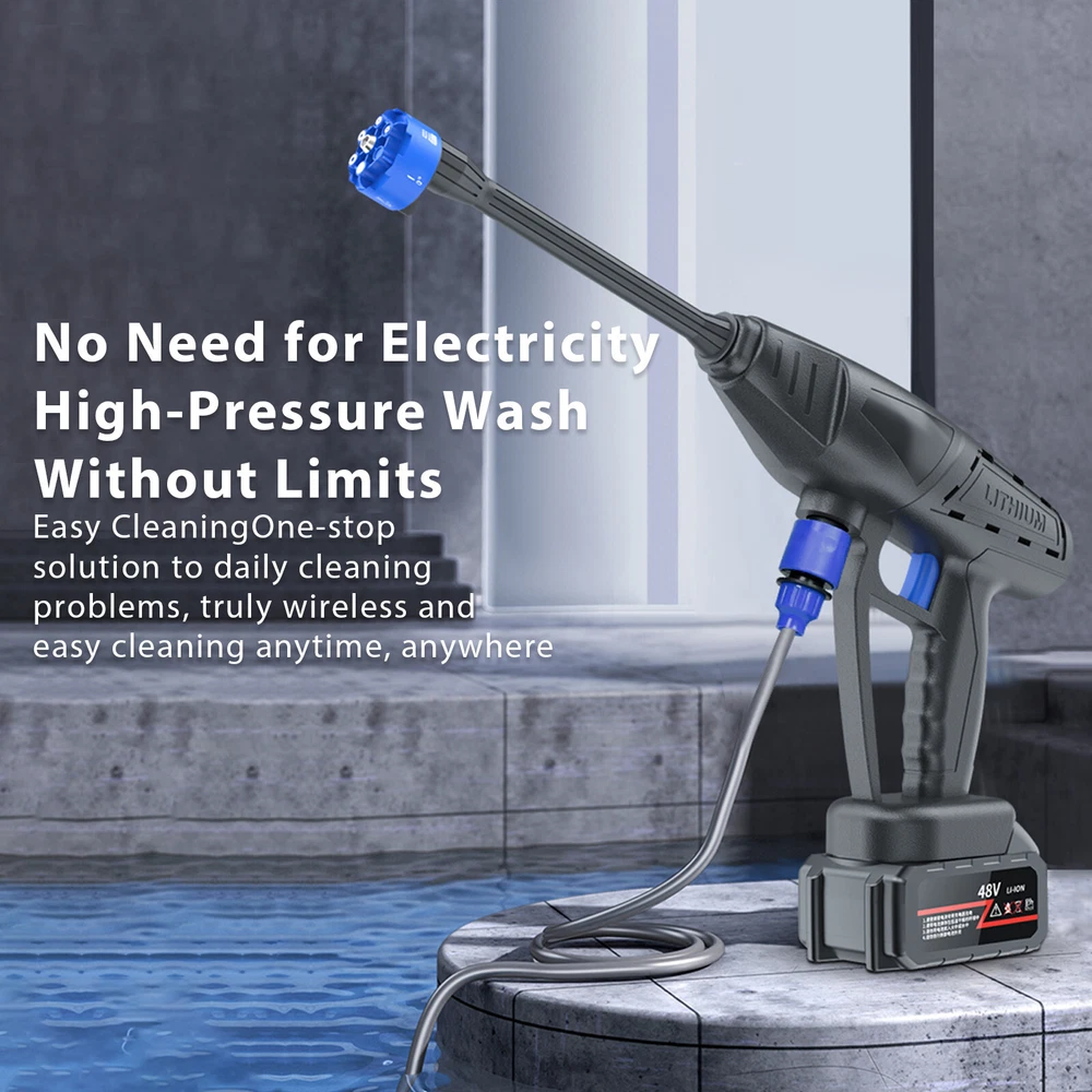 Introducing the NGTECO Cordless Electric High Pressure Water Spray Gun Portable Car Washer Cleaner Tool! This powerful cleaning tool features a 26bar water pressure and a rated flow of 240 L/h, making it perfect for cleaning your car or other outdoor surfaces. The gun is lightweight and cordless, making it easy to use and maneuver. It comes with a US Plug and two batteries with a battery capacity of 1200mah for one battery. The product also includes a water inlet filter and a quick connect feature for added convenience. The shooting range of the gun is 4-6m/157.48-236.22inches, and it has a maximum pressure of 1.2mpa/145PSI. This pressure washer gun is perfect for anyone who needs a reliable and efficient cleaning solution. Specification: Type: Water Pressure Washer Color: Black Power Source: Battery Battery voltage: 48VF Peak power: 300W Rated pressure: 30bar Battery capacity: 12000mah for 1 Battery Water pressure: 30bar Shooting range: 15m Number of batteries: 1
