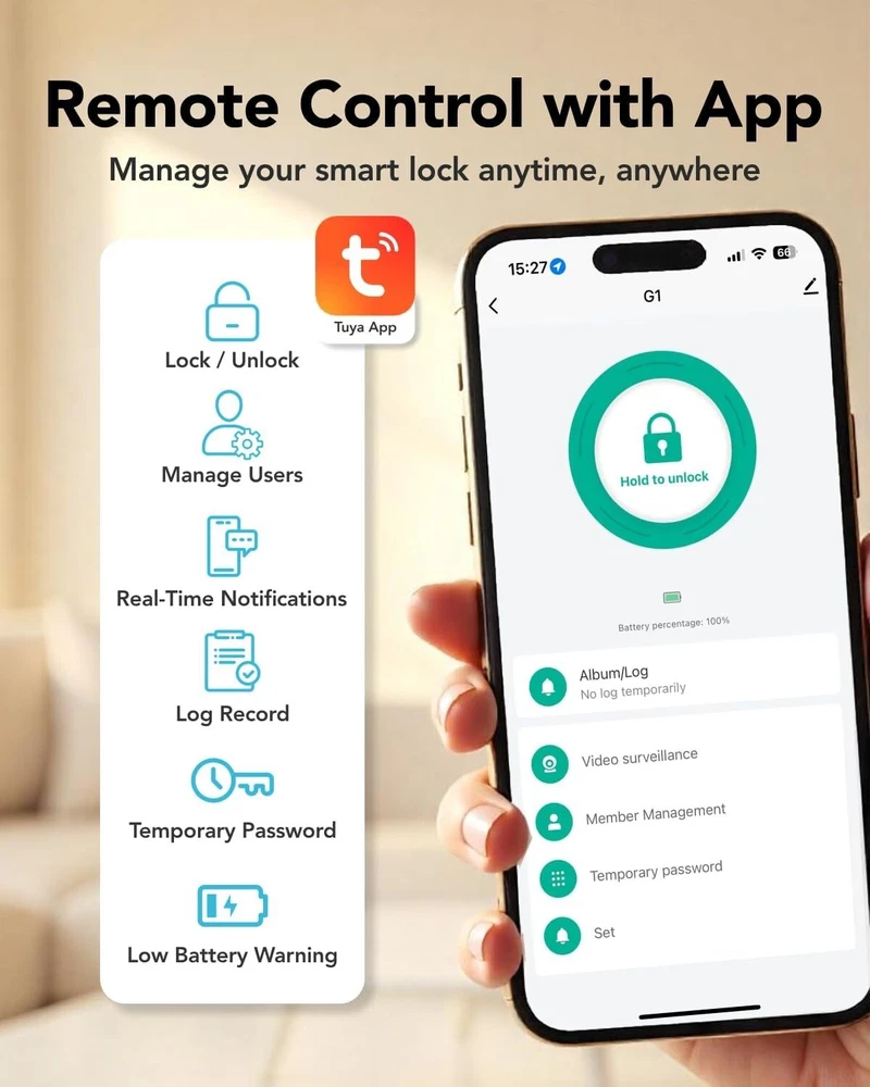 The 6-in-1 Upgraded Smart Lock is a keyless entry electronic lever door lock that allows you to program up to 30 user access codes that can be customized for family, friends or guests. It is easy to install, program and use, and it also features smart key security as a backup key slot. This entry lever can be locked or unlocked using a keypad or key on the outside and a rotary button on the inside. Combine the convenience of keyless entry with the highest residential security ratings and leading designs and finishes to enhance any door in your home. Perfect for a home office, storage room or interior garage door, the 6-in-1 Upgraded Smart Lock provides the right access solution to make your life more convenient, stylish and secure. Our smart locks are available in two styles - traditional and modern to match your home decor. In addition to this, our smart locks are available in three colors: Metallic Black, Premium Gray, Silver Gray. 【Wi-Fi Enabled】:6-in-1 Smart lock is a Wi-Fi-enabled door lock that connects directly to your home Wi-Fi network and smartphone for a secure smart home that does not require a third-party smart home hub, panel, or subscription 【APP Remote control】 Tuya APP, support Google Assistant, Amazon Alexa,Support remote unlocking and authorization, convenient for managing visitors or temporary users,Increase convenience.Receive notifications of your lock's activity and view the lock event history from your smartphone using the app for easy query and management 【Improve security】: Multiple unlocking methods (such as fingerprint, password, mobile phone App, etc.) Intercom, human body detection, automatic capture and upload to APP, automatic lock (timed anti-lock). Independent door Bell button, approach light reminder, automatic recognition of left and right door opening,reduce the safety hazards of traditional keys 【Multi-user management】: Support fingerprint, password or mobile phone authorization for multiple users, convenient for family members or employees,Switch between three entry modes: Multiple locking settings include ""Auto Lock"" (locks after every entry and exit), ""Passage"" (stays unlocked and no key or code required), and ""Disable Passage"" (for property managers, auto-locks every time and a key or code is always required for entry). 【SecureScreen&Digit Keypad&】Patented security feature for touchscreen deadbolts that prevents on-screen fingerprint user code identification by employing random digits prior to entering a personal user code,eypad deadbolt is backlit and comes with a dedicated one-touch locking button for keyless convenience"