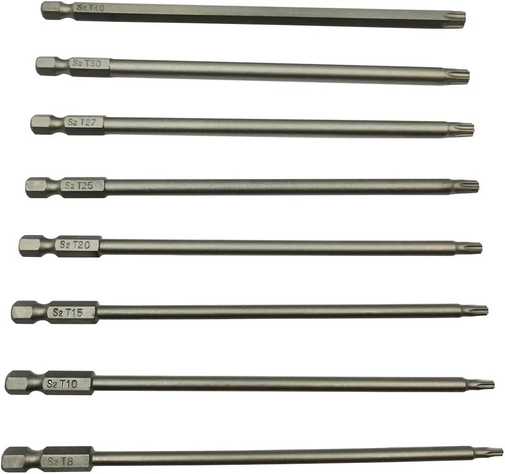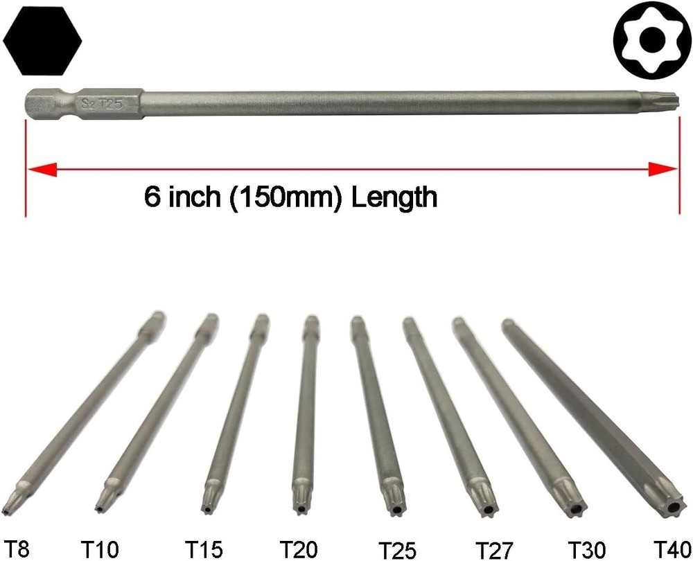 Long Torx Security Screwdriver Bit Sets 6 Inch Length T8 T10 T15 T20 T25 T27 T30 Item Length: 6 Inches Material: Alloy Steel Drive System: Star, Torx, Hex Finish Type: Steel 8 Size Torx Screwdriver Bits T8, T10, T15, T20, T25, T27, T30, T40, 8 in 1 Professional Size long torx security driver bits set can meet your different needs. Size is clearly engraved on the shank for easy identification. Widely Application 1/4” inch hex shank, and 6 inch (150mm) length. Can be used with electric screwdriver, manual screwdriver, electric drill, group general tools, air drill and other any standard bit holders. S2 High Quality Steel Made of S2 high quality shock-resisting tool steel, a hard and abrasion-resistant alloy metal. Torx head bits surface for steel material color,from inside to outside are the same. Magnetizable Head Magnetizable torx security screwdriver bar(New Bits with Weak Magnetic). After Magnetized with a magnet it would with a strong magnetic, can suck the screws easily when used it. Exquisite Workmanship This torx security tamper proof star bit set, exquisite workmanship, each edge can be accurately locked screws, no damage to the screw, and the screwdriver head.Such a practical aid in many situations. Return Policy: We offer a 30 day return policy from the receiving date. Please contact us for a Free Return Label. Please use our return label so it will go back to our supplier and we can do a refund or replacement afterwards. Feedback: Your satisfaction is very important to us! If you have any problem with your order, please contact us and we will do our very best to make you satisfied. As long as you are happy with your purchase, please leave a positive feedback for us. We will always leave you a positive feedback in return. If you have any problem with your purchase, please do not leave a negative feedback. Please Contact us ... and your issue will be solved quickly and positively We are a small family-owned business trying to make a living, not a huge company that does not care ... We will ALWAYS do our best for you!