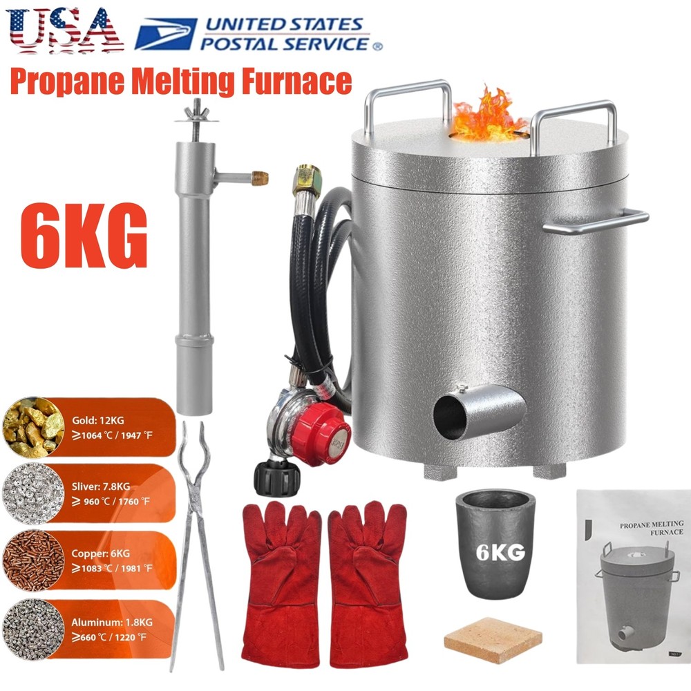 6kg Propane Melting Furnace Foundry for Scrap Metal Recycle Gold Copper Smelter 🔥 Efficient Melting Performance Quickly melts up to 6kg of metal, ideal for recycling gold, copper, and other scrap metals. 🔒 Safe and Secure Operation Equipped with a high-quality burner and secure fittings to ensure safe use and optimal performance. 🛠️ Durable Construction Built with premium materials for long-lasting durability and resistance to high temperatures. ♻️ Eco-Friendly Recycling Perfect for eco-conscious users looking to recycle metals efficiently and sustainably. 🔧 Easy to Use Comes with clear instructions and a user-friendly design for hassle-free operation. Efficient Melting Our propane melting furnace can achieve temperatures of up to 1300°F, allowing you to melt metals with melting points below this temperature in just 15-20 minutes. Whether you’re working with gold, sterling silver, pure copper, or aluminum, this furnace can handle all your needs effortlessly. Outstanding Heat Performance Featuring a high-density ceramic fiber insulation blanket, this furnace easily withstands temperatures over 1300°F while maintaining exceptional durability and lightweight design. Additionally, the latest model includes an upgraded intake valve on the burner, equipped with a cutting-edge 30PSI propane regulator and a PSI pressure gauge. Reduced Melting Time We've designed this kit with insulation materials to minimize heat loss, resulting in significantly shorter melting times. It is ideal for both home and commercial applications, making it a versatile and powerful choice. Complete Melting Kit This comprehensive kit includes everything you need for a seamless melting experience. It comes complete with a furnace, burner, gas hose with regulator, tongs, a 12KG crucible, fire pad, mold, insulated gloves, and a manual, providing an all-in-one solution for your melting projects. Suitable for Beginners Whether you are a novice or a seasoned professional, this kit is perfect for melting precious metals like gold, silver, and copper. It's an excellent choice for jewelry making, casting, and a variety of DIY projects. Brand Unbranded Type Melting Furnace Color Silver Material Stainless Steel