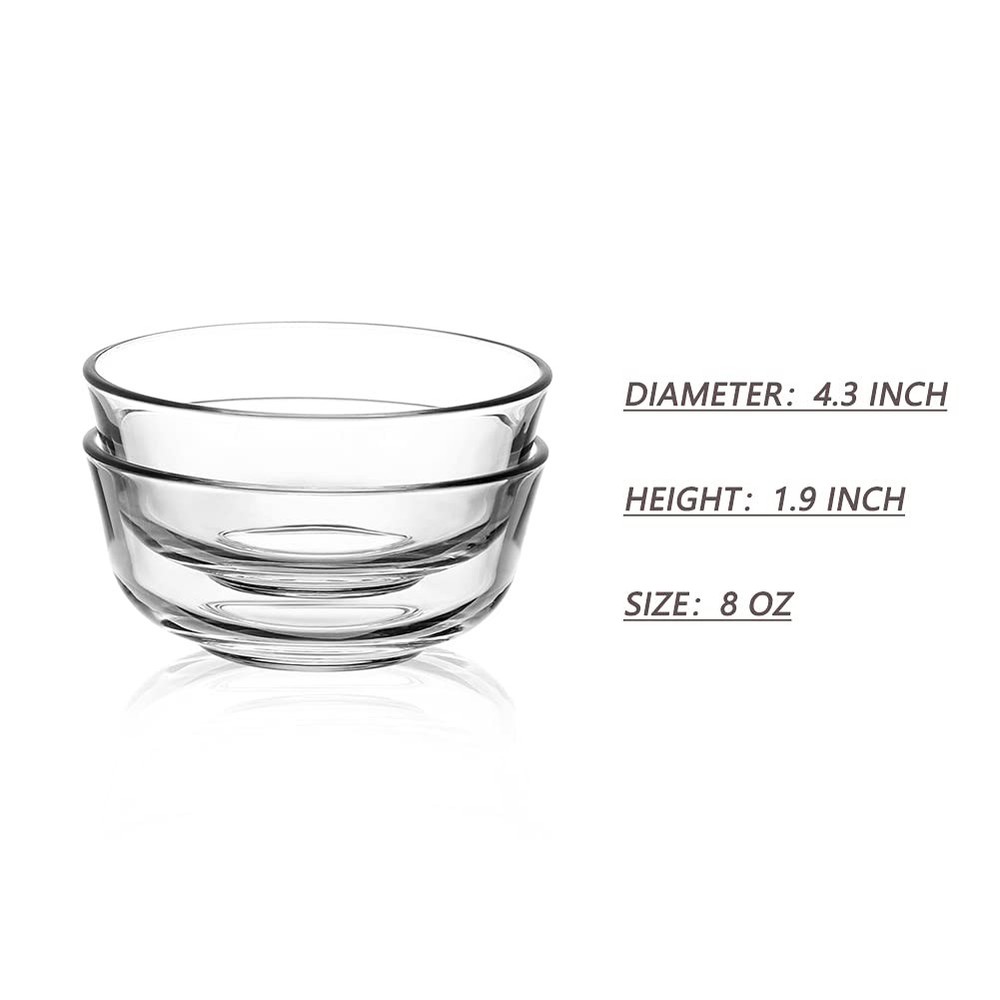 Practical handy bowls for kids and pets - It holds 8 oz top to the rim. Perfect for ice cream, dessert, fruit, meal prep, small snacks, dipping sauces, leftovers and more. Made by glass material, lead free, BPA free, Can contact food directly, Dishware safe, easy to clean up.It will not warp, stain, retain smells, or leach dangerous chemicals into food. Stylish designs, our bowls can be coordinated with your all kinds of tableware. the rice bowls can also let you put on a nice food presentation as you like. Include 6 Packs 8 oz Mini Glass Bowls, It will make your meal preparation so much easier by being able to clearly keep track of all ingredients at once. Easy to Clean & Stack: Dishwasher safe ; You can wash them with cleanser or put them into your dishwasher. Bowls stack compactly and free up enough space for other dining set in the kitchen cabinet.