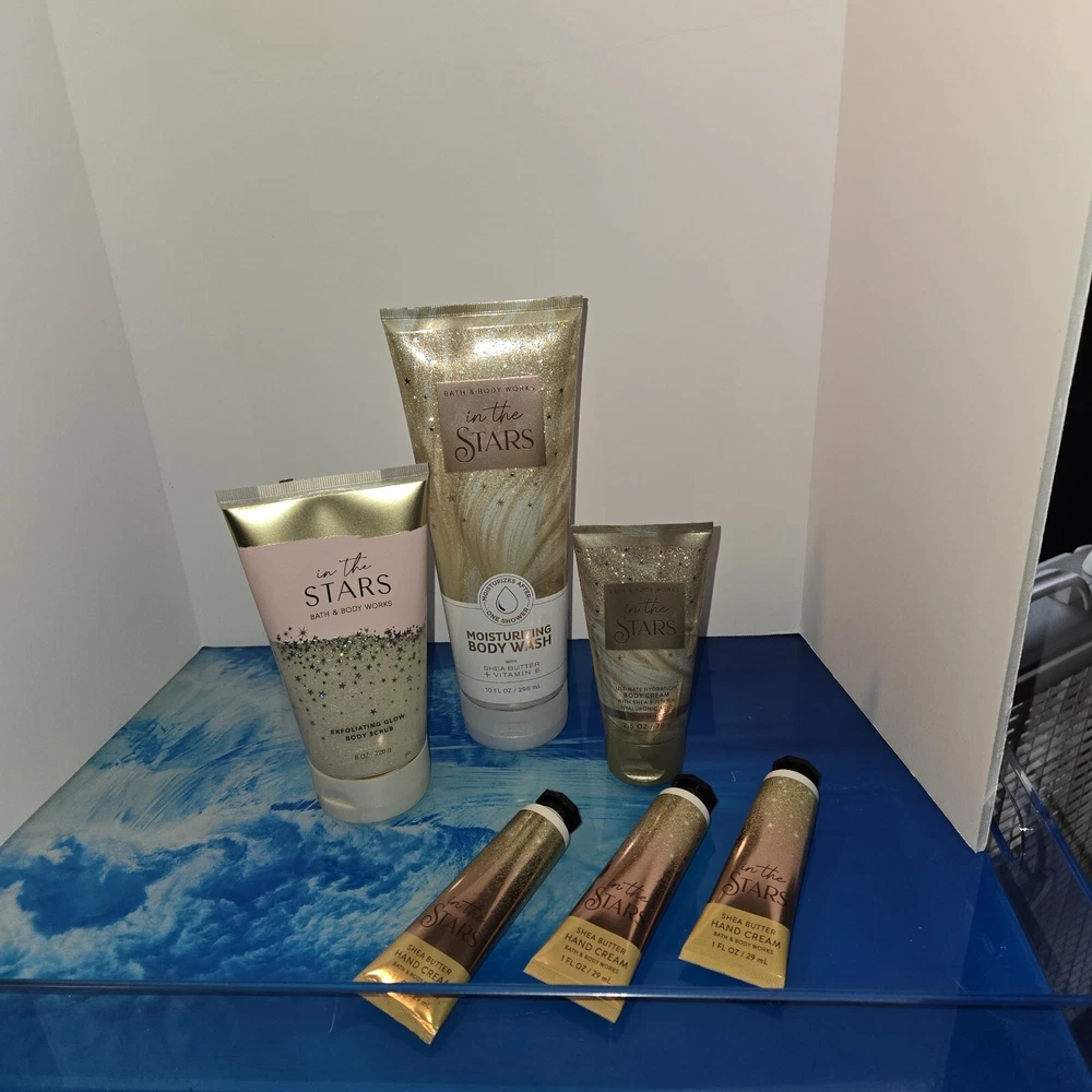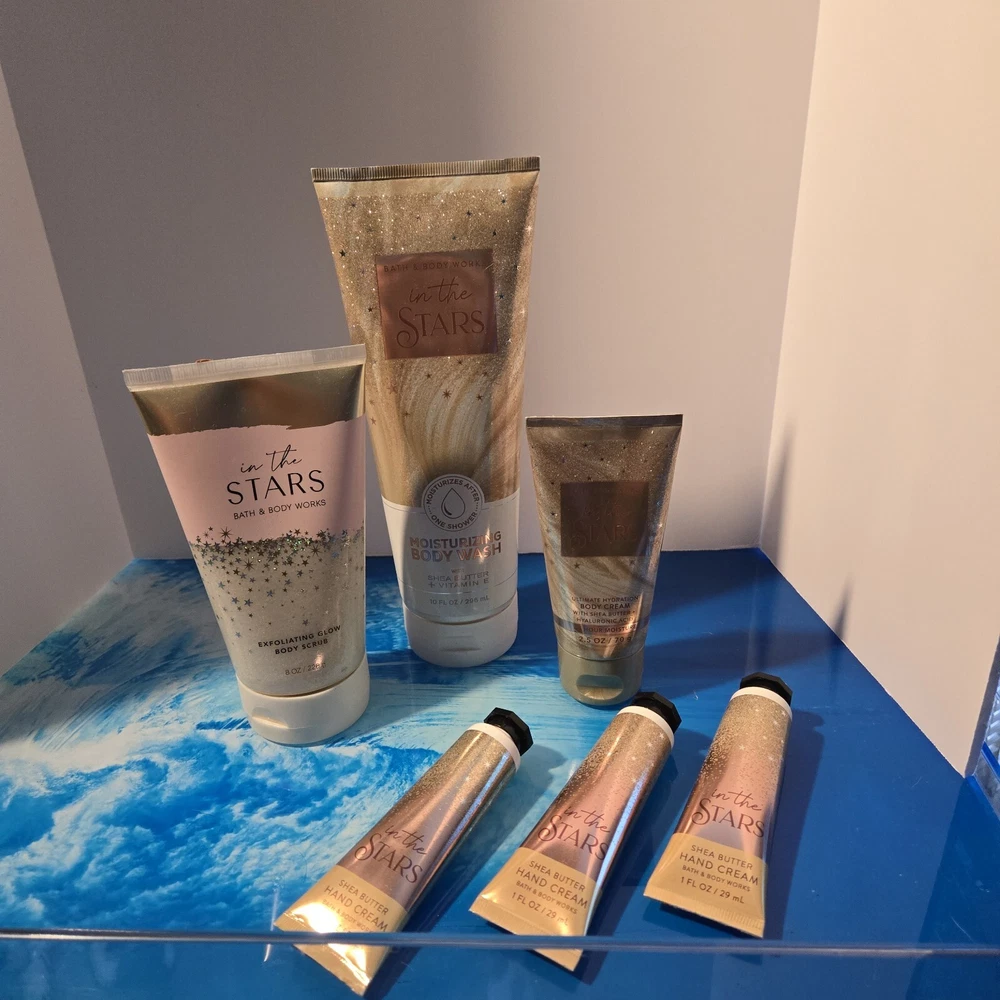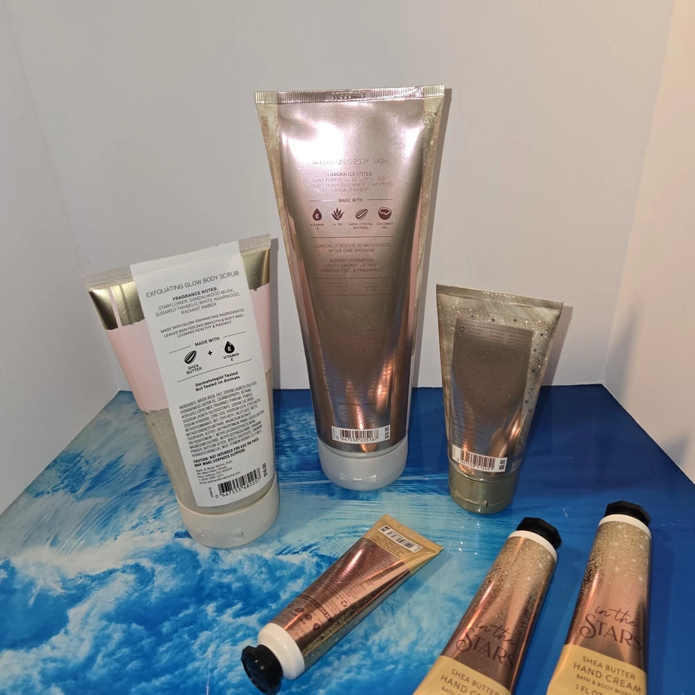 5pc Lot Bath & Body Works In The Stars Scrub Wash Cream. 3 x 1oz hand 1 x 8oz body scrub 1 x 10oz Moisturizing Body Wash 1 x 2.5oz hand cream Exactly as pictured