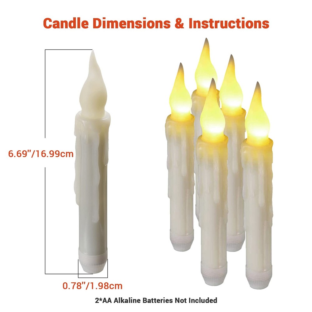 Magic "Floating Candles" - Updated hanging hole design, the perfect flameless candles set for you to hang them on the ceiling with fishing lines for themed party/ classroom/ bedroom decorations. 【You Will Get: 6 Pack Diameter 0.78"x Height 6.69" taper candles. 】 Built-in 6 Hours Auto Timer - You don't need the remote. The taper candles will automatically off when 6H timer ends and automatically on at the same time the second day. Cycle every 24 hours! Save your time on turn on/off when you hang it from the ceiling. Standard Taper Candle Size - Great for displaying in most standard candle holders, candlesticks and candelabra. 【Tip: Tighten/Loose the candle bottom for ON/OFF. To make the candles work, please make sure that candle bottom is tightened.】 Battery Operated Taper Candles - Requires 2 AAA batteries per candle (Batteries are Not Included). Simply install the battery and enjoy over 100 hours of use! Changing the battery can be used unlimited times. Safe for kid-filled and pet-filled house! Realistic Flickering Yellow Flame - Alternative to traditional candles. Ideal decorations for Themed Birthday Party, Table-top Centerpiece, Wedding Ceremonies, Holiday Celebrations, Halloween/ Christmas Season and more!