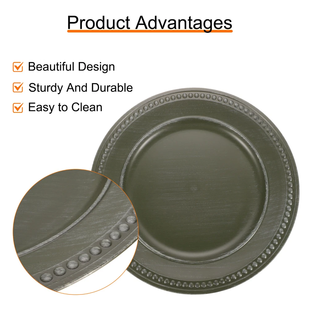 Document Dinner Plates Set:Package Included 6pcs x green brown beaded charger plates; with each plate charger measuring 13 inches in diameter, and the sufficient quantity and suitable size can meet your daily needs; They fit well under various salad plates, and dinner plates.Good Material:These plate chargers are made of plastic with floral pattern trim textured surface, lightweight and sturdy, and no nasty smell, washable and reusable, and will not break or fade, fine workmanship and stylish design will quickly grab others' attention.Petty Design:These charger plates fit under salad plates, soup bowls, and main course dinner plates to prevent your table from spills, our charger plates will blend a contemporary touch to every setting, style, and decor style with ease. Combining high-end ornamental appeal with the practicality of table setting.Easy Care:These charger plates are not microwave or dishwasher safe, Simply wash them under rinsing water and make sure to use a soft dish cloth. After drying, put them away. They will not take up much space on your worktop or dining table, and you can stack them when not in use.Wide Application:Our charger plates are suitable for many occasions, such as formal dinners, weddings, events, parties, and other occasions, and can enhance the decorative effect of the table layout and create an atmosphere. 6pcs Charger Plates Bulk 13" Plastic Beaded Chargers Dinner Plates, Green Brown Dinner Plates Set: Package Included 6pcs x green brown beaded charger plates; with each plate charger measuring 13 inches in diameter, and the sufficient quantity and suitable size can meet your daily needs; They fit well under various salad plates, and dinner plates. Good Material: These plate chargers are made of plastic with floral pattern trim textured surface, lightweight and sturdy, and no nasty smell, washable and reusable, and will not break or fade, fine workmanship and stylish design will quickly grab others' attention. Petty Design: These charger plates fit under salad plates, soup bowls, and main course dinner plates to prevent your table from spills, our charger plates will blend a contemporary touch to every setting, style, and decor style with ease. Combining high-end ornamental appeal with the practicality of table setting. Easy Care: These charger plates are not microwave or dishwasher safe, Simply wash them under rinsing water and make sure to use a soft dish cloth. After drying, put them away. They will not take up much space on your worktop or dining table, and you can stack them when not in use. Wide Application: Our charger plates are suitable for many occasions, such as formal dinners, weddings, events, parties, and other occasions, and can enhance the decorative effect of the table layout and create an atmosphere. Hot Item Payment 1.We accept eBay payment . 2.Payment must be received within 7 business days of auction closing. Shipping 1.We ship to your eBay or Paypal address. Please make sure your eBay and Paypal address is correct before you pay. 2.Items will be shipped within 1-3 business day when we received payment. 3.Delivery time depends on destination and other factors. Description Policy 6pcs Charger Plates Bulk 13" Plastic Beaded Chargers Dinner Plates, Green Brown Dinner Plates Set: Package Included 6pcs x green brown beaded charger plates; with each plate charger measuring 13 inches in diameter, and the sufficient quantity and suitable size can meet your daily needs; They fit well under various salad plates, and dinner plates. Good Material: These plate chargers are made of plastic with floral pattern trim textured surface, lightweight and sturdy, and no nasty smell, washable and reusable, and will not break or fade, fine workmanship and stylish design will quickly grab others' attention. Petty Design: These charger plates fit under salad plates, soup bowls, and main course dinner plates to prevent your table from spills, our charger plates will blend a contemporary touch to every setting, style, and decor style with ease. Combining high-end ornamental appeal with the practicality of table setting. Easy Care: These charger plates are not microwave or dishwasher safe, Simply wash them under rinsing water and make sure to use a soft dish cloth. After drying, put them away. They will not take up much space on your worktop or dining table, and you can stack them when not in use. Wide Application: Our charger plates are suitable for many occasions, such as formal dinners, weddings, events, parties, and other occasions, and can enhance the decorative effect of the table layout and create an atmosphere. Hot Item Payment 1.We accept eBay payment . 2.Payment must be received within 7 business days of auction closing. Shipping 1.We ship to your eBay or Paypal address. Please make sure your eBay and Paypal address is correct before you pay. 2.Items will be shipped within 1-3 business day when we received payment. 3.Delivery time depends on destination and other factors.