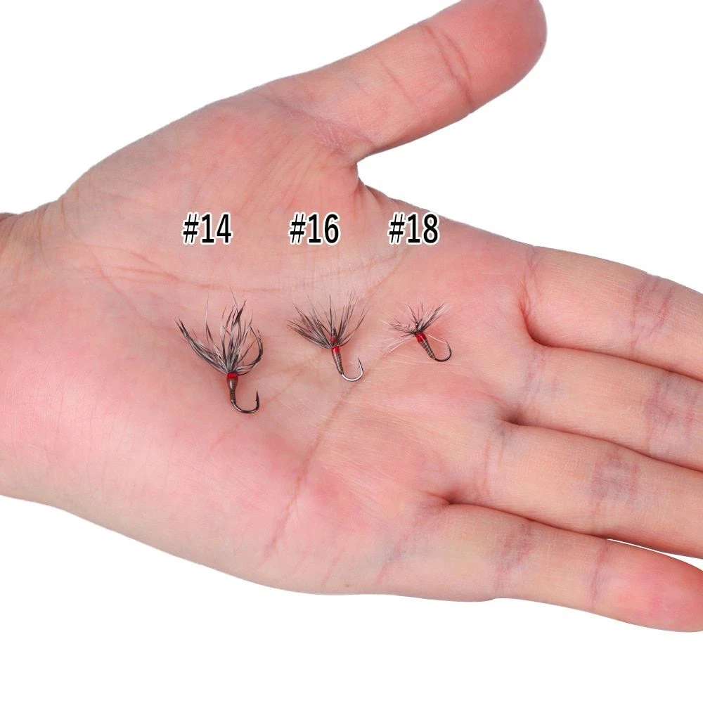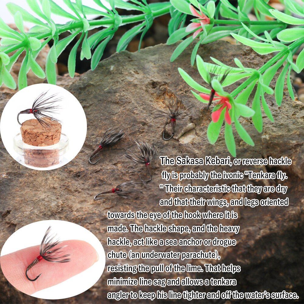 Fly Fishing Tenkara Flies Hook Material: High Carbon Steel Hook Size: #14,#16,#18 Feature: Standard dry fly hook, black-nickel finish, barbed, down eye, standard length, standard wire, needle point, wide gap, round bend, ultra sharp, high carbon steel, forged. Features: Tested, efficiency flies, tied with good quality fly hook. Native trout are the main target of tenkara anglers. Can be easily skated through the film or at shallow depth. It is great for a dead drift in most any current. Background of Tenkara fishing: A very ancient fishing style practied on mountain streams in Japan. Now it is attracting the attentions of all fly fishing men from the western world.This fishing style targets both warm and cold water streams, ponds and lakes for fishing trout, bluegills, largemouth bass, smallmouth bass, and crappies. The Sakasa Kebari, or reverse hackle fly is probably the iconic "Tenkara fly." Their characteristic that they are dry and that their wings, and legs oriented towards the eye of the hook where it is made. The hackle shape, and the heavy hackle, act like a sea anchor or drogue chute (an underwater parachute), resisting the pull of the lime. That helps minimize line sag and allows a tenkara angler to keep his line tighter and off the water's surface. Slight rhythmic pulsing flies by raising and lowering the rod causes the fish to jump. When the rod is lifted, the string is corrected and flies slowly pulls up and down. By lowering the rod down flies to sink slowly and feathers flies (Saccas Chebar) to bend towards the hook eye. Gently lifting up the rod,feathers flies to bend backwards. Thus pulling the fly looks like it was alive it irritates the fish shot. Pulsing should be very skillfully, and that can be a feathers, open and close.Tenkara has no strict rules. Enjoy Tenkara in your fishing time.