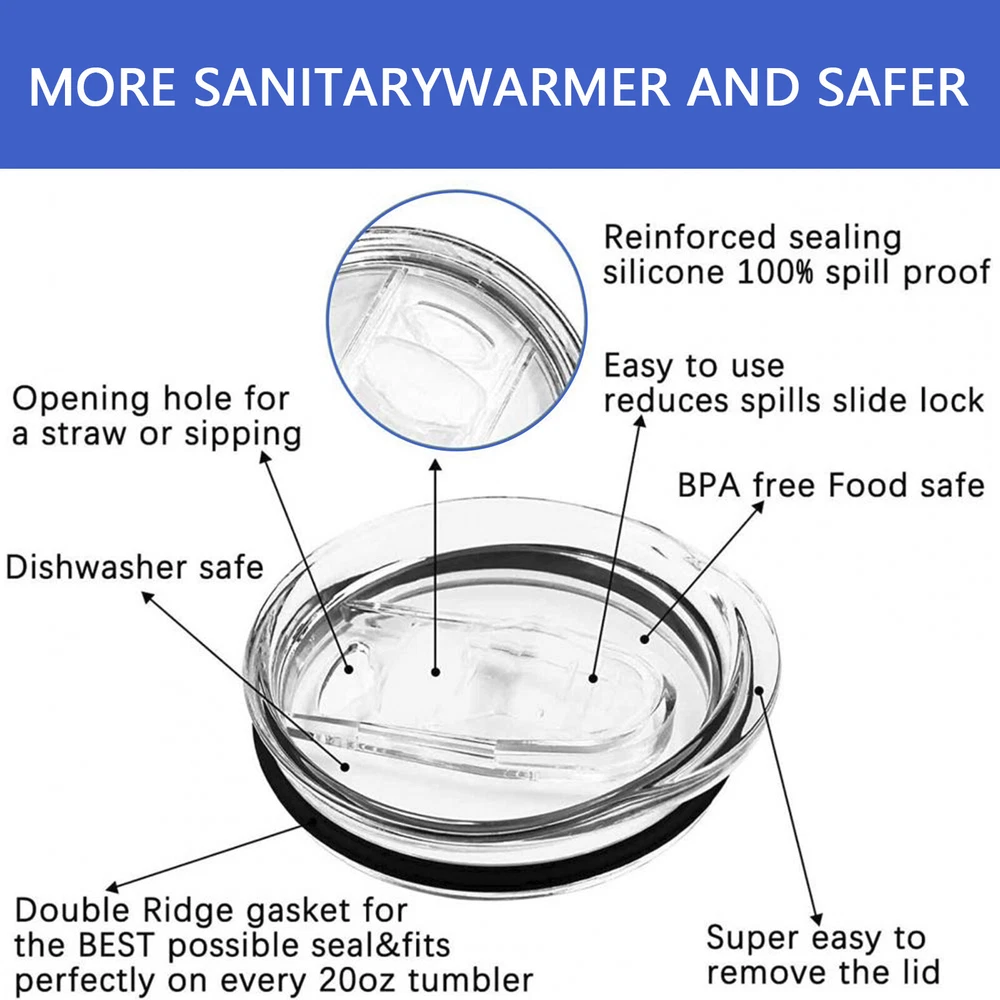 Parts List: 6×Skinny Tumbler Lid Highlight description: [Safe Plastic Material] The tumbler cover is made of premium plastic material, which is lightweight and has high transparency, BPA free. The cup lid is safe and reliable to use, dishwasher safe. [6 Pieces Tumbler Lids Set] The package includes 6 clear tumbler lids. Each size is about 7.54x7.19x1.7cm, inner diameter about 6.86cm/2.7inch. Note: This product is suitable for 20oz skinny stainless steel tumblers. Please confirm the size carefully when purchasing. [Spill Proof and Splash Resistant] This cup lid has a good seal, which can effectively isolate the contact between air and beverage. It is spill proof and splash resistant, prevent the liquid inside from spilling. [Easy to Use and Carry] The lid features a sliding button that slides easily to close or open with one hand. It is also easy to carry, meeting daily use and replacement. [Dust-Proof Tumbler Lids] The lid can cover the cup to prevent dust from entering and enjoy delicious beverage. It is practical and can be applied to multiple life scenes. Detailed description: Product Name: Skinny Tumbler Lid Material: Plastic Size: about (length x width x height) 7.54x7.19x1.7cm, inner diameter about 6.86cm Fits: Suitable for 20oz Skinny Stainless Steel Tumblers Notes: 1.This product is suitable for 20oz skinny stainless steel tumblers. Please confirm the size carefully when purchasing. 2.There may be slight differences between the picture and the actual color of the commodity. We will try our best to show you the exact color. 3.Please allow slight dimension difference due to manual measurement.