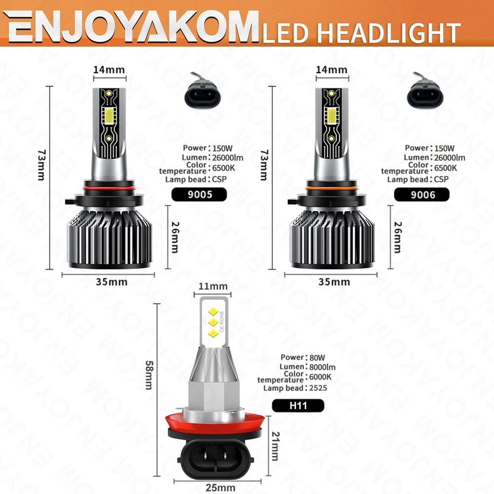 Application 2: led headlights for car &led bulb light bulbs More LED Kit We Have 1: 9005 9006 HB3 HB4 H11/H8/H9/H16 9012/HIR2 H1 H7 Interchange Part Number: 9005 High beam + 9006 Low beam + H11 Fog light Fit 1: Car, Motorcycle, Motorbike, van, truck, pickup, SUV, vehicles Lighting Technology: LED Size: the same as the car original light Light Color: Cold White Universal Fitment: Yes Application 1: For Headlight High Low Beam/led bulbs car headlights Voltage: 9V-36V Other Available Type: Foglight Kit Model: LED Headlight Conversion Kit Wattage: 150W MPN: ENJOYAKOM-Headlamp Bulb Superseded Part Number: Replacement Halogen Xenon Led Light Bulbs Suitable For: High Beam, Headlight, Low Beam, Fog Light OE/OEM Part Number: 6500K LED Headlights Fitment Type: Direct Replacement Performance Part: Yes Lighting Type: Specialty Head Light Bulb Sealed Housing: IP68, Shockproof, Dustproof & Waterproof Manufacturer Warranty: 5 Year Chips Type: CSP LED Chips, Super Bright More LED Kit We Have 2: H4/9003/HB2 9004/HB1 9007/HB5 9008/H13 D1/D1S D2/D2S D3S D4S More LED Kit We Have 3: 9005/9145/H10/9140 5202/2504 880/892/893/899 881/898/889/894 H3 To Fit: Headlight Features: CAN bus Compatible, road Legal, Rust-Resistant Country/Region of Manufacture: United States EAN: Does not apply Other Part Number: HB3 high beam + HB4 low beam + H11 Fog light UPC: 868715803510 Number of Bulbs: 6 Brand: ENJOYAKOM Bulb Life Hours: Up to 50000 Hours Material: Aviation 6063 aluminum profile gtin13: Does not apply Manufacturer Part Number: 9005+9006+H11 Ballast Included: Yes Type: Headlight Kit Vintage Part: Yes Fit 2: Easy Installation, Heat Resistant, Higher brightness/Super Bright White Placement on Vehicle: Front, Left, Right Color Temperature: 6500K Feature 2: light bulbs & leds/Light Bulbs Combo Kit Bulb Fitment Code: 9005/HB3 + 9006/HB4+H11/H9/H8/H16 Lumens: 26000lm