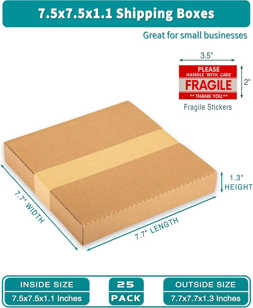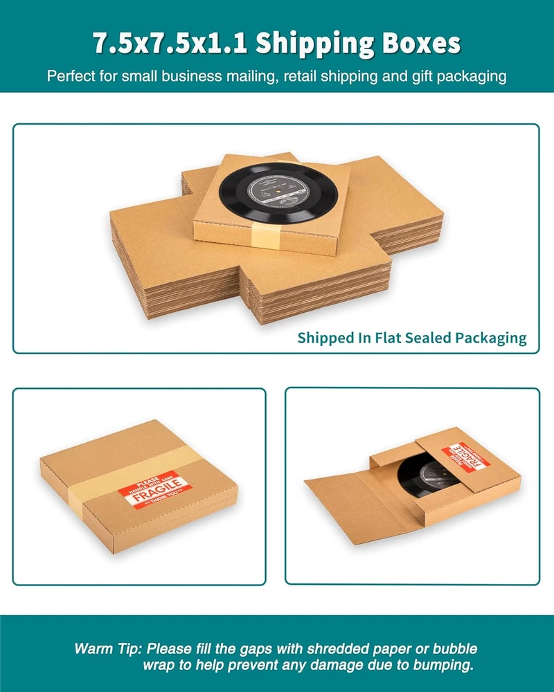 Store New Arrivals Add to Favorite View Feedback Contact 7" 45 RPM Vinyl Record Mailers - 7.5"L X 7.5"W X 1.1"H Kraft Corrugated Album Mailing Boxes for Small Business Packaging Shipping Moving Storage - W/Fragile Stickers, 25 Pack Description Item Package Quantity 1 Batteries Required? No Size 25 Pack Color Brown Product Dimensions 7.68"L x 7.68"W x 1.3"H Material Cardboard Number of Boxes 1 Item Weight 3.52 pounds Shape Square Batteries Included? No Breaking Strength 65 Pounds Widely Used: 7.5x7.5x1.1 inch cardboard boxes are perfect packaging for mailing, moving, storing and organizing 7" 45 RPM vinyl records, books, photo albums, pictures framed and other flat items Premium Material: 7.5x7.5x1.1 inch mailing boxes are made of single-wall corrugated material for lightweight and reusable strength. Each 7.5x7.5x1.1 inch mailer box has a 32-ECT-B crush rating and is recyclable Easy Fold: 2 pre-punched sizes, 7.5x7.5x1.1 inch or 7.5x7.5x0.55 inch. Multi-depth 7.5x7.5 inch shipping boxes can be assembled in seconds and sealed with tape (sold separately) to package your items quickly. The finished product is clean, sturdy and professional Simple Packaging: 7.5x7.5x1.1 inch mailing boxes are shipped in flat shrink-wrap sealed packaging to save storage space and stay dry to keep them sturdy Flat Shipping Box: 7.5x7.5x1.1 packaging boxes come in packs of 25 and each flat packaging box holds 1-8 7-inch records. Note: It is very thin and we recommend extra protection for your items when shipping vinyl records Product Description Widely Used: 7.5x7.5x1.1 inch cardboard boxes are perfect packaging for mailing, moving, storing and organizing 7" 45 RPM vinyl records, books, photo albums, pictures framed and other flat items ABOUT US We offer the best prices around on high quality products. Our E-store includes media such as books, movies, music and games while offering electronics, toys, sporting apparel, clothing, tools, general home, garden items and more. SHIPPING We are always working hard to ensure your package arrives as soon as possible. Please understand that some factors like weather, high postal traffic, and the performance of shipping companies are outside of our control. We offer free shipping to the lower 48 states and ship within 2 business days of payment, usually sooner. We do not accept P.O. Boxes. Please provide a physical address. For shipping outside of the continental USA, we only use eBay's Global Shipping Program.The item is shipped to KY and then sent to the rest of the world. International customers are responsible for all duties and taxes. Continue to check out in order to calculate costs for shipping the item to your country. Messages regarding eBay's Global Shipping Program MUST be directed at eBay EXCLUSIVELY. RETURNS We offer a 30-Day Return Policy on items which you are not completely satisfied with. You have the option for a full-refund or an exchange of the item. No returns are available on items shipped outside of the USA. PAYMENT We accept PayPal. CONTACT US This page content is yet to come Please ad us to your favorite seller and visit again later Thank You CUSTOMER SATISFACTION We try our very best to make sure every customer is completely satisfied. If there's a problem, message us! We're happy to help. WE ACCEPT Copyright © 2021 AutoDS. | All Rights Reserved