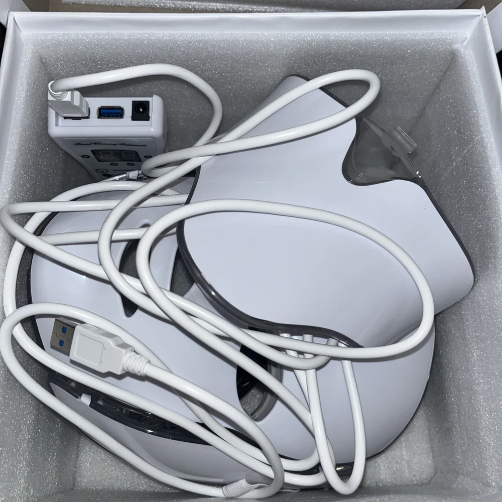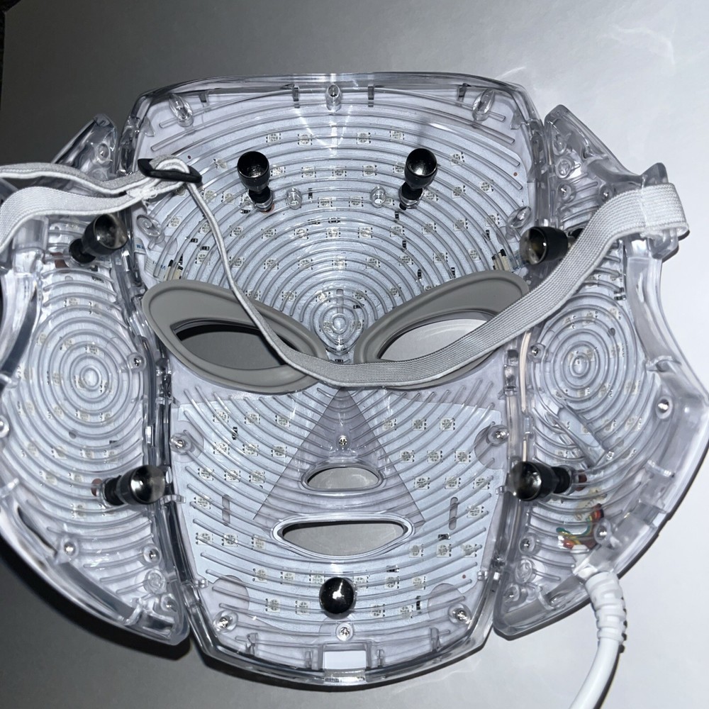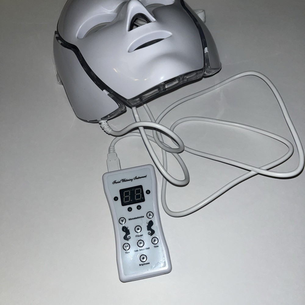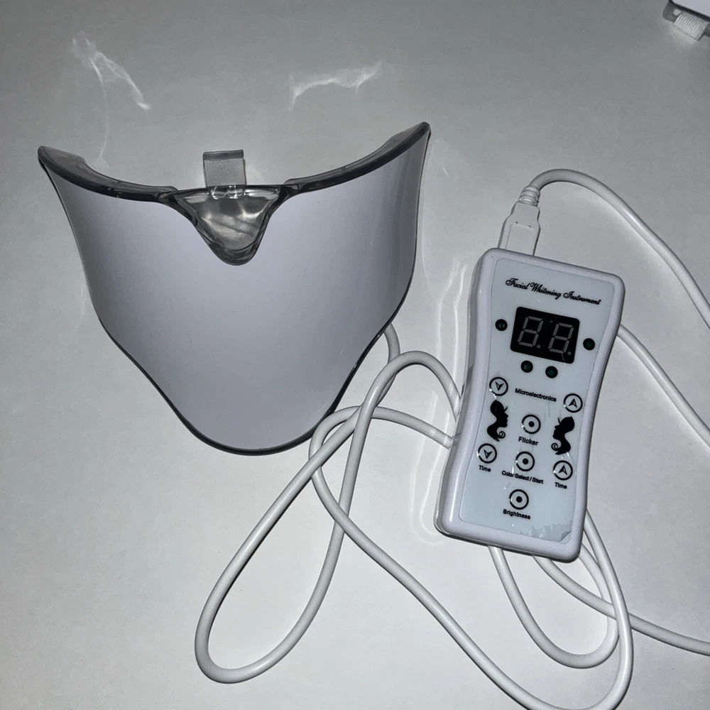 LED acne, anti-aging, skin clearing mask. Opened it and never got around to using it. This LED Light Photon Face Neck Mask offers 7 colors for rejuvenation, targeting early signs of aging, hydration, acne, and more. Suitable for all skin types, it helps improve skin brightness, tighten and firm the skin, and promote absorption. The set includes LED Light Therapy for at-home or salon use, with an operating voltage of 110V-220V. Perfect as a Christmas gift for women.