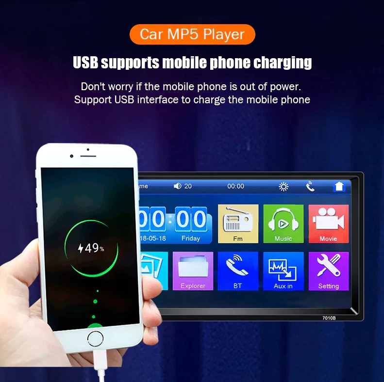 eBay 7" Double 2 DIN Car MP5 Player Bluetooth Touch Screen Stereo Radio With Camera đ” ă7 Inches Touch Screenă Equipped with 7-inch 1080P Digital Multi-color TFT Touch Screen offers a convenient way to operate when you use it. Support 1080P video. Has ALL the features. đ» ăHD Rear View Camera AV-IN Input Functionă When the car is in the reverse gear, it automatically switches to the rear view camera mode, easily and quickly to park your car in the right place. Comes with Rear View Camera for easy install. đ ăHands-Free Callingă Supports playing wireless stereo music and apps like wirelessly via BT technology. Built-in high sensitive microphone provides you crystal clear sound detail of hands-free calls via BT to ensure driving safety. đ„ ăMultiple Interfaces ăSupports AUX-IN/TF Card (UP to 256G, Not Included)/U Disk (Up to 64G, Not Included) playback and AUX playback. Also supports mobile phone charging through USB 2.0 interface (5V Output). đ± ă100% SATISFACTORY SERVICEă All of our products are subject to strict quality control. If there are quality problems or you are not satisfied with the products, please contact us. We offer you the best solution. Specifications: ColorïŒBlack Material: ABS Screen Size: 7 Inch 16:9 TFT Touch Screen Screen Resolution: 1080P Interface: AUX-IN, USB 2.0 and TF Slot BT: BT for Music Playing and Hands-free Call Video Formats (1080P): RM/RMVB/FLV/3GP/MPEG/AVI/MOV/VOB/DAT/DVIX/XVRID, etc. Audio Formats: MP3/WMA /WMV/OGG/FLAC/AAC/APE, etc. Multiple EQ Scenario Mode Choice: Normal/Classic/Pop/Rock/Jazz, etc. Picture Formats: JPG/BMP/PNG, etc. Frequency Response: 20-20KHz Tone Control: Bass+/-7dB (100Hz), Treble+/-7dB (100Hz) SNR: 65dB FM Frequency: 87.5-108.0MHz (18 Stations Preset) FM Sensitivity: 25dB FM Selectivity: 60dB FM Separation: 35dB Amplifier Maximum Output Power: 4 * 45W(FR/FL/RR/RL 4-channel Audio Output) Loudspeaker Impedance: 4Ω-8Ω Input Voltage: DC 12V Weight: 513g / 18.1oz OSD Languages: English, Simple Chinese, Traditional Chinese, Spanish, French, German, Italian, Portuguese, Japanese and Russian Remote Control: Yes Dimensions: 8.28â * 5.90â * 4.72â (L * W * H) Features Upgraded Version: Fully compatible for all cars. Mirror Link: Support Android Phone Mirror Link, through phone's original USB line Can synchronized to the on-board screen, realize two-way control. Built-in: Bluetooth with A2DP/Hands free calls/Play music/Phonebooks download. Rear view camera: Support rear view camera input, you can see the video on MP5 screen through the rear view camera when reversing your car. Steering wheel control: Quickly switch functions which you want with your car's steering wheel. High Resolution: 1080P Full HD 7" inch LCD Touch screen give you a fantastic experience to watch HD video. Support video playback format of AVI/MP4/FLV/PMP/RM/RMVB/MPG. All new processing chipset (CPU), faster reaction, more stable performance, more powerful functions. Fashion design, knob volume adjustment. Colorful backlight settings, you can select your favorite color in the setup menu decorate your car with matches. Variety of sound adjustment (SEL): electronic volume, treble, bass, left and right balance, front and rear sound field. Hardware electronic sound (EQ) processing, a variety of audio modes, high and low tone can be adjusted. Full electronic digital radio search, high-performance digital tuning FM radio automatic scanning, 18 radio storage. Latest Support: folder playback, classified storage, free broadcast, display list. Supports shuffle, repeat all, repeat single, repeat directory. AUX audio input interface can be an external MP3, mobile phones, music players and other audio input. USB support for high current output, for mobile phone charging HD Touch Screen Equipped with 7-inch 1080P Digital Multi-color TFT Touch Screen offers a convenient way to operate when you use it. Support 1080P video. Has ALL the features. HD Rear View Camera When the car is in the reverse gear, it automatically switches to the rear view camera mode, easily and quickly to park your car in the right place. Comes with Rear View Camera for easy install. Hands Free Calling Supports playing wireless stereo music and apps like wirelessly via BT technology. Built-in high sensitive microphone provides you crystal clear sound detail of hands-free calls via BT to ensure driving safety. Multiple Interfaces Supports AUX-IN/TF Card (UP to 256G, Not Included)/U Disk (Up to 64G, Not Included) playback and AUX playback. Also supports mobile phone charging through USB 2.0 interface (5V Output). Package includes: 1 x 7" Double 2 DIN Car MP5 Player Bluetooth Touch Screen Stereo Radio With Camera Shipping Information: Your item Ships Same Day to 1 Business Day from our California Location.