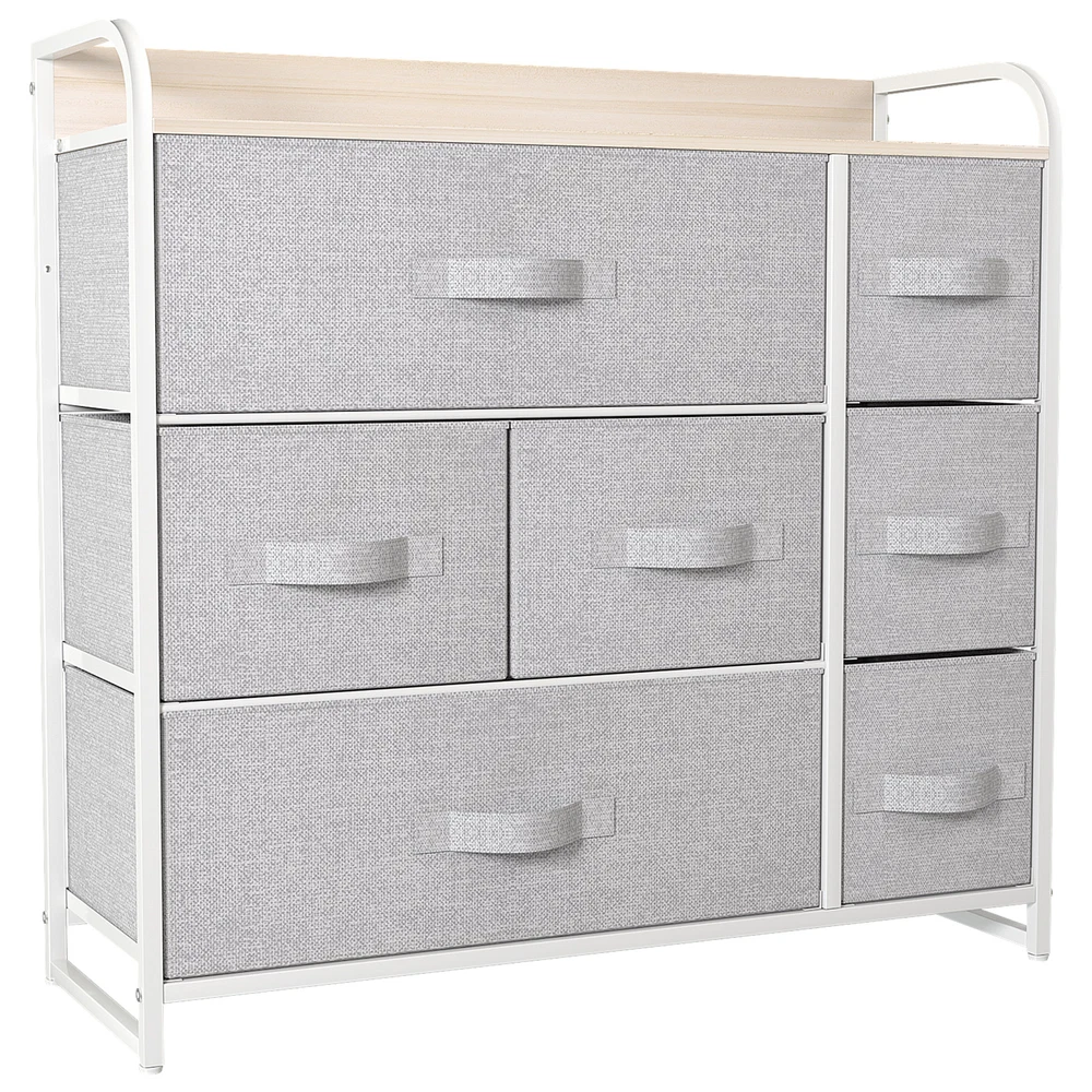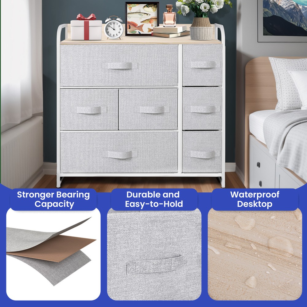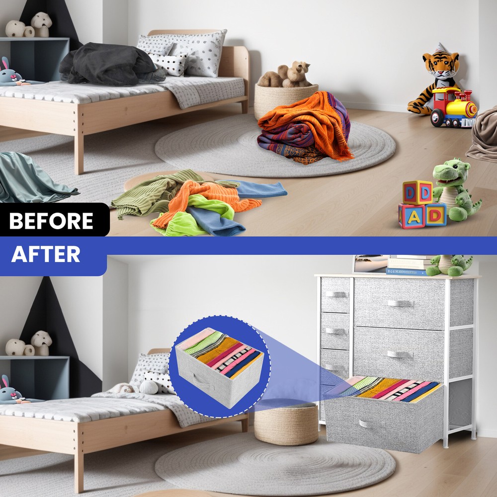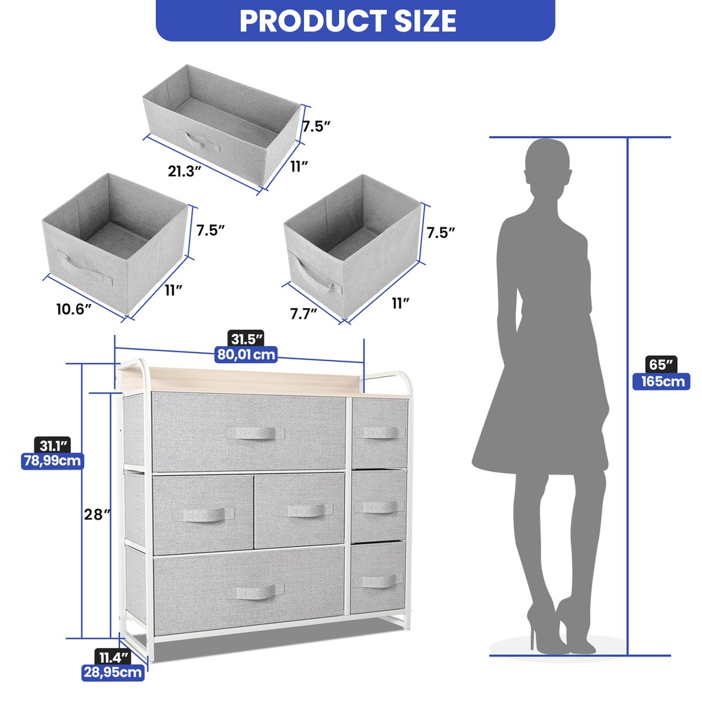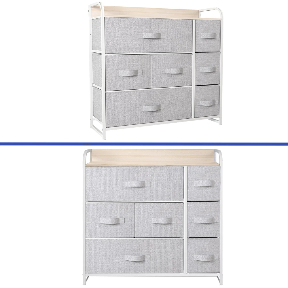 7 Drawers Chest Dresser Gray Tall Tower 31" Fabric Organizer Storage Cabinet Product Description NOTE: Professional Installation would be Highly Recommended. Description: 1. Color: Light Gray 2. Material: Medium-density fiberboard (MDF), Fabric, Metal and Plastic 3. Frame Material: Metal 4. Room Type: Bedroom and Living Room 5. Main Features: Waterproof, Abrasion Resistance, Adjustable Legs Features: ROBUST CONSTRUCTION: - Built with a sturdy metal frame and a durable MDF wooden top for long-lasting use. - Includes seven removable and foldable drawers, each with fabric handles for easy access. - Designed with four adjustable plastic legs to protect floors from scratches and provide stability. DURABLE FABRIC: - Made from premium breathable non-woven synthetic fabric on both the interior and exterior for durability. - Easy maintenance with a simple wipe using a damp cloth, followed by air drying. EASY ASSEMBLY: - Hassle-free installation with detailed instructions and an installation manual book. - All necessary pieces and accessories are included; assembly requires fastening screws. FLEXIBLE COLOR PALETTE: - Contemporary aesthetic featuring light grey fabric drawers, a robust white metal frame, and a waterproof 15 mm wooden tabletop. - Versatile for use in diverse areas including living rooms, bedrooms, hallways, entryways, closets, and nurseries. LARGE STORAGE CAPACITY: - Seven drawers of different sizes for ample storage space and easy organization. - Overall dimensions: 31.5" L x 11.4" W x 31.1" H. - Drawer dimensions: 21.3" L x 11" W x 7.5" H, 10.6" L x 11" W x 7.5" H, and 7.7" L x 11" W x 7.5" H. Dimensions: 1. Big Drawer Dimensions: 21.3" L x 11" W x 7.5" H 2. Medium Drawer Dimensions: 10.6" L x 11" W x 7.6" H 3. Small Drawer Dimensions: 7.7" L x 11" W x 7.5" H. Package Included: 1. Dresser Storage Chest 2. Assembling Hardware Kits 3. Instruction Manual Book Shipping 1. Normally the item will be dipatched within 1 business day if payment is cleared before 12pm PST. 2. Please verify the correct shipping address in your PayPal account before making the payment. We only dispatch the item to the address that is sent to us at the time of checkout. 3. We don't ship to Hawaii, Alaska, Puerto Rico, APO/FPO/PO Boxes. 4. We don't provide local pick-up service. 5. Normally we will use USPS, UPS, FedEx & LTL to dispatch items. Payment 1. We accept PayPal and credit card. 2. We will ship to the confirmed Paypal shipping address that is provided with the payment only. Return 1. 30 days Money Back Guarantee. 2. Please contact our customer service to receive a RMA form first if want to return the item. 3. All returned items MUST in new condition with the original package. Contact If has any problem, please contact us by sending an ebay message. Our customer service will resolve the problem as soon as possible. On Jun 10, 2025 at 05:58:35 PDT, seller added the following information: