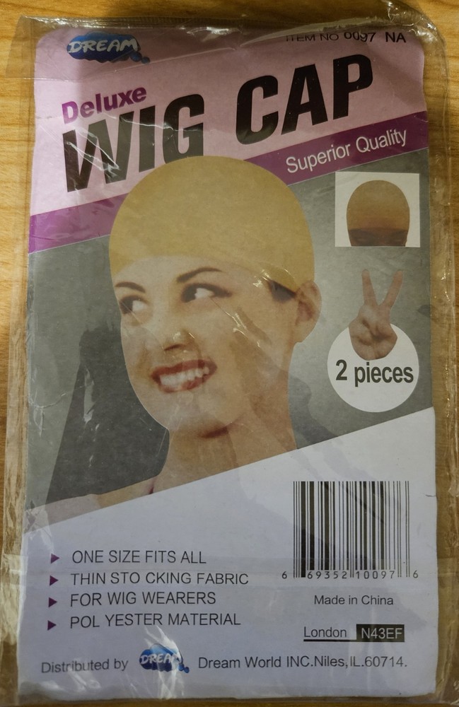7 Dream Deluxe Wig Cap, 2 Count, London N43EF, Bundle. This bundle includes 7 packages of London N43EF, item# 0097, 2 count wig caps. The wig caps are one size, thin stocking fabric, and polyester material.