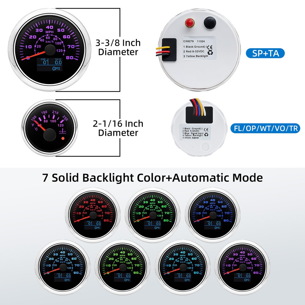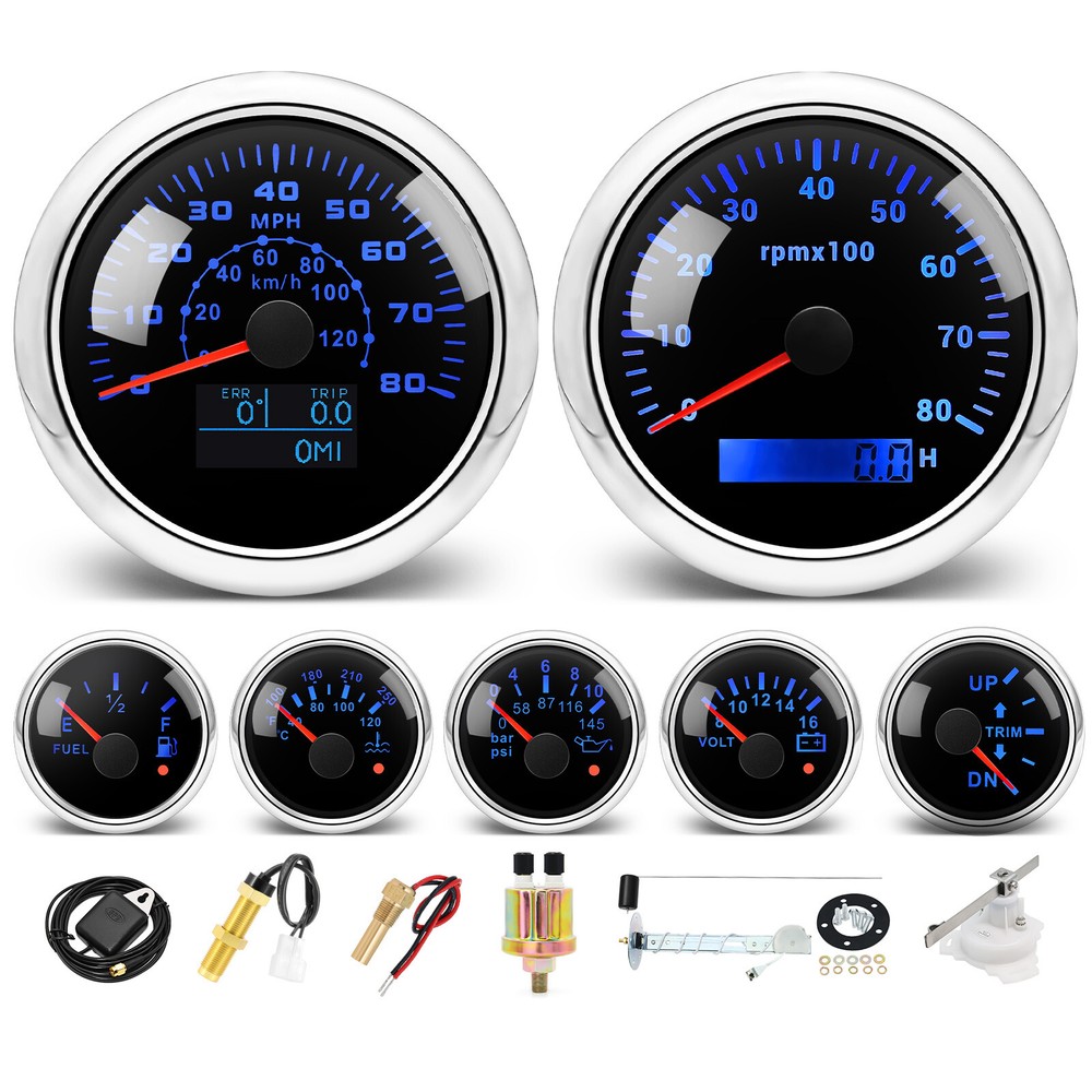 7 Gauge Set with Senders 85mm GPS Speedometer 80MPH/120km/h Tacho Fuel oil Water 7 Gauge Set with Senders 85mm GPS Speedometer 80MPH/120km/h Tacho 8000RPM & 52mm Gauge For Car Boat Feature: High-brightness LED backlight. 316 stainless steel for long-term use even in acid-base, humid environment. IP67 waterproof and dust-proof grade. With curved glass( with anti-fog function). Suitable for all kinds of vehicle modification. Using stepper motor drive pointer, accurate display of the engine speed, and with the LCD display clear display mileage. Gauges have many kinds backlight color (red,yellow,orange,green,blue,purple,white),customers can adjust any color that you like GPS Speedometer Gauge Install Diameter: Φ85mm or 3-3/8" Signal: GPS Working Voltage: 9~32V DC Indication Range: 0-80MPH 0-120Km/H Backlight:7 Colors Backlight Tachometer Install Diameter: Φ85mm or 3-3/8" Engine hours: 0.0-99999.9H Backlight :7 Color backlight Indicating Range: 0~8000 RPM Signal: Pulse Volt Gauge Sizes:52 mm (2-1/16") Measuring Range:8-16 (V) Backlight: 7 Colors Fuel Level Gauge Sizes:52 mm (2-1/16") Measuring Range:Empty - Full Resistance: 240 (E)-33 (F) ohms Backlight:7 Colors Water Temperature Gauge Install diameter: Φ52mm Indication range: 0~120℃/100-250℉ Input signal: 287.4~22.4 ohm Storage temperature: -40~+85 Backlight: 7 Colors Oil Pressure Gauge Install diameter:Φ52mm or 2-1/16" Indication range:0~10bar/0-145 PSI Operating temperature:-30~+75℃ Storage temperature:-40~+85℃ Backlight: 7 Colors Trim Gauge (Right Side) : 7 Color Backlight:Red (default)→green → blue → white →yellow→cyan →Purple →(automatic). Fixing dimension:52mm(2'') Indicating Range:UP-DN Signal:0-190ohms Working Voltage:9-32V(12V/24V) Operation mode:LCD display, stepper motor Package Includes: 1X 85MM Digital GPS Speedometer Gauge 1X GPS Antenna 1X 85MM Tachometer 1X 52MM Fuel Level gauge 1X 52MM Trim gauge 1X 52MM Voltmeter 1X 52MM Water temp gauge 1X 52MM Oil Pressure gauge 7X Installation Instruction The sending units will be included