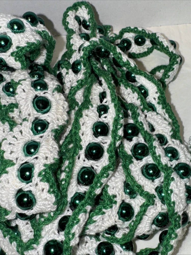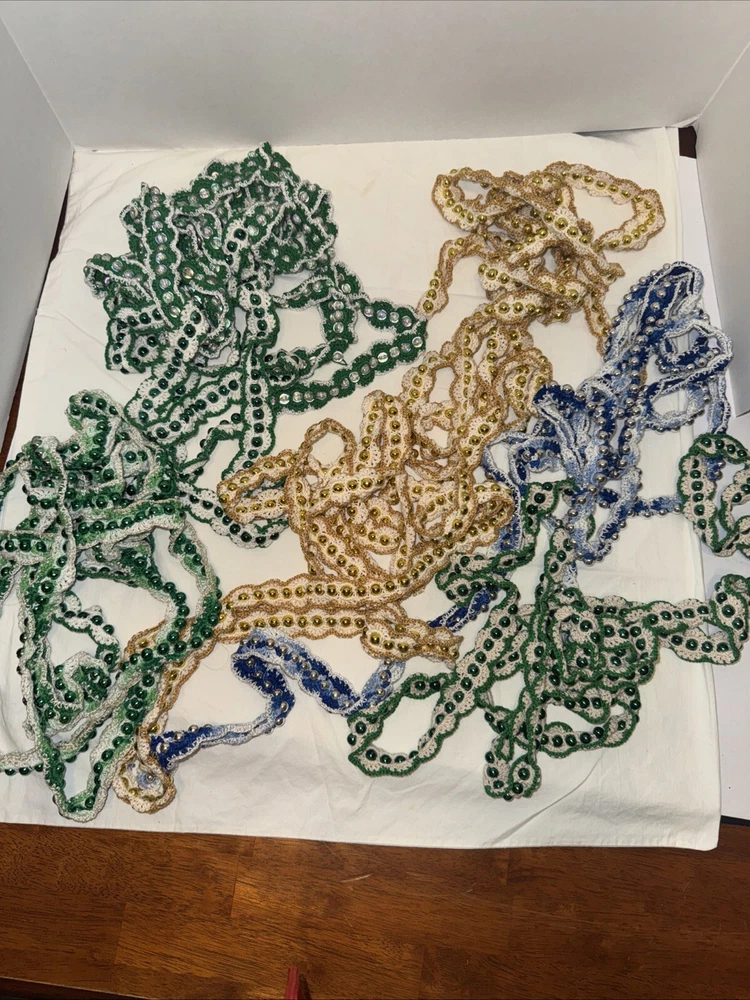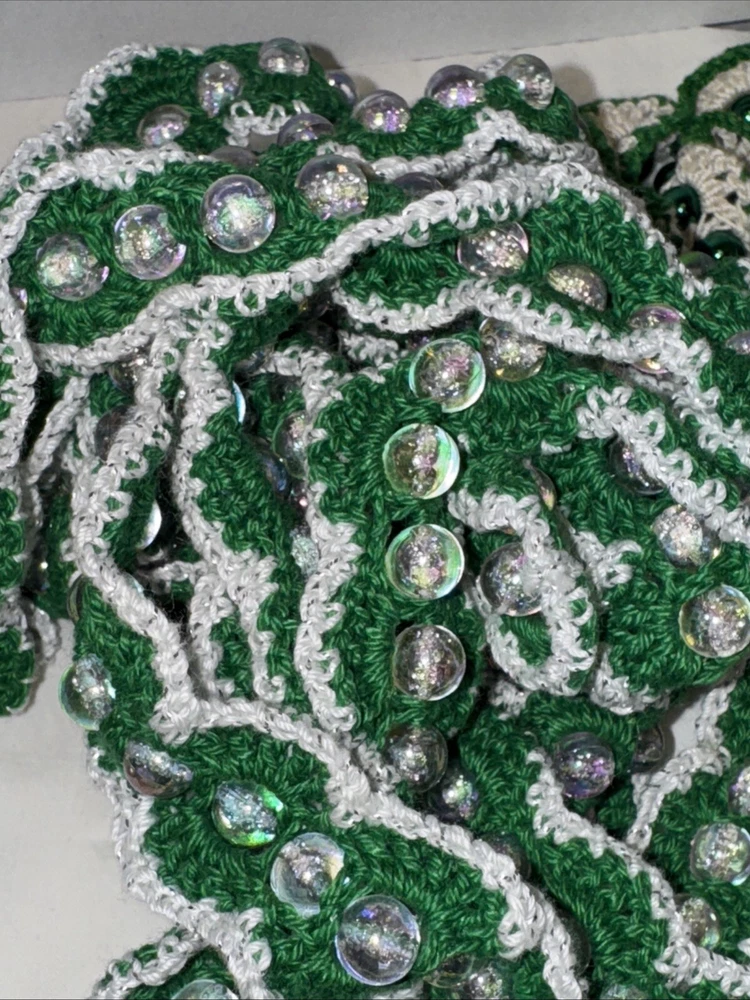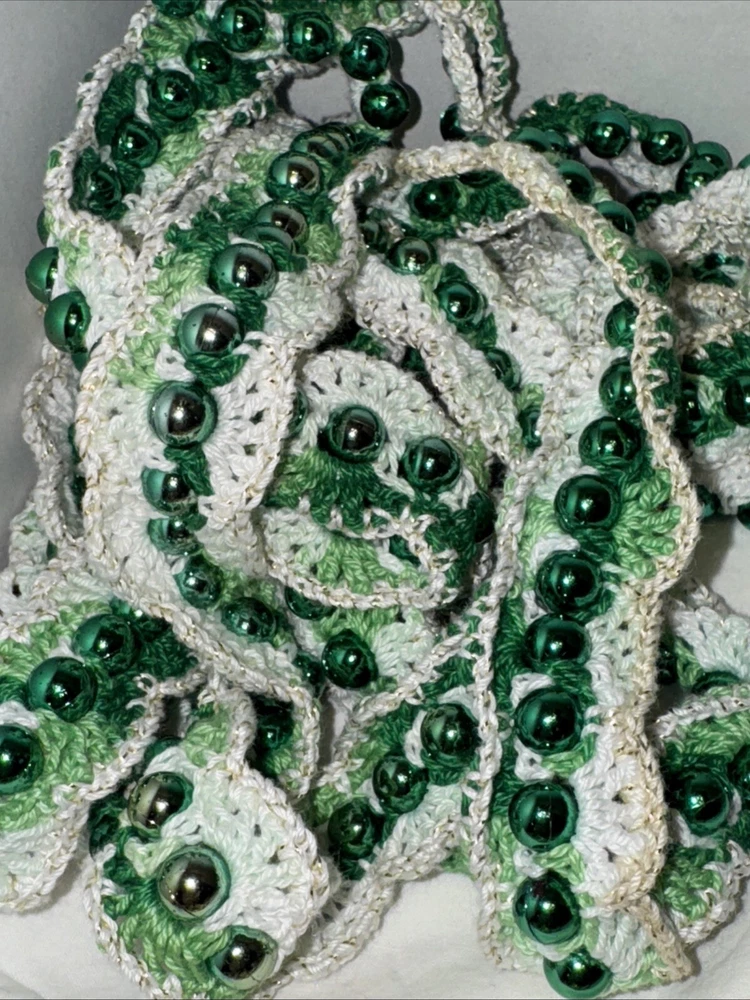 Add some festive sparkle to your Christmas decor with this vintage handmade crochet garland. The garland features shiny beads in metallic green, gold, and blue color threads, making it a perfect addition to your holiday decor. Each garland is 9 feet in length and there are 7 of them 4 green variations 2 gold with gold bread 1 blue Please feel free to contact me with any questions you have