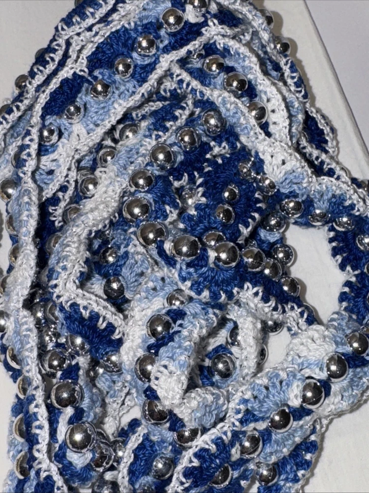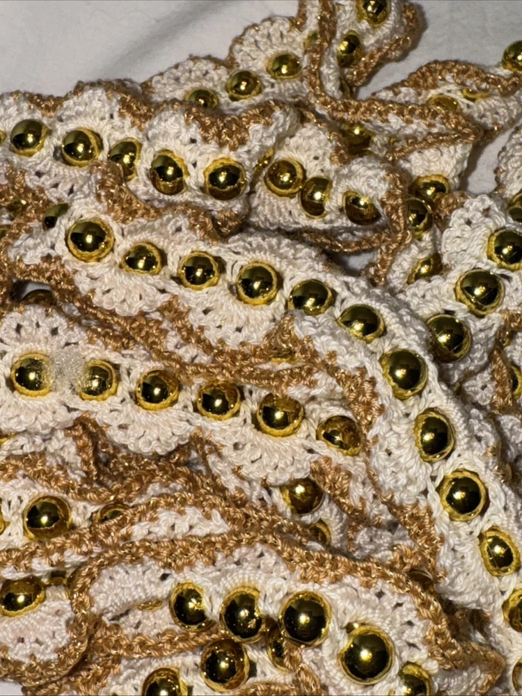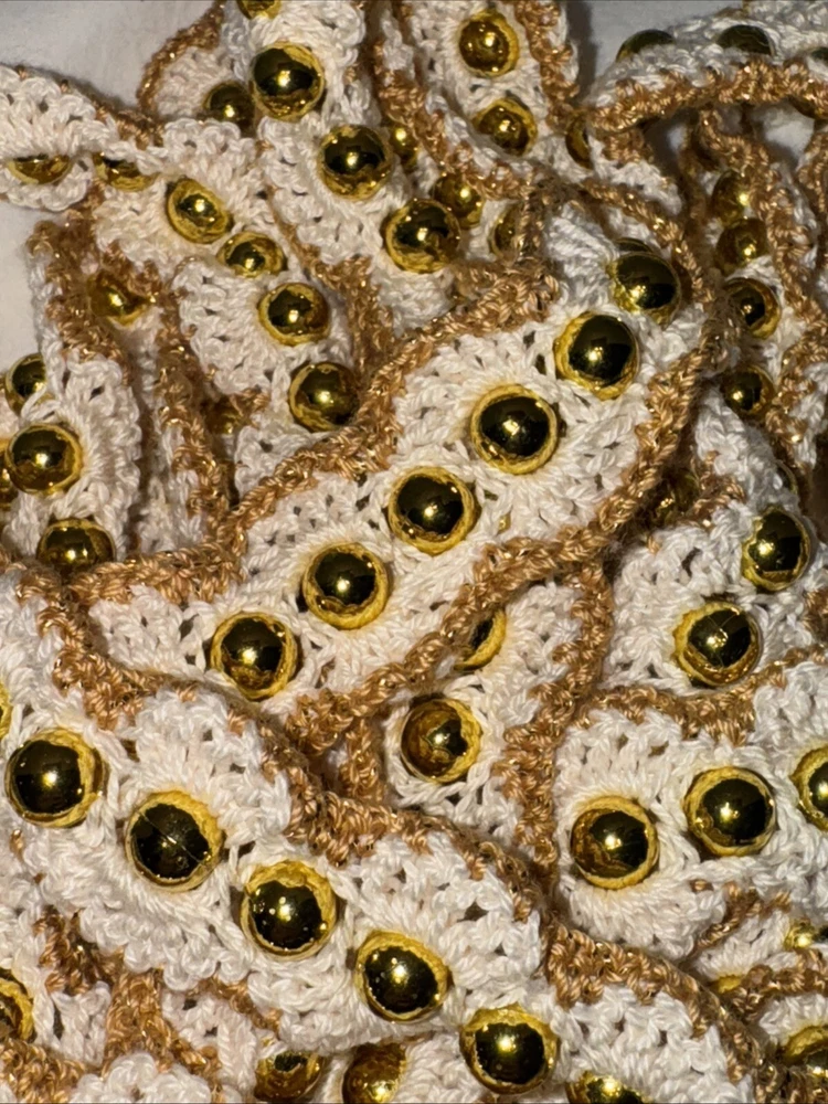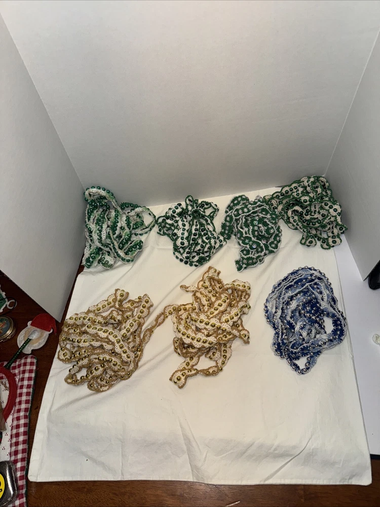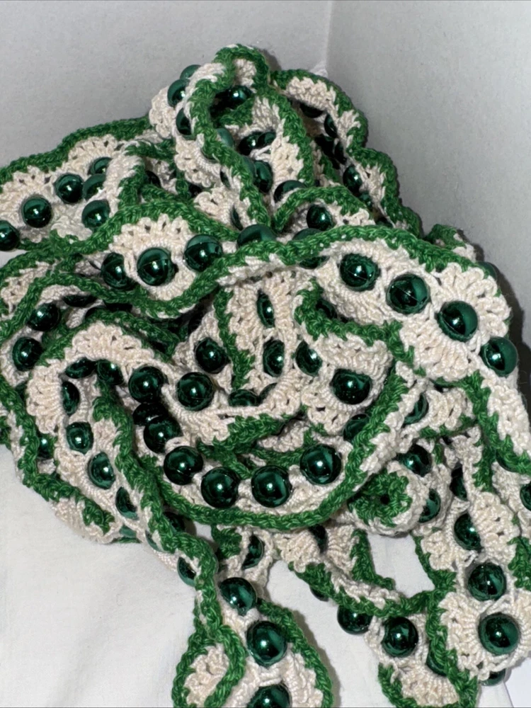 Add some festive sparkle to your Christmas decor with this vintage handmade crochet garland. The garland features shiny beads in metallic green, gold, and blue color threads, making it a perfect addition to your holiday decor. Each garland is 9 feet in length and there are 7 of them 4 green variations 2 gold with gold bread 1 blue Please feel free to contact me with any questions you have