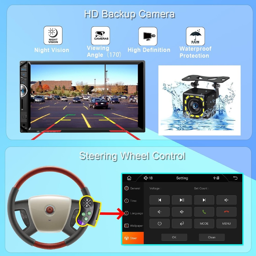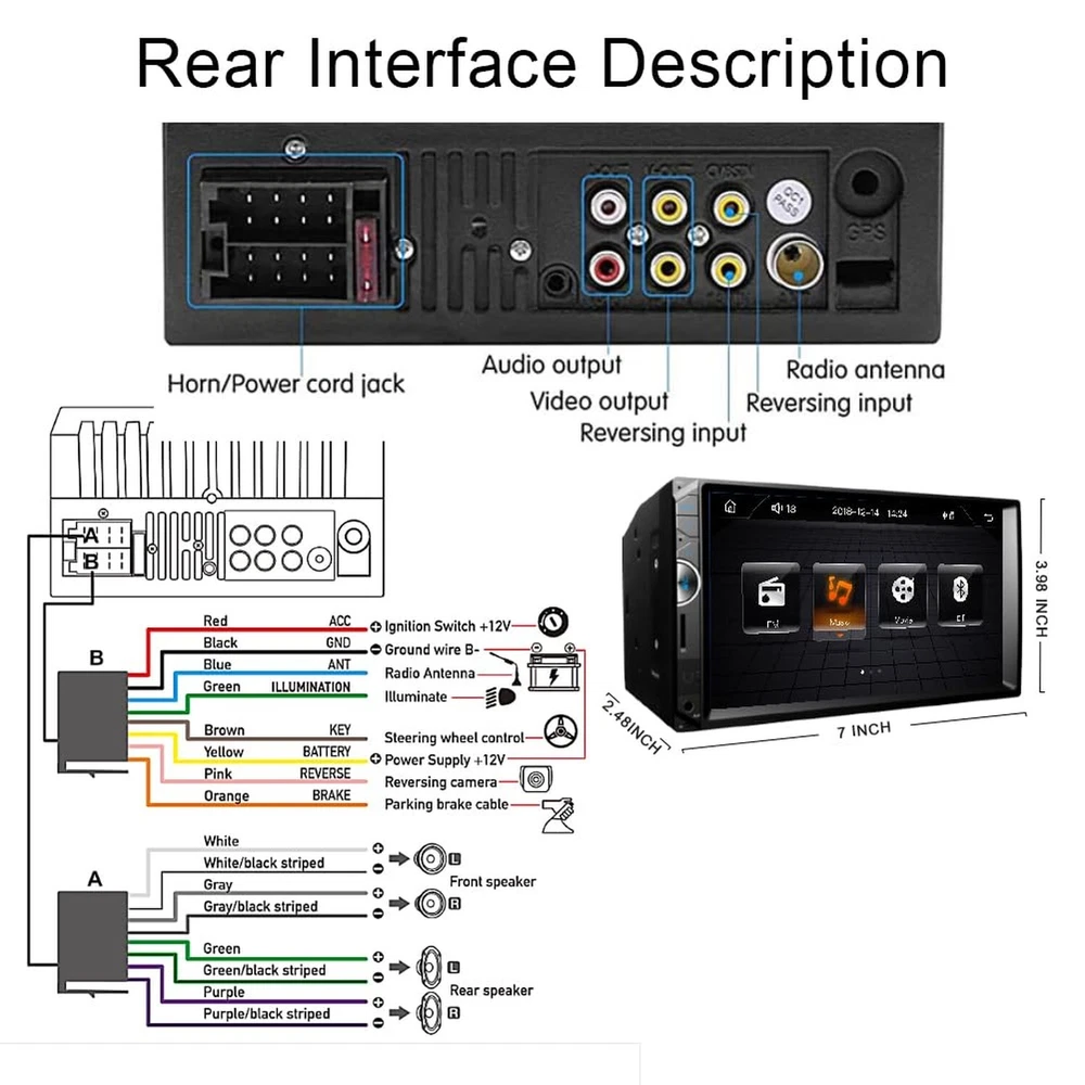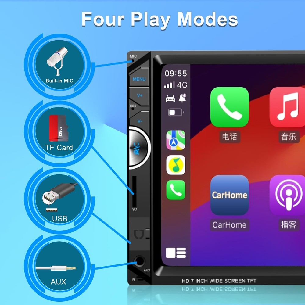 Double Din Car Stereo Apple Carplay 7 inch Car Radio with HD Touch Screen Car Receiver Compatible Android Auto Bluetooth with Backup Camera Mirror Link USB/SD/AUX Product Details Brand: Oeretzrac Connectivity Technology: Bluetooth Controller Type: iOS, Android Special Feature: 1024*600 HD Touch Screen Compatible Devices: ios, Android, Speaker Connector Type: RCA, USB 2.0 Audio Output Mode: Stereo Video encoding: RM/RMVB/AVI/MP4/MKV/3GP Color: Black Product Dimensions: 2.48"D x 7"W x 3.98"H Manufacturer: Leadfan Brand Name: Oeretzrac Model Number: 7008 Wattage: 240 watts Number of Channels: 4 Output Wattage: 45 Watts Video Encoding: RM/RMVB/AVI/MP4/MKV/3GP Output Power: 45 Watts Audio Output Type: Internal Format: WAV, WMA Wireless Technology: Bluetooth, FM Internet Applications: Pandora, SiriusXM, LINE, Waze, Spotify Control Method: Touch Connector Type: RCA, USB 2.0 Audio Output Mode: Stereo Connectivity Technology: Bluetooth Controller Type: iOS, Android Additional Features: 1024*600 HD Touch Screen Compatible Devices: ios, Android, Speaker Item Dimensions D x W x H: 2.48"D x 7"W x 3.98"H Color: Black Apple Carplay & Android Auto :Double din car stereo matching Apple car play and Android Auto, fullly HD 1204*600 touch control, making it easier to access your phone functions including music, GPS navigation, calls, notification, messages and much more, safely driving with no distractions.Support the latest version of IOS system and Android system. Car Stereo with Bluetooth : Answer/make calls in seconds by pairing it with your smartphone.Built-in microphone, hands-free calling with no distractions. No need to pick up the phone using hands for safely driving. Wireless audio stream via Bluetooth which provides a stable connectivity to your smartphone or Bluetooth device. Support power-off memory playing and LRC lyrics display. Make you enjoy a superior music listening experience! Real High-definition Screen 1024*600 :Using a 7-inch capacitive screen, compared with a resistive screen, the capacitive screen has a faster response speed, richer colors, and a wider viewing angle. Car Stereo with Backup Camera :Double din car stereo comes with a backup camera,Waterproof, 170-degree super wide-angle lens, night vision, HD display it will automatically display reverse image when in reversing mode. Provide installation tools, wires and user manual. Our car stereo comes with a 1-year warranty and provides professional technical support. If you encounter any operation or other problems, please contact us (click "Contact Seller" on your order page) Double Din Mirror Link Phone :Unlike Carplay function, Mirrorlink can mirror your phone to the radio display, and you can play movies, navigation, etc. on the display. Android phones support two-way operation, you can operate the phone interface on the radio screen. 16-segment EQ settings :Built-in infotainment, It could make vocals more articulate by boosting the treble frequency range. It could make a song sound heavier by boosting bass frequencies. Sometimes, it can be used to remove certain sounds from a recording, like the high pitched buzz of a fluorescent lighting fixture.
