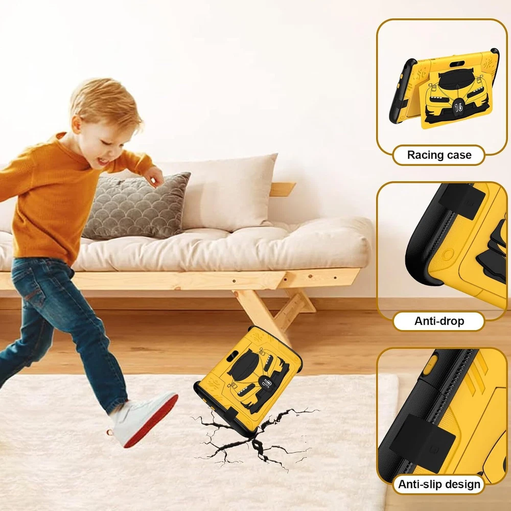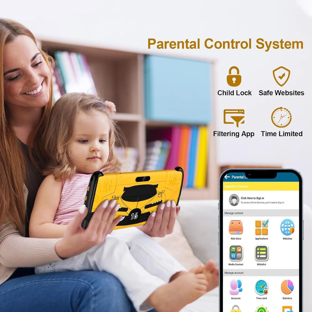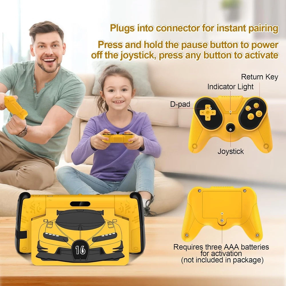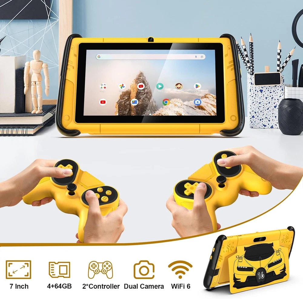 7 Inch Kids Tablet, Android 12 Tablet for Children with Game Yellow Product Details Standing screen display size: 7 Inches Screen Resolution: 1024x600 Max Screen Resolution: 1024 x 600 Pixels Processor: 1.5 GHz Card Description: Integrated Wireless Type: 802.11n Average Battery Life (in hours): 6 Hours Brand: VOLENTEX Model Name: K7 Memory Storage Capacity: 64 GB Screen Size: 7 Inches Display Resolution Maximum: 1024 x 600 Pixels 【High-performance Configuration】: The Volentex 7-inch kids tablet boasts a powerful configuration. It runs on Android 12 and features a 1.5GHz quad-core processor, coupled with 3GB of RAM and 64GB of internal storage. With expandable 512GB (microSD card not included). With a 300,000-pixel front camera and a 2 million-pixel rear camera to capture beautiful moments. Making it an ideal companion for children and igniting their learning interests, imagination, and creativity. 【Edutainment &&Eye Protection】: Kid tablets for toddlers with our pre-installed IWAWA app, children can enjoy the perfect blend of education and entertainment. Parents can also download child-specific apps from the Google Play Store. Additionally, the tablet comes with a child-friendly pre-installed video app , creating a safe online environment for joyful and productive learning. The eye protection mode can be enabled during extended tablet usage to safeguard children's eyes from harm. 【Controllers & Racing Protective Case】: The tablet for kids to enhance the user experience, offer dedicated accessories: controllers and personalized racing protective cases. These accessories not only allow children to immerse themselves in the world of gaming but also incorporate educational elements to promote learning through play. The eye-catching design of the accessories is sure to captivate children's attention. (the case is non-removable). 【Parental Control System】: Our kid tablet features a comprehensive parental control system. It allows parents to effectively manage their child's tablet usage by setting time limits and choosing suitable educational videos, games, e-books, and fun content. Parents can also set educational goals for their children and ensure that they are exposed to growth-enhancing content while filtering out any material that may hinder their development. 【Packaging&After-sales Service】: The product package includes a children's tablet, two controllers, a controller connector, an adapter, and a charging cable. If you have any questions or encounter any issues during the purchase or usage process, please do not hesitate to contact us. We are dedicated to providing excellent after-sales service and support.