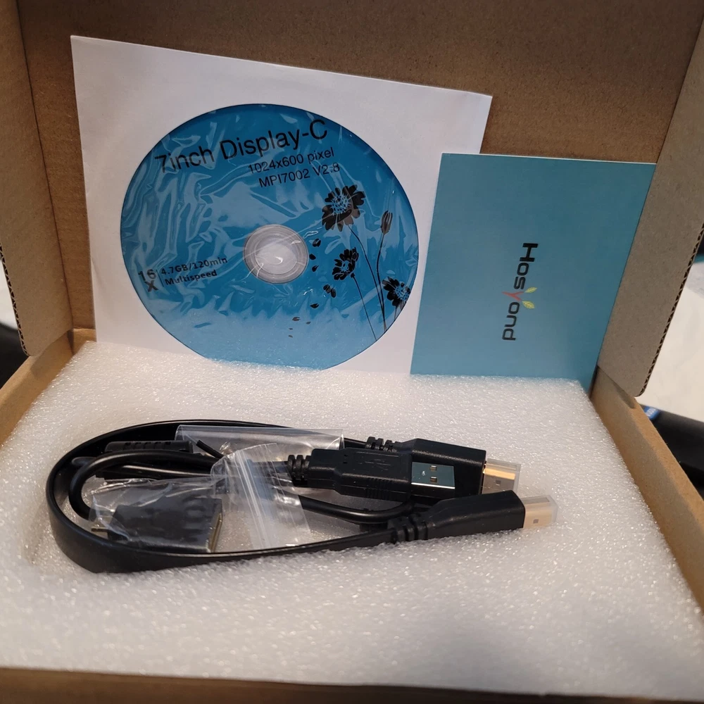 Model: HOSYOND Size: 1024 600, 800x480 pixel USB: YES Touchscreen: YES Drivers Included: Yes Cables: HDMI, USB-A TO USB-C ADAPTER MISC: 4 SCREW AND NUTS INCLUDED Condition: New with Box