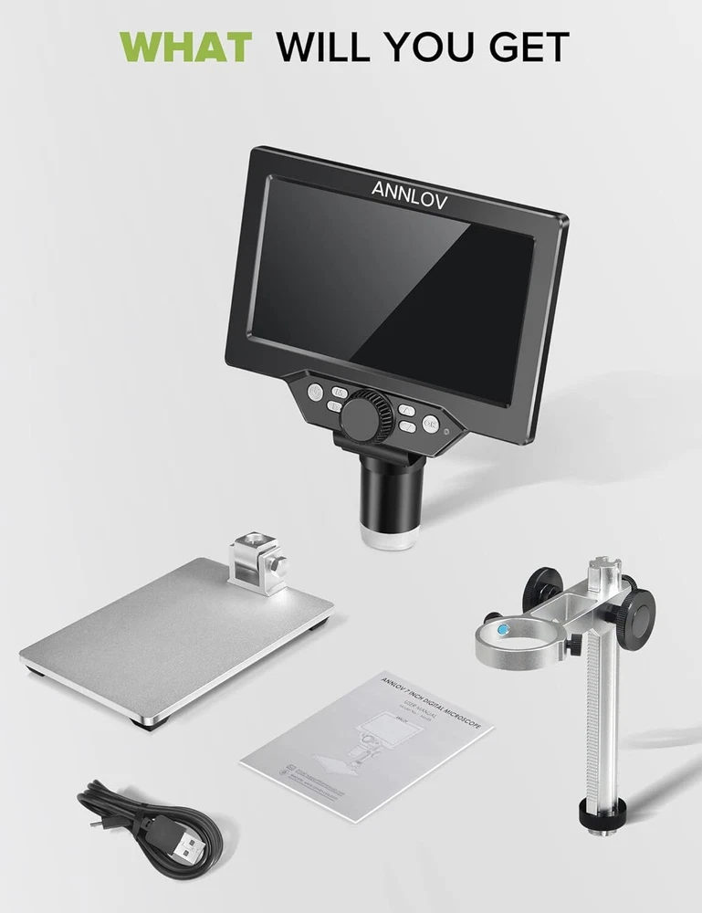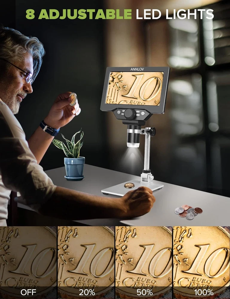7" LCD Digital Microscope ANNLOV 1200X Maginfication 1080P Coin Microscope with Metal Stand,12MP Ultra-Precise Focusing Video Camera for Kids Adults,8 LED Fill Lights Windows/Mac Compatible Product Details Light Source Type: LED Material: Metal Real Angle of View: 45 Degrees Magnification Maximum: 1200 x Voltage: 5 Volts Brand: ANNLOV Compatible Devices: Laptop Objective Lens Description: Achromatic Power Source: Battery Powered Manufacturer: ANNLOV 50-1200X digital magnification: ANNLOV 7 inch digital microscope allows you to observe objects in the range of 50-1200X. (The actual magnification depends on the screen size, the distance between the camera and the observation point) The microscope is compatible with Win10, so you can connect it to your computer to get a larger image for easy viewing and sharing. 7" LCD Screen: ANNLOV LCD digital microscope has a built-in 7" HD screen that allows you to view directly, which is larger, clearer and has higher magnification than other similar 4.3" screen microscopes. Great for viewing errors in coins, leaf textures, skin textures, fine parts in watches, soldering circuit boards, and more. Easy to focus: Adjust the object to be close to the lens (2cm-10cm), then you can get a clear image by slowly rotating the focus wheel, also you can press the up or down button to resize the image between 1-4X , which is helpful for observing details. Adjustable Stand and Solid Metal and Base: The metal material is stronger, more stable, and more durable than other plastic versions, minimizing shock and keeping your sample in sharp focus, you'll have a more stable and accurate view of your object. At the same time, you can adjust the stand as needed to find the best viewing angle and avoid eye and neck strain. Enhanced Image Quality: Beyond a mere microscope, the ANNLOV Coin Microscope enables real-time image capture and video recording without any delay. After inserting a memory card, you can capture stunning 12MP (4023*3024) photos, record 1080p Full HD (1920*1080) video at 30fps. Ideal for preserving and sharing precious moments with unparalleled clarity.