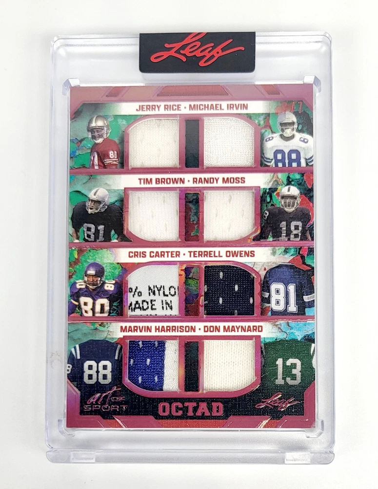 This rare and highly sought-after sports trading card features some of the greatest names in NFL football, including Jerry Rice, Michael Irvin, Cris Carter, Tim Brown, Randy Moss, Don Maynard, Terrell Owens, and Marvin Harrison. The card is a limited edition 2023 Leaf Art of Sport set with a print run of only 7, and is a red spectrum holofoil parallel/variety. Game Used jersey patches!! In addition to the exclusive and highly sought-after design, this card also features memorabilia from some of the featured players, including the New York Jets, San Francisco 49ers, Minnesota Vikings, Dallas Cowboys, Philadelphia Eagles, and Indianapolis Colts. With its short print, serial numbering, and other unique features, this card is a must-have for any serious football card collector.