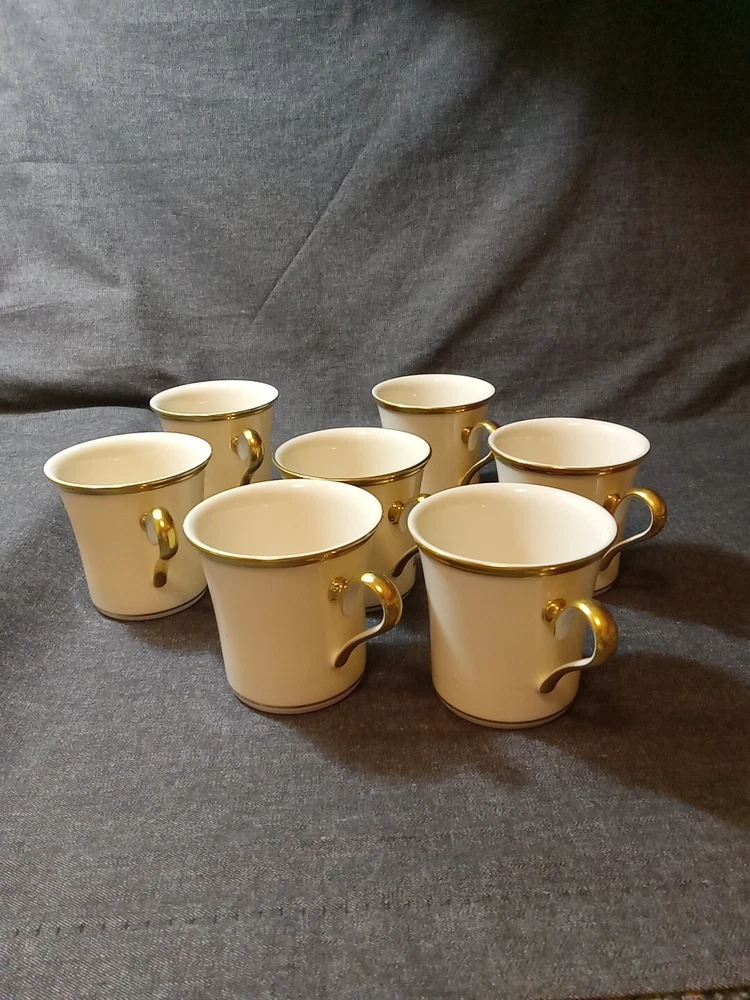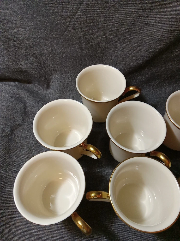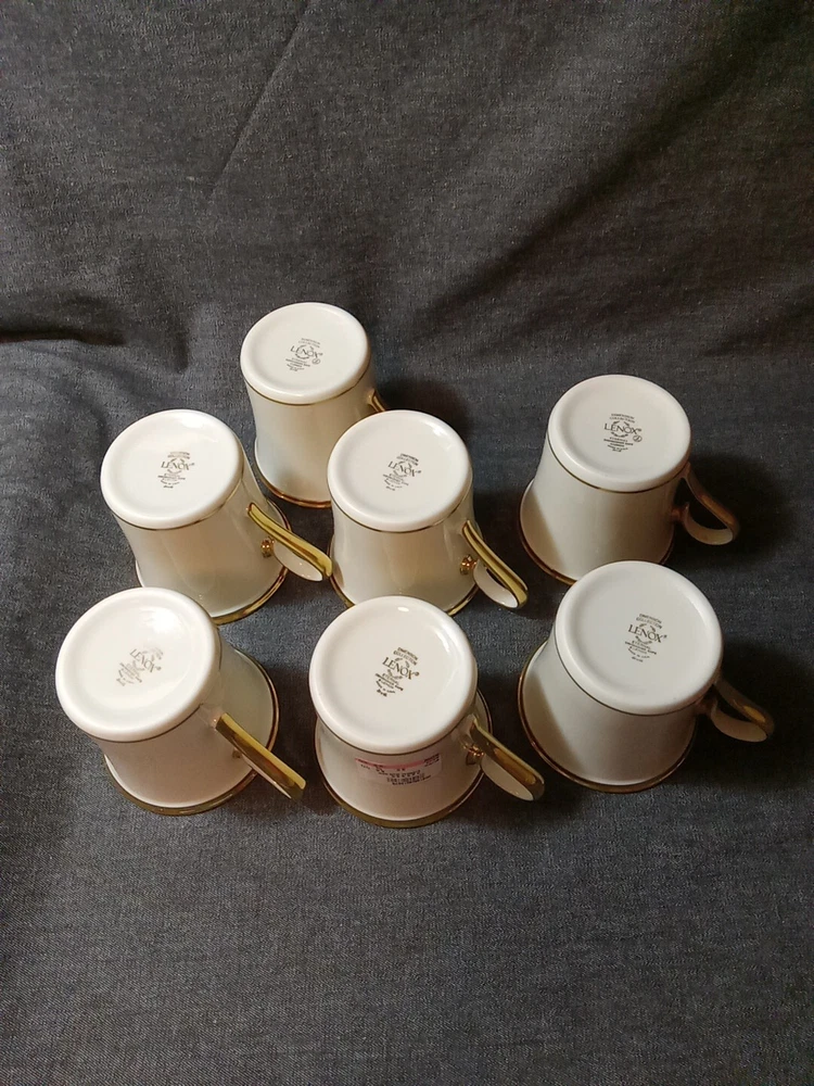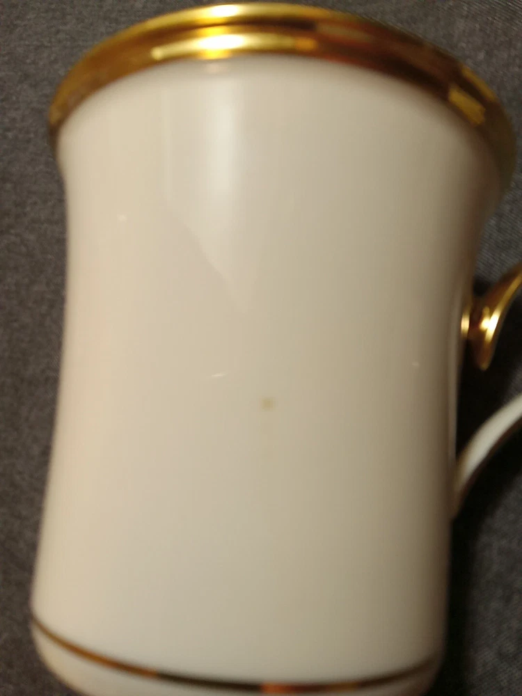 Very clean. No chips, cracks, scratches, crazing. Very little sign of usage. One mug has the original price sticker of $23. They are factory second. One mug has a light dot shown in the third photo from the last. One has light paint smear on the bottom shown in the second from the last photo. All the gold trims are clear, not worn off. It measures 3 1/2 by 3 1/2.