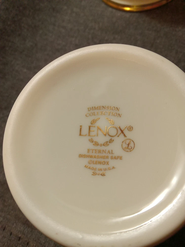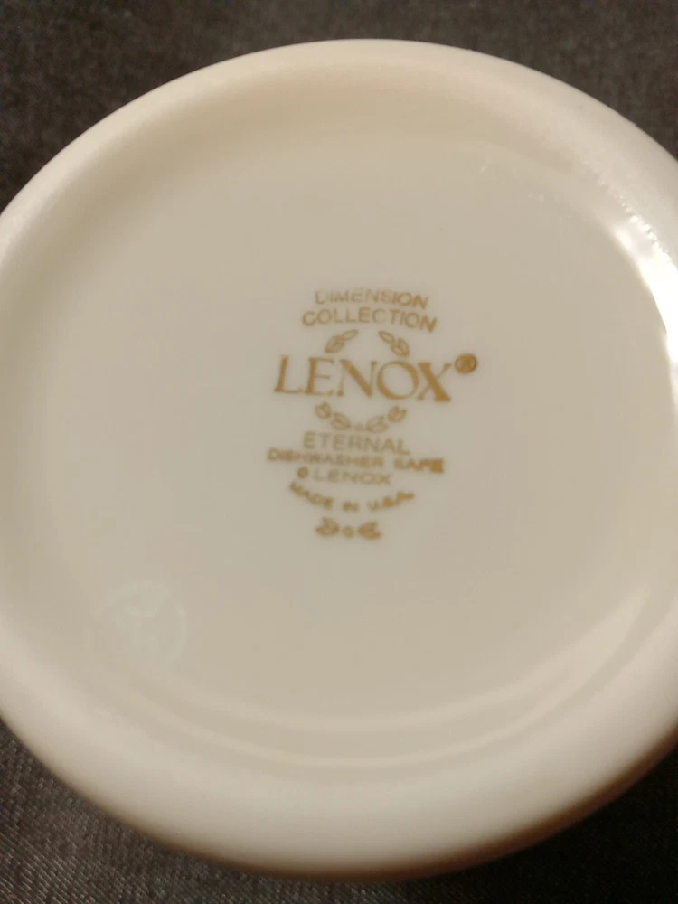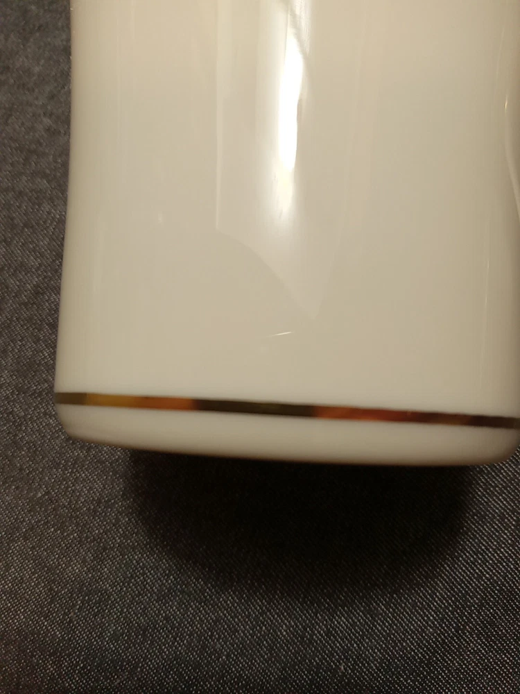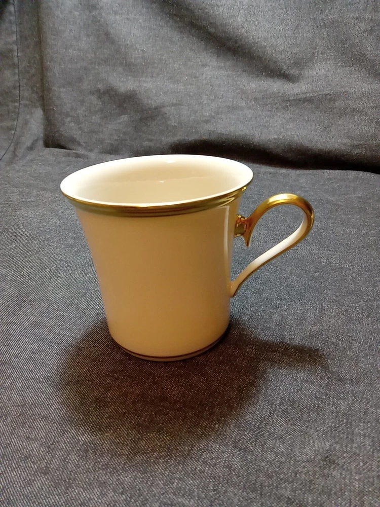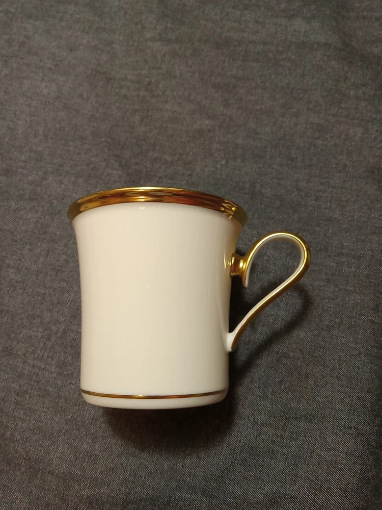 Very clean. No chips, cracks, scratches, crazing. Very little sign of usage. One mug has the original price sticker of $23. They are factory second. One mug has a light dot shown in the third photo from the last. One has light paint smear on the bottom shown in the second from the last photo. All the gold trims are clear, not worn off. It measures 3 1/2 by 3 1/2.