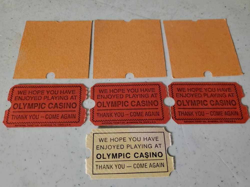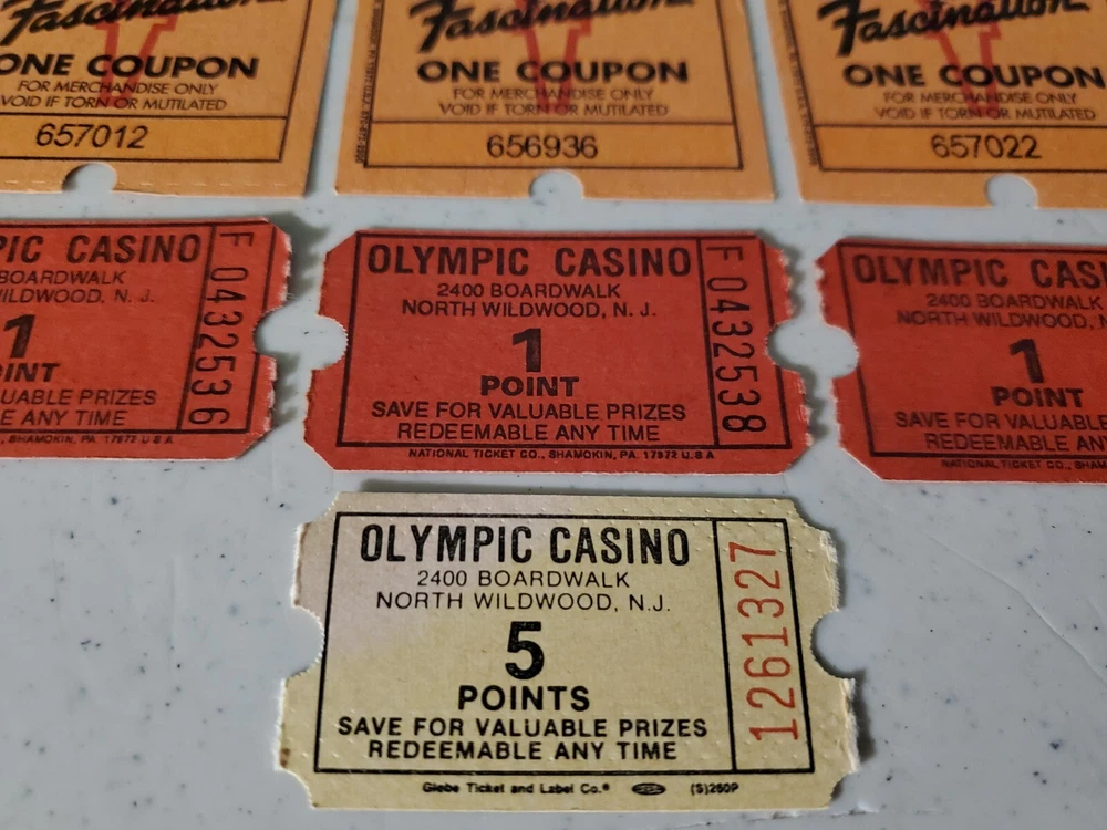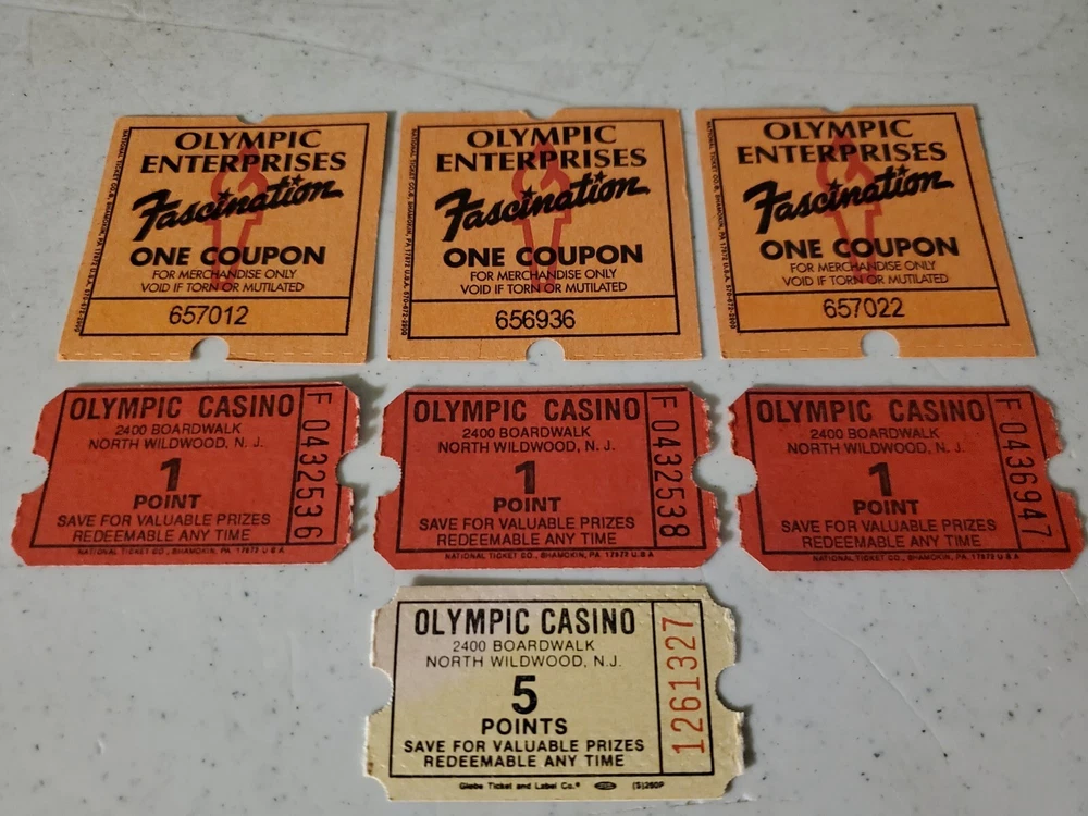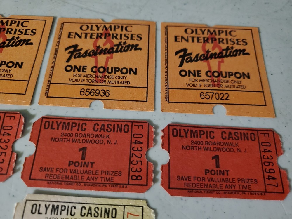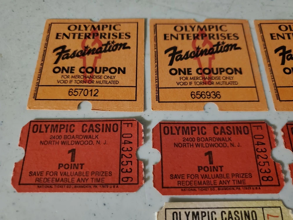 7 Lot, Super Rare Vintage Original, North Wildwood New Jersey, 1960s ? 1970s ?, Very Early Fascination Olympic Casino Coupons Tickets, redeemable for valuable prizes etc.., 2400 Boardwalk North Wildwood NJ Olympic Casino Enterprises, super rare tickets, for merchandise etc., the tickets coupons that you see in the photographs is the tickets that you will receive, very early ticket numbers, amazing historic memorabilia tickets from the North Wildwood New Jersey Boardwalk, nice pre-owned condition, see pics, nice tho, see all photographs attached, arcade games pinball arcade skee ball Boardwalk fairs carnivals amusement parks coupon tickets, historic memorabilia, souvenir souvenirs, makes a great gift, super collectible collectibles, This auction will be Shipped with USPS First Class Mail, with Delivery confirmation is included, we only ship within the USA and shipping is free, If you like these rare tickets, get them, or make an offer on them.. makes a great gift..