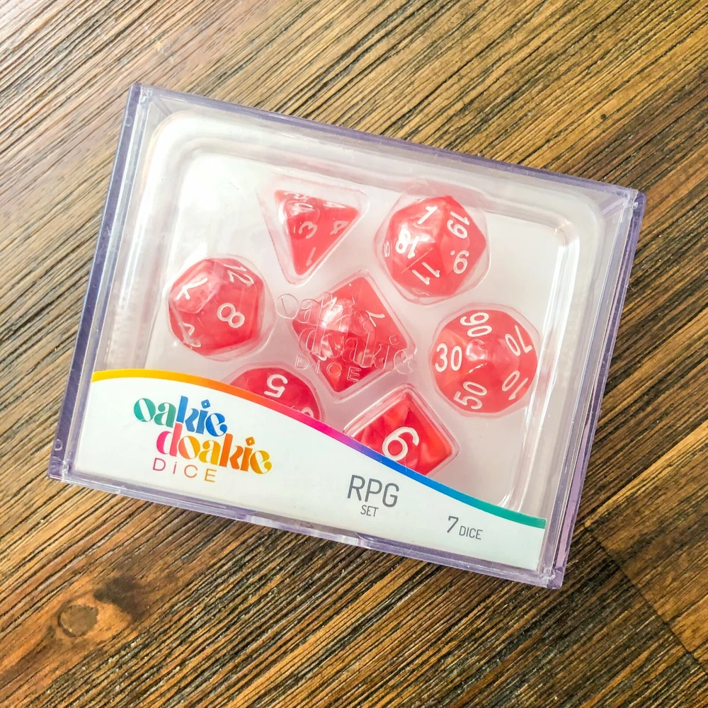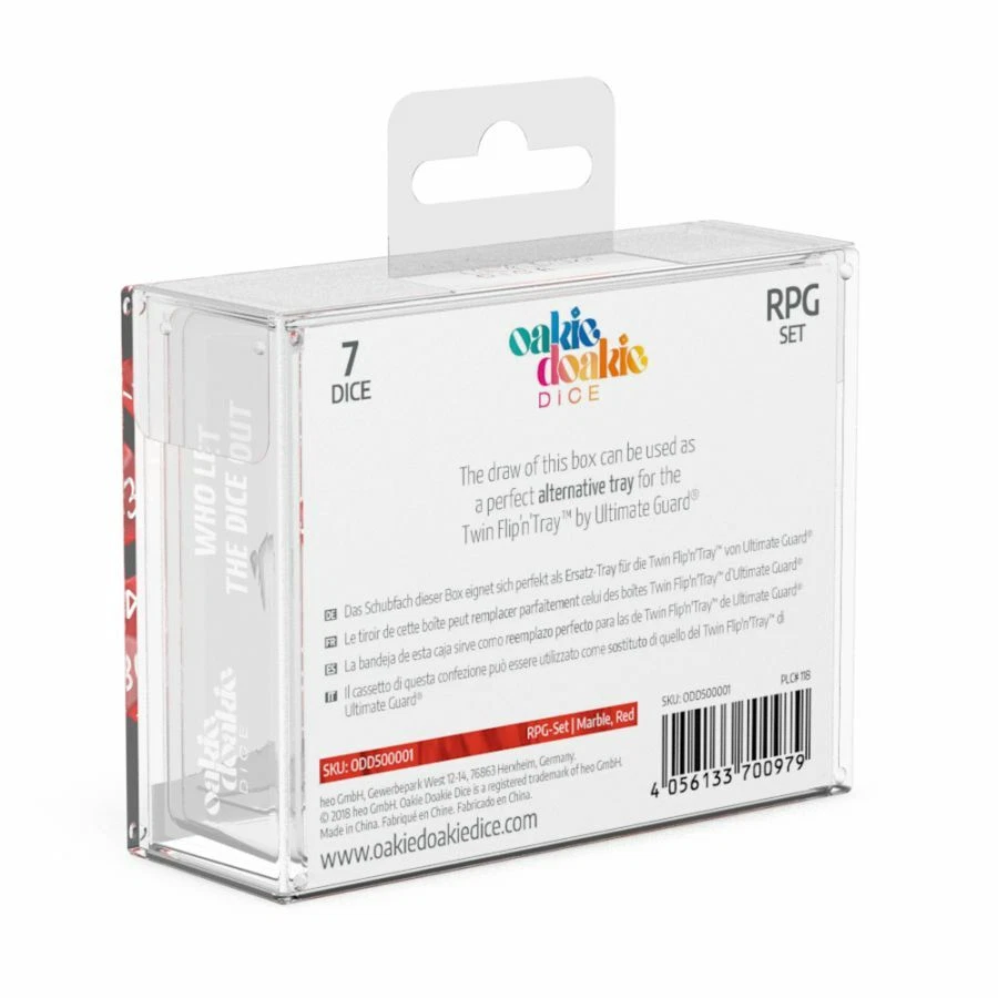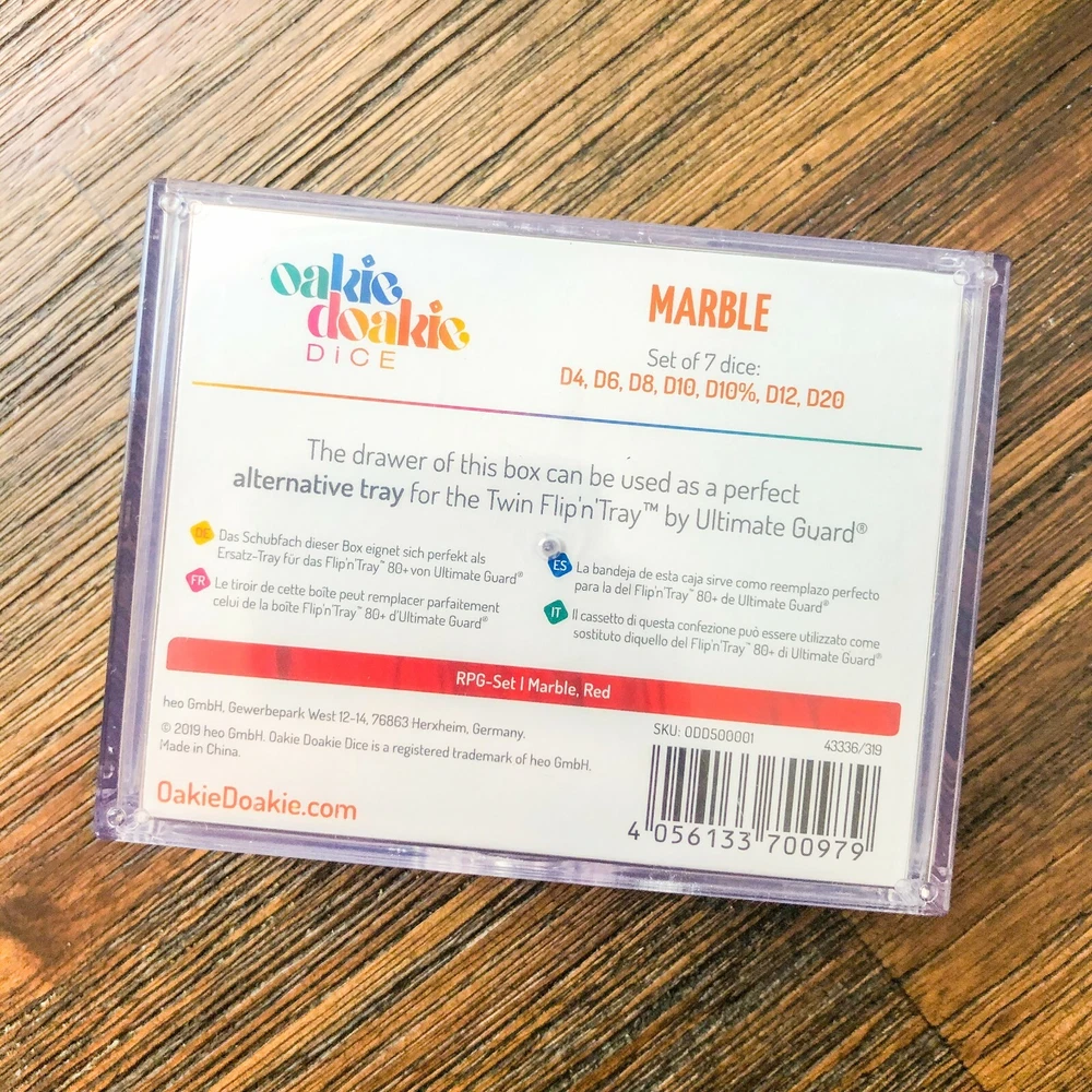 This product is a set of seven dice designed for role-playing games. The dice are made by Oakie Doakie and feature a marble red design. They are new and come in a box.