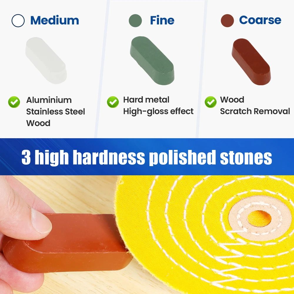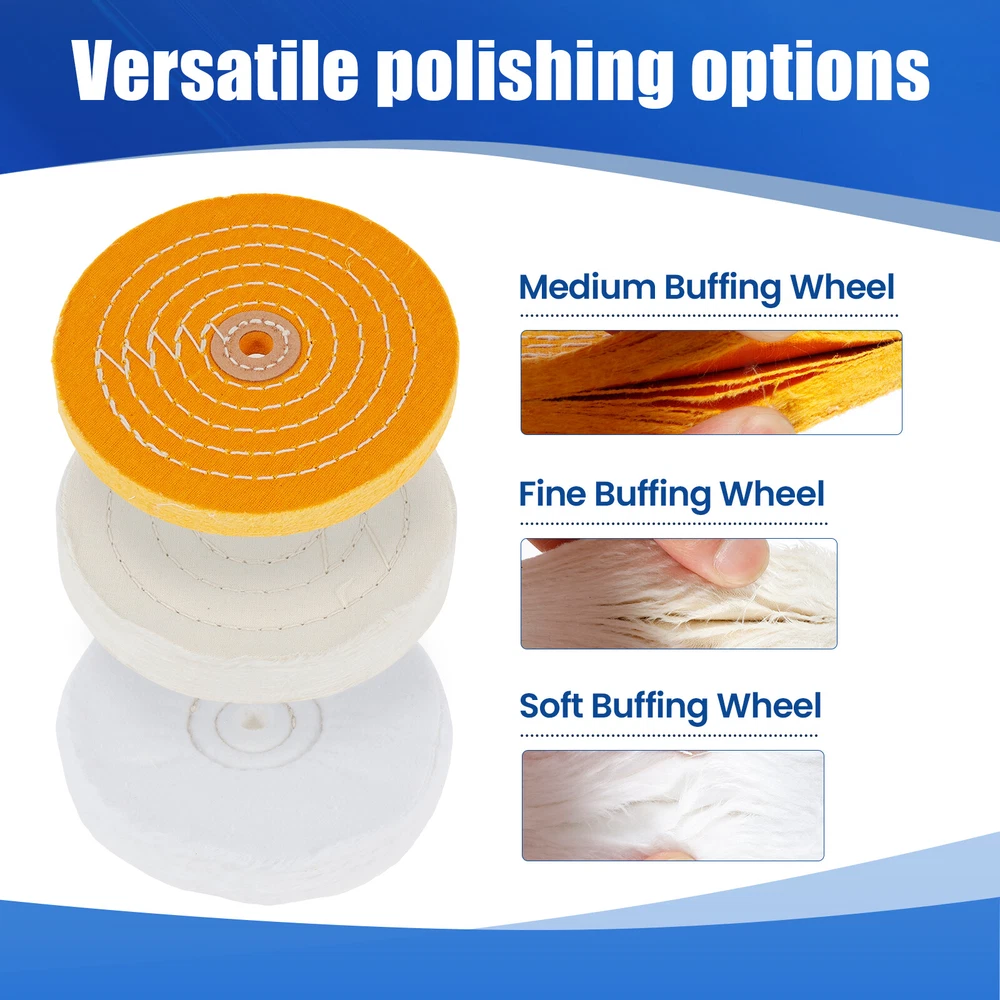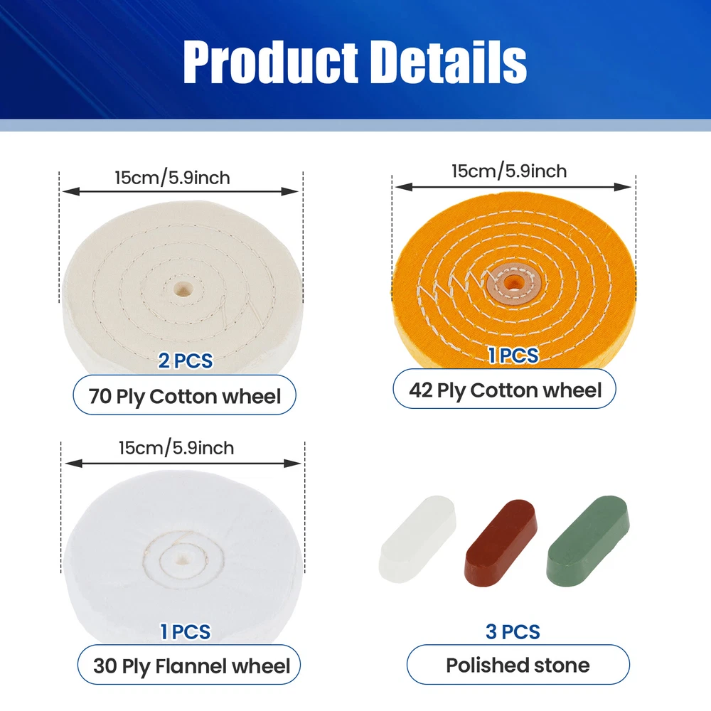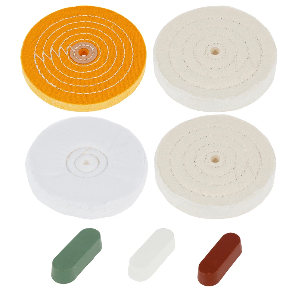 Parts List: 4 x Cloth Polishing Wheel 3 x Polishing Compound Highlight description: Premium Material: The polishing wheel kit is crafted from cotton. It is designed for detail cleaning and can be reused after cleaning. This polishing kit is suitable for multi angle polishing and can polish every corner of the item Polishing Wheels: The buffing wheel kit has cloth wheels with different finenesses. You can do coarse; medium and fine polishing and choose different finenesses according to your needs. Comes with a cleaning cloth for cleaning Polishing Compounds: 3 types of polishing compounds with high hardness and fast polishing speed. Green one for pre polishing of soft metals, brown one for soft metals. Can be used in conjunction with a brightener to give a glossy surface Kit Function: Mount the polishing wheel on a small table buffer or hand drill for cleaning; descaling and polishing. Ideal for stainless steel, brass and other metals, but can also be used to clean jewelry and furniture Wide Use: The polishing kit fits most sizes of drill bits and is not easily dislodged. Suitable for grinding and polishing processes in the jewelry; metal; stainless steel; aluminum; wood; plastic; ceramic; glass and watch industries Detailed description: Description: Our kit contains 4 cloth wheels and 3 polishing compounds, the ideal combination. The polishing kit features cloth wheels with different finenesses so you can do coarse, medium or fine polishing and choose different finenesses as needed. The 3 compounds are hard and fast. Suitable for metal, jewelry, stainless steel, aluminum, wood, plastic, ceramics, glass, etc. Key Feature: Size: The polishing wheel is about 6inch/15cm in diameter. (Remember to apply oil to the spindle after use of the conversion spindle to better protect the finish of the part, prolonging the service life.) Specification: Product Name: Polishing Wheel Kit Size: Cloth Polishing Wheel Diameter: 15cm/6inch Material: Cloth Color: Mixed Colors Note: 1.There may be slight differences between the picture and the actual color of the commodity. We will try our best to show you the exact color. 2.Please allow slight dimension difference due to manual measurement. 3.Remember to take precautions when doing polishing work: wear masks, glasses, gloves, etc.