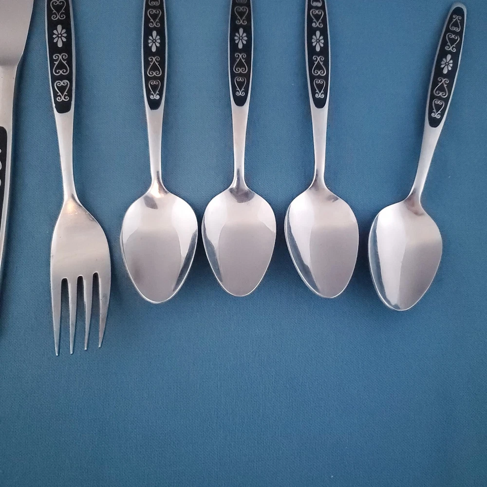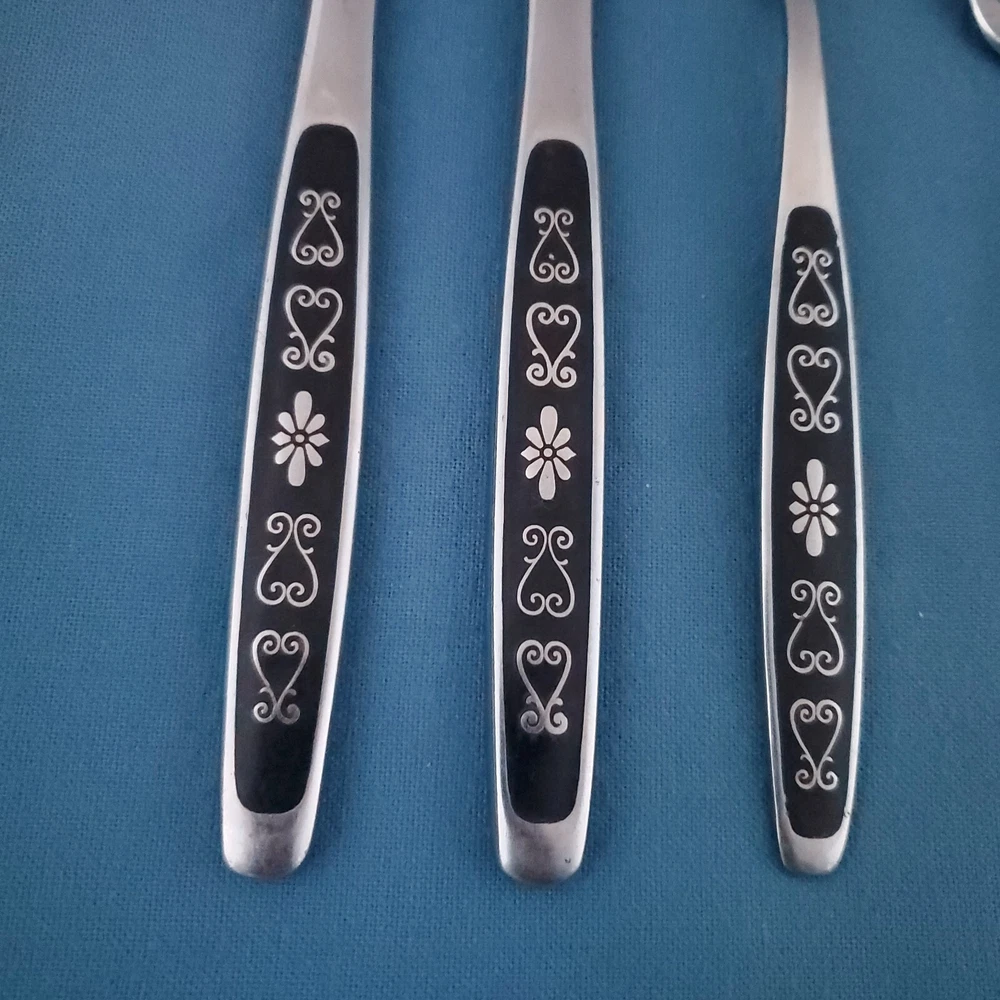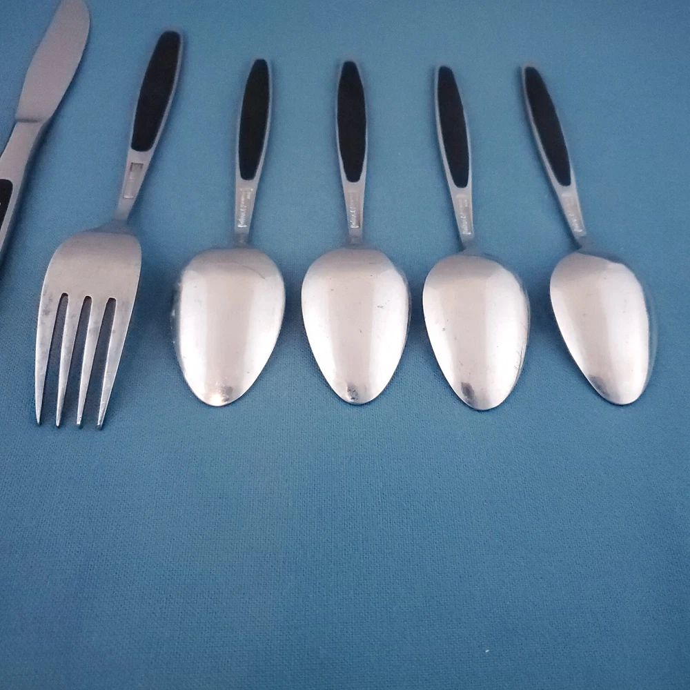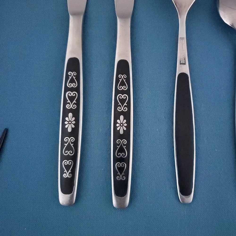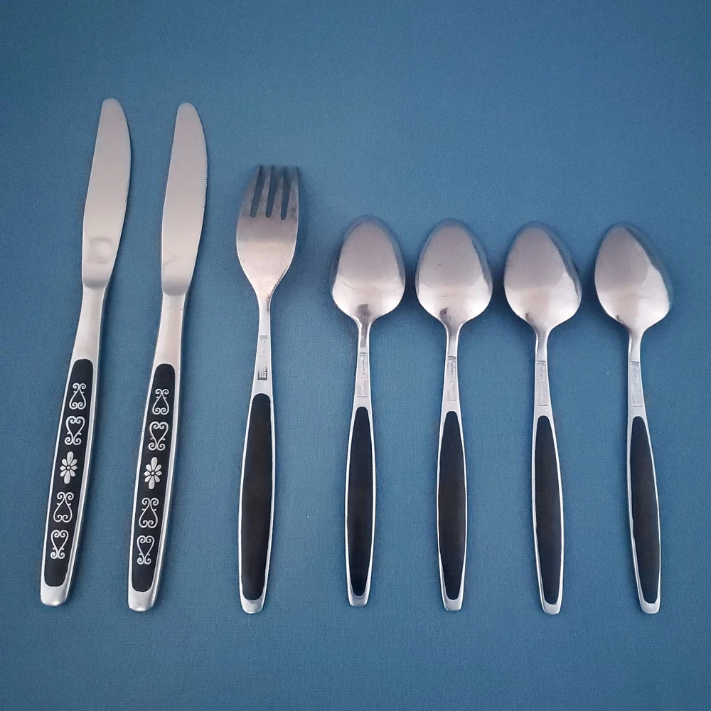 7 Pcs Riviera RIF25 ~ (1) Dinner Fork, (2) Dinner Knives, (4) Teaspoons ~ Black These beautiful pieces are in Used Vintage Condition. There are some marks, scuffs, nicks and surface scratches consistent with age and use as well as some spots and darkening . *Two Pieces have small cracks across the top of the black section ~ the fork and one of the spoons (see photos)* Please view the photos carefully for condition details. Don't forget to check out the other items in my shop. I'm getting in new fun things all the time. Thank you for looking! Have a great day!