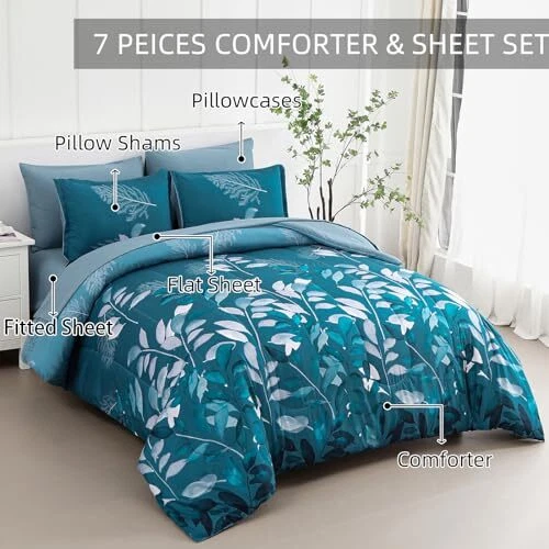 Return Policy Fast Delivery Trusted seller 7 Pieces Teal Botanical Comforter Set Queen Size - Teal Green Floral Bed in a Bag - Elegant Leaves Floral Comforter with Flat/Fitted Sheets Set, All Season Soft Microfiber Bedding Set (90"x90") Product Description 【LUXURIOUS FLORAL DESIGN】7-piece teal queen comforter set features a stunning floral design that adds a touch of elegance to any bedroom decor. The intricate plant leaves pattern in gradient colors extend upwards, impressing and creating a cozy atmosp for a good night's sleep 【SOFT MICROFIBER】Floral comforters queen size is made from high-quality microfiber material, our botanical bedding set is designed to be soft, lightweight, and breathable. It provides a cozy and comfortable sleeping experience, ensuring a restful night's sleep, making it perfect for all seasons 【COMPLETE 7-PIECE BEDDING SET】This bedding comforters sets come with everything you need to create a comfortable and stylish bedroom. The set includes 1 Comforter(90"x90") + 2 Pillow shams( 20"x26")+ 2 Pillowcases ( 20"x30") 1x Flat sheet(90"x102")+ 1 Fitted sheet(60"x80"+12"), making it a complete bedding solution. NOTE: The pillow shams were random clipping, so the pillow shams might be vary. 【MACHINE WASHABLE】This bed in a bag king is machine washable, making it easy to keep clean and maintain. Simply toss it in the washing machine and tumble dry on low for a hassle-free cleaning experience 【ALL SEASON COMFORTER】Our botanical comforter set is crafted with exquisite workmanship, and designed to provide comfort and warmth throughout the year. Precise stitching and the durable fabric ensure it is the perfect choice to be used in your bedroom, guest room, or vacation home Shipping Returns Payment Shipping Shipping is FREE to all addresses other than APO/PO boxes in the lower 48 states. All our stock ships from US-based warehouses. Shipped via USPS or UPS (depending on location and package weight) Unless stated otherwise, all orders will ship within 24-72 hours of your payment being processed. Check our feedback to see the great reviews of FAST shipping we offer. Returns Seller does not accept returns Payment We currently accept payment via eBay managed payments only. Once payment is cleared, we will dispatch your shipment within 1-3 business days. Please refer to the "Shipping" tab for more information regarding shipping speed to your destination.