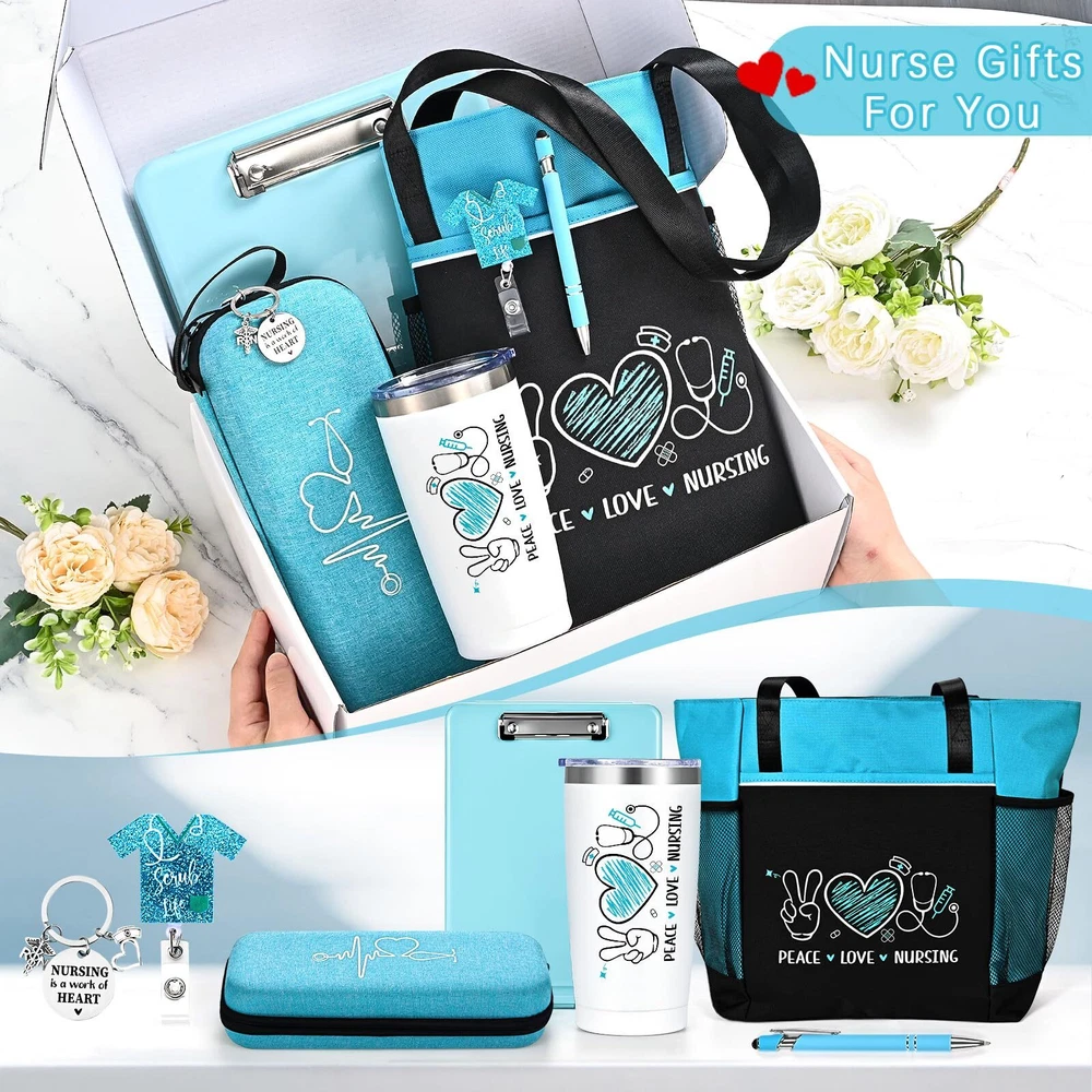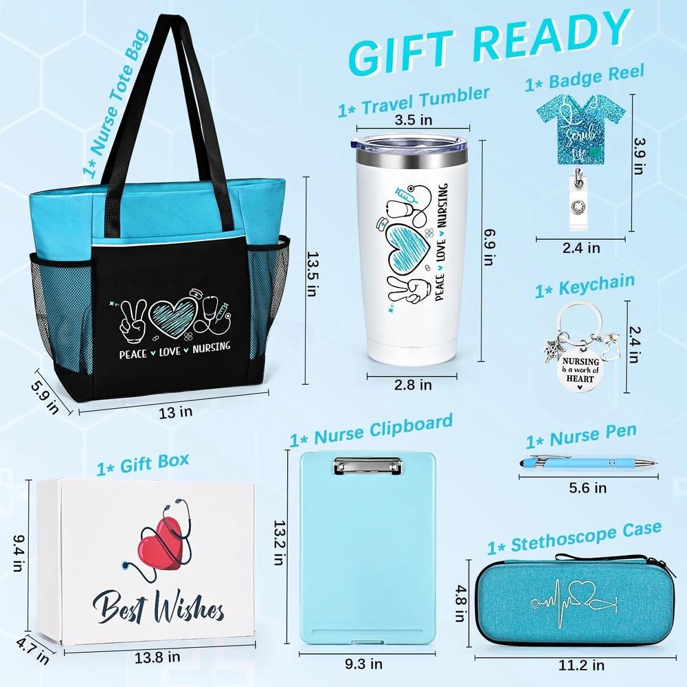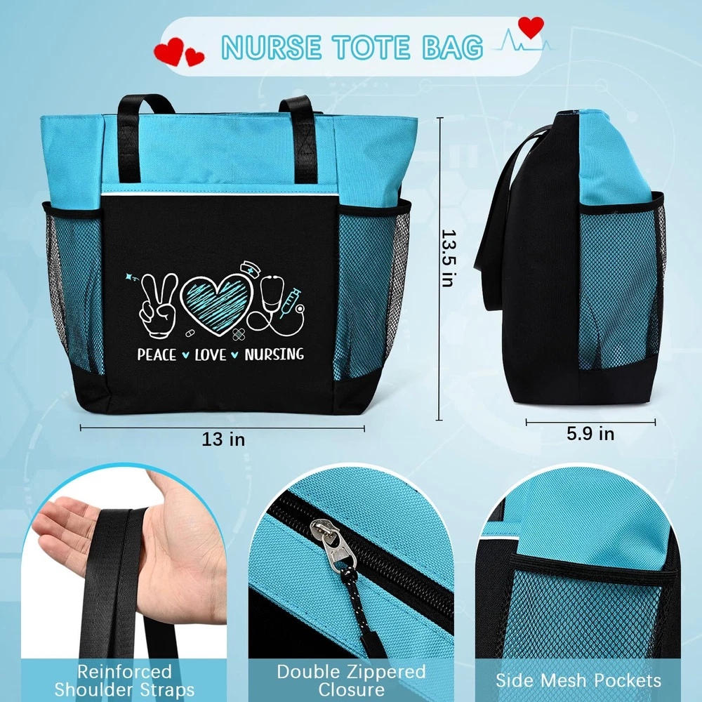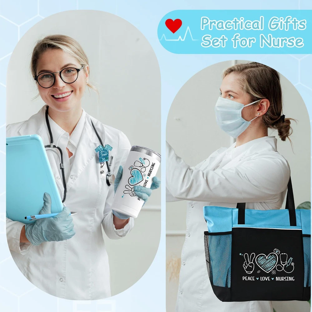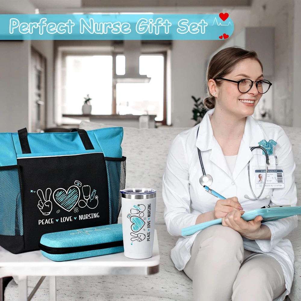 Nurse Appreciation Gift Set - Deluxe 8-Piece Nurse Tote Bag Bundle with Essentials and Accessories - Perfect for Nurse Graduation, Nurse Week, Birthday, Recognition, or Special Thanks. Nurses are the heartbeat of the healthcare system—always on their feet, providing care, and touching lives with their kindness and expertise. Our Nurse Appreciation Gift Set is meticulously curated to brighten their day and provide the practical tools they need for their demanding roles. This deluxe 8-piece set contains a durable Nurse Tote Bag, a protective Stethoscope Case, a time-saving Nurse Clipboard, an elegant Badge Reel, a sleek pen, a charming key chain, a high-quality 20oz insulated tumbler, and a beautiful presentation gift box. What's Included: Nurse Tote Bag: A spacious and chic tote bag designed with a nurse's busy day in mind. With plenty of pockets for organization, it can comfortably hold medical essentials, personal items, and even a laptop for on-the-go convenience. Stethoscope Case: A durable and soft-lined stethoscope case that protects one of the most important tools of the trade. Its sturdy construction ensures the stethoscope stays safe and sound during transport. 20oz Insulated Tumbler: A sleek and robust 20oz tumbler to keep them hydrated and caffeinated. Its insulation technology ensures their drink stays at the perfect temperature for hours, whether hot or cold. Nurse Clipboard: A specialized clipboard featuring quick-reference medical information makes patient documentation a breeze and keeps critical information at their fingertips. Badge Reel: A stylish badge reel with a secure clip to keep their ID badge easily accessible, adding a professional and personalized touch to their uniform. Pen:A high-quality pen that writes smoothly—an essential tool for note-taking and recording important patient details. Key Chain: A charming nurse-themed key chain that's not only a cute accessory but also a daily reminder of the value and importance of their work. Presentation Gift Box:All these nurse essentials are delicately arranged in an elegant gift box, creating an impressive unboxing experience and eliminating the need for wrapping. Package Included: 1* Nurse Tote Bag 1* Nurse Tote Bag 1* Stethoscope Case 1* 20oz Travel Tumbler 1* Nurse Clipboard 1* Badge Reel 1* Nurse Pen 1* Key Chain 1* Gift Box 2*Lids and Straws 1*Straw Brush 1*Cup Cleaning Brush Kind Reminder: 1.Caution: Sharp edges on packing. Handle with care to avoid cuts. 2. Keep children away from the mug when it is filled with hot liquid. PRACTICAL COMBINATION: The nurses week gifts set includes: 1*20oz Insulated Tumbler, 1*Nurse Tote Bag, 1*Stethoscope Case, 1*Nurse Clipboard, 1*Badge Reel, 1*Nurse Pen, 1*Nurse Key Chain, 2 Lids and Straws, 2 brushes, and 1*Gift Box that every nurse will love. This gift set is very practical and convenient for nurses to take to work or somewhere they want to go. 8 PIECES NURSE GIFTS SET FOR WOMEN: The nursing bag and stethoscope gifts set is the perfect gift for nurse week, nurse graduation, medical assistants, new nurses, nurse graduates, ER nurses, OB nurses, student nurses, ICU nurses, retired nurses on birthday or Christmas as the thank you gifts to express your gratitude to nurses. NURSING-INSPIRED STYLE: The nursing essentials set is adorned with a nursing-themed design and coordinating colors, Featuring he heartfelt slogan “Peace, Love, Nursing”, it’s perfect suited for everyday use both in a nurse’s personal life and professional practice. BUILT TO LAST: The nurse gift tote bag is crafted from durable, high-grade fabric that’s both sturdy and light for effortless portability while ensuring the contents stay secure. Accompanying the bag is a insulated tumbler and key chain construct from premium stainless steel, designed to resist tears and wear. The stethoscope case is fashioned from quality material with vivid patterns that are resistant to fading, promising enduring service. CONVENIENT FOR ON-THE-GO: This versatile nurse work bag is ideal for a multitude of uses, whether you’re packing a lunch, storing supplies, or needing a stylish accessory for outings, shopping, travel, and various outdoor activities. Equipped with a front pocket and two side pockets, it’s designed to effortless transport all your daily necessities to and from work with ease.