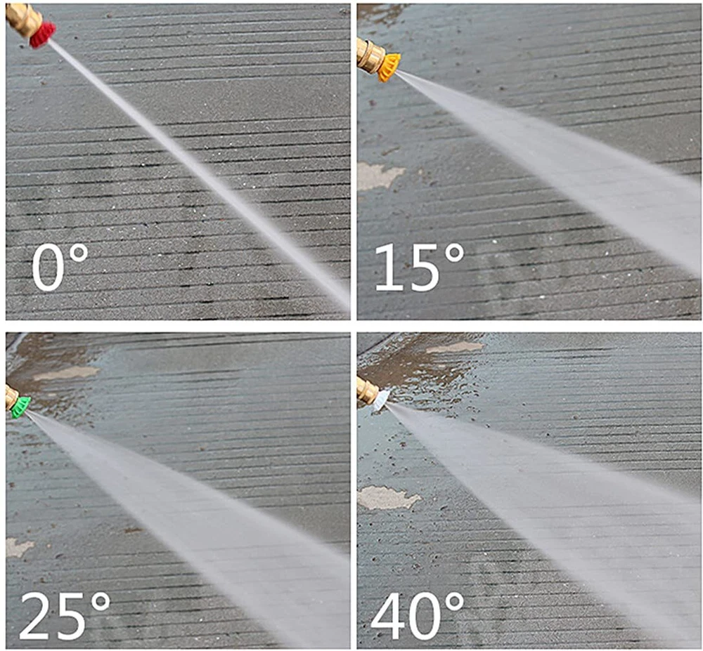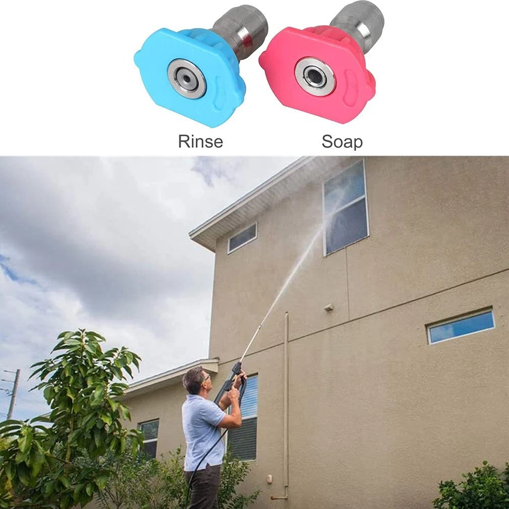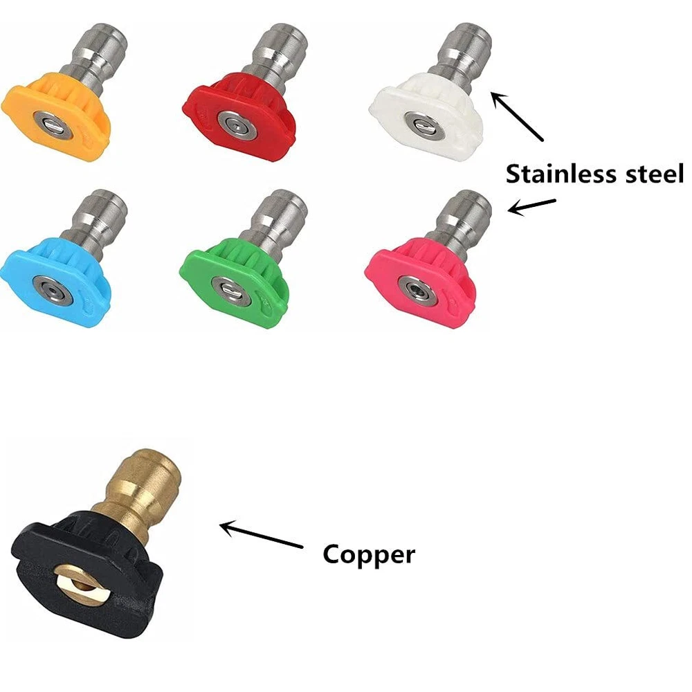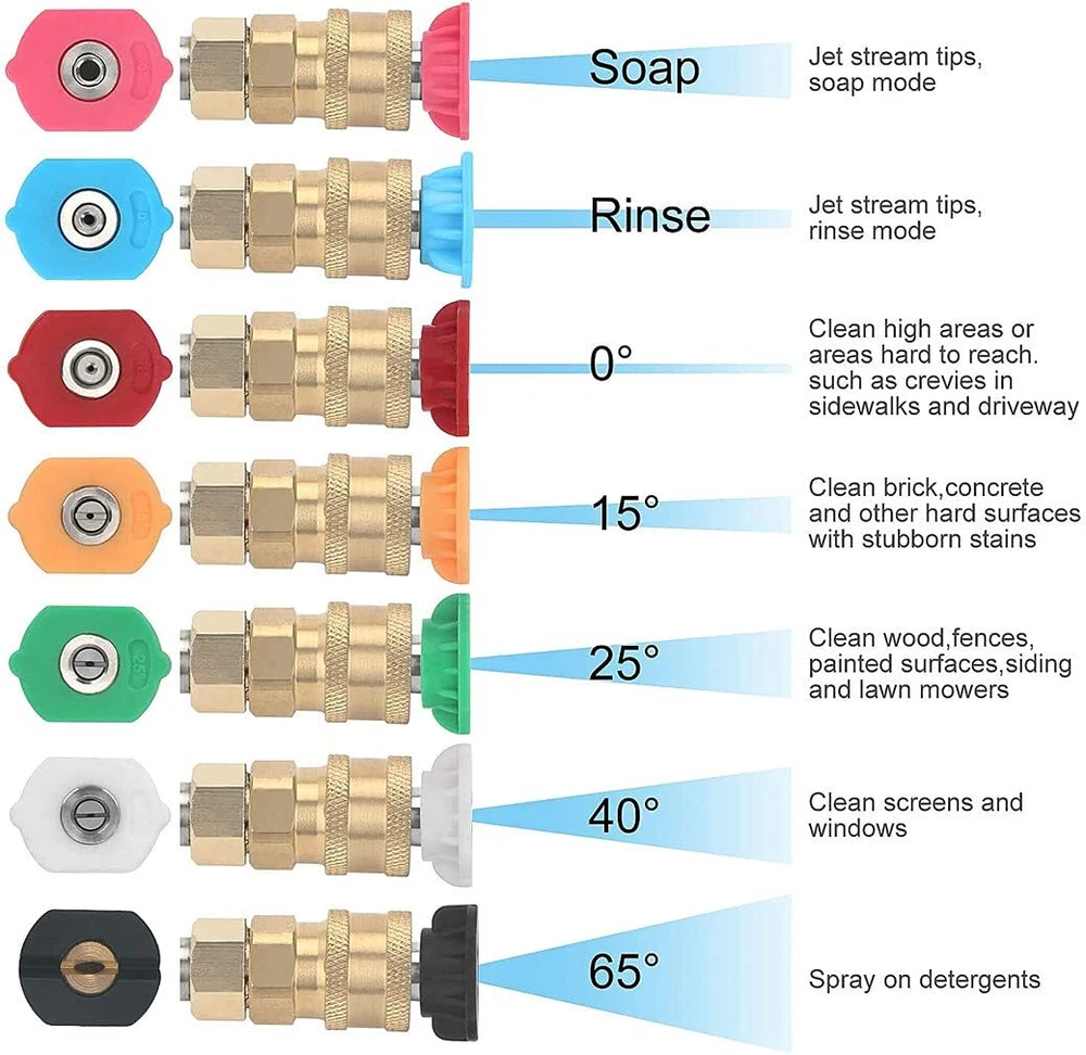 Pressure washer tips set is easy to set up. had all the different pressure washer nozzles, easy to remove And replace from washer nozzles. 7 Pieces Set - 7 Different Spray Angle Modes, includes 4pcs high pressure stainless steel quick connect spray nozzles, Red nozzle tip 0°, Yellow nozzle tip 15°, Green nozzle tip 25°, White nozzle tip 40°, and 1pcs Black Brass nozzle tip 65°, and 2pcs jet stream tips (Blue tip for rinse mode, Pink tip for soap mode) 7 Different Nozzles angle tip Choose different angles spray nozzle according to the actual need, such as watering flowers and plants, washing car, washing fence and cleaning sidewalk, and can be attached to a quick-connect wand for swifter application and more Universal pressure washer accessories fit for most leading brands such as Sun Joe, AR Blue, Simpson, Greenworks and more. Each easy fitting nozzle tip is designed for usage on a different outdoor surface Pressure washer tips set is easy to set up. had all the different pressure washer nozzles, easy to remove And replace from washer nozzles Attached to a 1/4 inch Quick-Connect Wand Perfect for almost all brand of pressure washers up to 4000psi Make sure working pressure of your pressure washer is higher than 1720 psi while using two jet stream tips(blue and pink tips). The higher pressure you have, the further water will reach to clean.