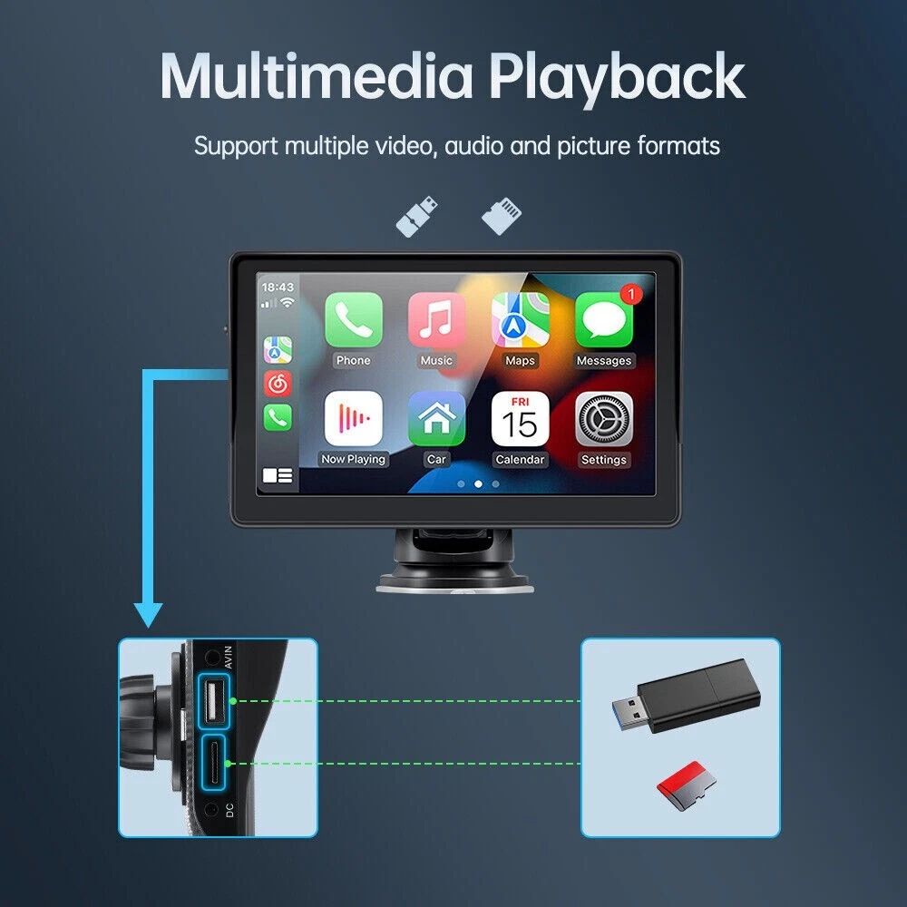 7'' Portable Car Stereo Radio Wireless Apple CarPlay Android Auto Backup Camera Features: 【 Wireless Apple CarPlay & Android Auto 】This car multimedia monitor is compatible with wireless Apple Carplay, wireless Android Auto function. (It also can support Wired CarPlay & Wired Android Auto.) 【 Wired Apple & Android Auto-Link 】This car multimedia monitor is compatible with Apple & Android Wired Auto-Link. 【 Voice Control 】Uses your smartphones such as Hi, Siri / Hello Google assistant wirelessly to make calls and play your music without taking your eyes off the road. 【 Rear View Camera 】This monitor come with HD rear view backup camera. It can help you have a safe reversing and parking. (The video cable length is 20ft(6M), it you want 33ft (10M) cable, you can buy one in our store) 【 FM Voice Transmit 】Our multimedia monitor have a small speaker. If you want to enjoy your original car audio, you can use FM Transmit function to launch voice signal to your original car radio. 【 USB, TF Card, Bluetooth 】This car multimedia monitor can support USB disk, TF card music, video playback. It also can supprot Bluetooth music & handsfree call. 【 HD Touch Screen 】7 inch screen car stereo with 1024x600 HD IPS screen, support 1080P video playback. Enjoy the features such as maps, movies and more. 【 Simple Installation 】This car multimedia monitor with the suction mount secures intellidash to your dashboard or windshield and can be easily removed and stored. 【 Compatible with 99% vehicle 】Our multimedia monitor work voltage is 12-24V. Truck, bus, van, car, both vehicle can be used. It can let everyone enjoy CarPlay & Android Auto. Specification: Model: YT-B5300A OS: Linux Screen size: 7 inches Screen resolution: 1024x600 Radio Transmit frequency: FM 93.0~108.0MHz Output power: built-in 1W speaker Working voltage: 12~24V Working temperature: -10~+60℃ Bluetooth version: 5.0 (default name: CarPlay) Shell size: 188x110mm/7.08x4.33" Phone screen mirroring: support Steering wheel control: not supported Video output: not supported Offline maps: not supported Dashcam input: not supported Built-in speaker: yes USB port: USB 2.0 TF card: support Reversing video input: support Audio format: MP3/AAC/APE/OGG/M4A/RA/WAV Video format: H263/H264/H265/DIVX HD/AVI/FLV/MKV/MPEG/MP4/WMV9/VC/ASF/TS/QT Image format: JPEG/PNG/BMP/GIF/TIFF Package Included: 1 x Car Multimedia Monitor 1 x Power Cable 1 x User Manual 1 x Rear View Camera & Video Cable 1 x Monitor Suction Cup Gasket 1 x Remote Control 1 x Packaging Box Shipping 1. We will send the item to you from the warehouse near you. 2. We only ship to address that you left on the order, must confirm your Shipping address. 3. All the items will be shipping within 1-2 working days after receiving the payment, except some holidays. 4. When the shipping method is express delivery, some areas need to pay remote fees to the courier company. Returns 1. If you have not satisfied as you received the item, please return it within 30 days for a replacement or money back. Please contact us before you return it. 2. All returned items must be in the original packaging with all components and accessories included, and you must provide us the return shipping information (The shipment or the tracking number) 3. Return shipping fee is to be paid by the buyers. We will not be responsible for any custom duty or import tax. Warranty 1.One Year Manufacturer's Warranty for defective items (excluding items damaged and/or misused after receipt). 2.Defective items must be reported and returned to us within the warranty period (and in the original packaging, if possible). You must tell us what the defect is and give us your eBay ID. We do not repair or replace items with an expired warranty. Bluetooth 5.0 Output Power built-in 1W speaker Color Black Fitment Type Direct Replacement MPN Does not apply Material Metal,ABS Carplay Apple Carplay/Android Auto USB Port Support Funtion Car play/Bluetooth/FM /Mirror link/Android Auto Touch screen Type Capacitive Multi-Touch Screen Brand YuanTing Type Radio Model YT-CA706 Unit Size 7'' Features Bluetooth Ready, HD Radio Ready, Touchscreen, USB Input Country/Region of Manufacture China TF Card support