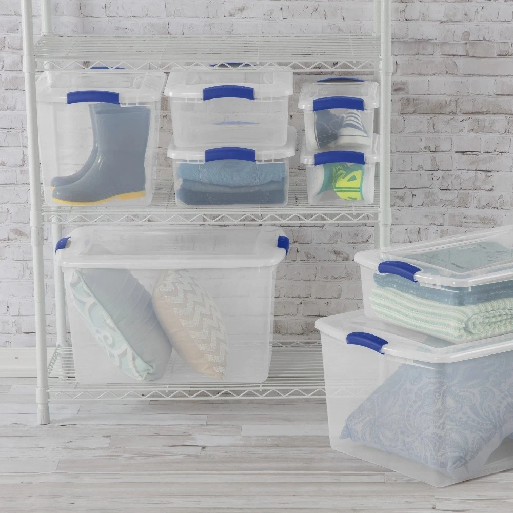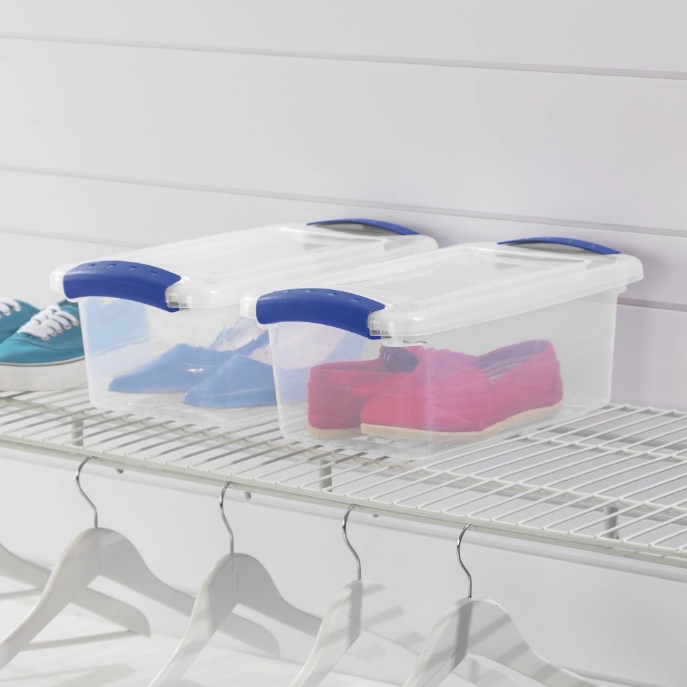 Step up to ’s versatile 7 Quart Clear Latching Storage Bin and get organized! The clear base and lid let you easily view and locate stored contents from any angle. The color accent latches keep the lid attached to the base, keeping items contained. The recessed lids help bins stack to efficiently use vertical space. This size plastic storage container is perfect for shoes, accessories, crafts, and other small items and conveniently fits on standard shelving. This is the ideal solution for a variety of storage challenges, helping to bring order to closets, bedrooms, craft rooms, and dorms! 7 Quart Latch Box, Clear Plastic Storage Bin with Lid, Blue Latch Outside Dimensions: 14 3/8" x 8 1/4" x 6" Interior Dimensions at bottom: 11 1/8" x 6 1/2" x 5 1/8" Clear lid and base for easy identification of contents from any angle Color accent latches keep lid secure and stored items in place This size conveniently fits on standard closet shelving to optimize your storage area Recessed lids allow bins to stack neatly to maximize vertical storage space Use good judgment when stacking items, keep heaviest bin at the bottom and phthalate-free