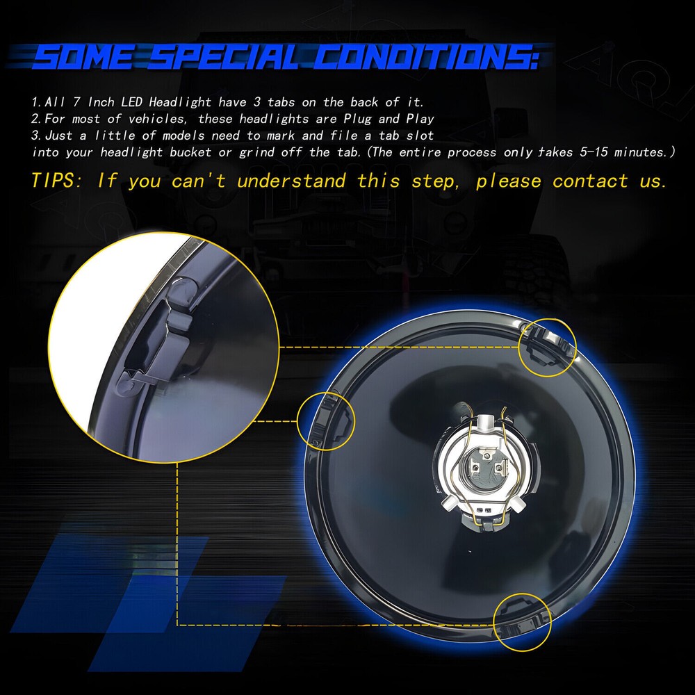 Pair 7" Round HI/LO Beam LED Headlights for Chevrolet 1962-1980 C10 Pickup Truck Features: - Provides a brighter, crisper and whiter light output, closer to the color temperature of daylight, dramatically improving light projection distance and overall visibility,plug and play,anti flicker. - Metalized reflector optics provide a lighting experience that smooth and clean across the driving surface,polycarbonate lens offer optimum protection against damage from impact, roadside debris and other hazards - 5 year warranty,100% High-Performance LED lamps,Black durable aluminum housing,shock-proof waterproof(IP67),5600K,More than 80,000 hour lifespan. - Plug & Play & H4/H13 Adapter, built-in LED Canbus. Requiring no modifications. Installation takes only few minutes. - Waterproof,shake-proof, rust-proof, and anti-explosion. Specification: - Voltage: DC 10V~30V - Wattage: 105W - Lifetime: More than 80000 hours - Color Temperature: 5600-6800K White - Luminous Flux: 10000LM@high beam,8500LM@low beam - Waterproof Rating: IP 68 - Dimensions: 7 Inch - Surface Finish: Black Housing - Connection: H4/9003 Plug Fitment: For any car or truck with 7" round headlights,such as: For Jeep CJ-5 1959-1983 For Jeep CJ-7 1976-1986 For Jeep CJ-8 Scrambler 1981-1985 For Jeep Wrangler TJ 1997-2006 For Jeep Wrangler LJ Unlimited 2004-2006 For Jeep Wrangler JK 2 Door 2007-2017 For Jeep Wrangler Unlimited JK 4 Door 2007-2017 Fit for Chevrolet Truck (1947-1957 and 1962-1972) Fit for Chevrolet C10 Pickup (1969-1974) Fit for Chevrolet C10 (1975-1980) Fit for Chevrolet C10 Suburban (1969-1980) Fit for Chevrolet C20 Pickup (1969-1974) Fit for Chevrolet C20 Suburban (1969-1980) Fit for Chevrolet C20 (1975-1980) Fit for Chevrolet C30 Pickup (1969-1974) Fit for Chevrolet C30 (1975-1980) Fit for Chevrolet Chevelle (1971-1973) Fit for Chevrolet Chevette (1976-1978) Fit for Chevrolet El Camino (1971-1975) Package include: 2pcs 7" round led headlights 2pcs H4-H13 adapter Warranty: 5 years