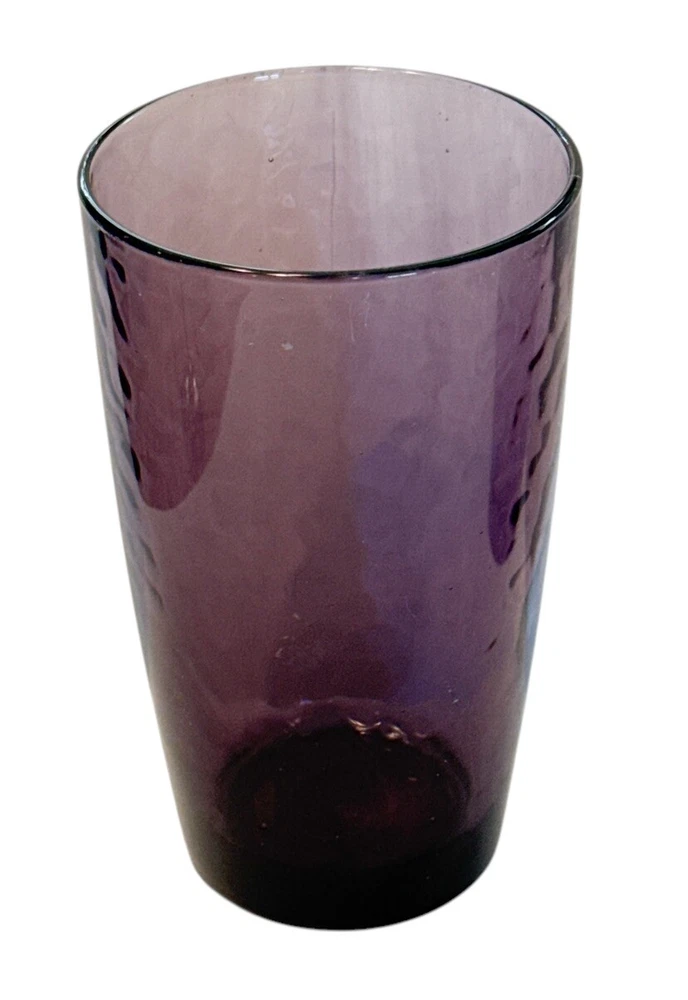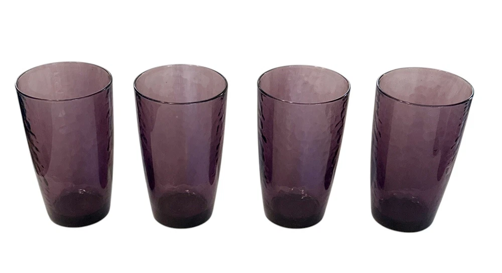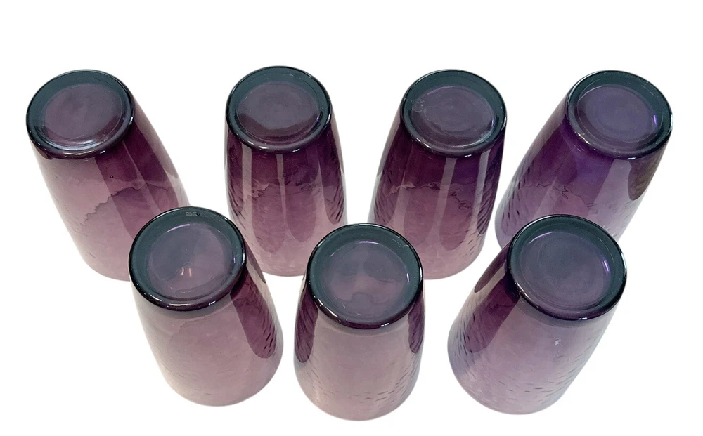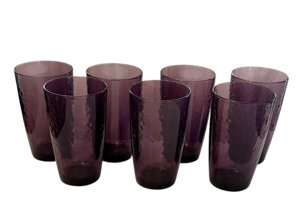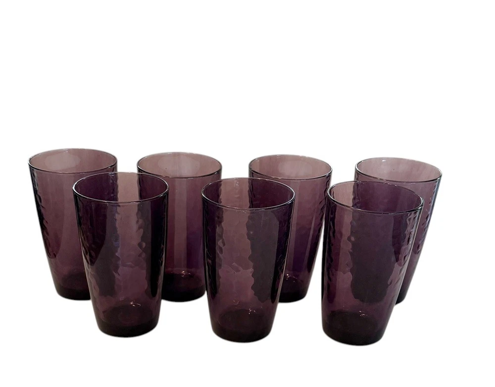 This set includes 7 contemporary round purple amethyst tumbler glasses from the Vintage Bromioli Rocco Studio Palatina collection. Each glass has a capacity of 12 oz, a textured hammered surface design, and is machine washable. The glasses are 5.5 inches tall with a 3.25-inch width at the top rim, made of glass material, and are suitable for all occasions. Smoke free home Please visit my store at https://www.ebay.com/str/theuniqueredhead . Thank you for your consideration. Please message me if you have any questions. I do combined shipping on my items in the store.