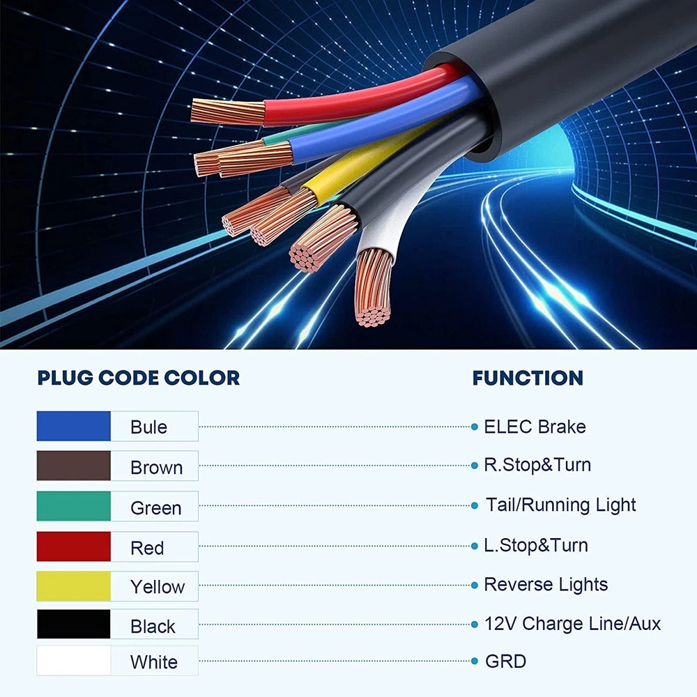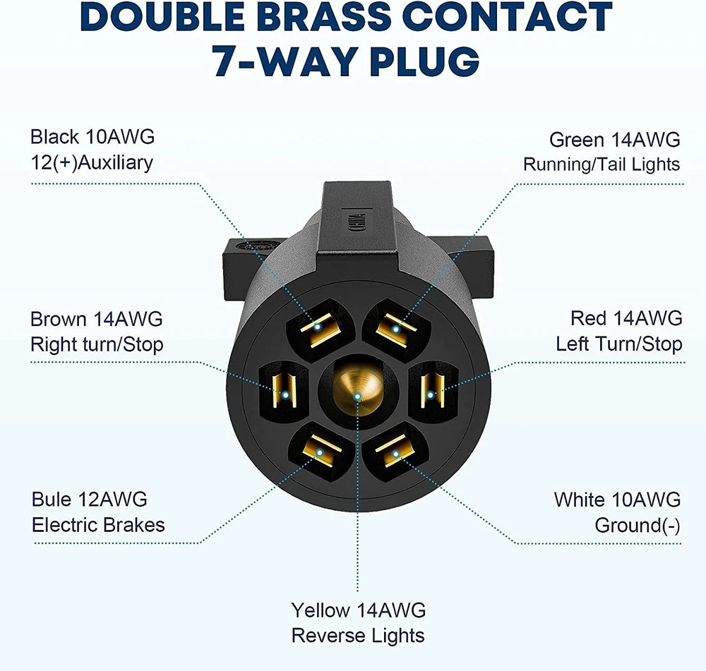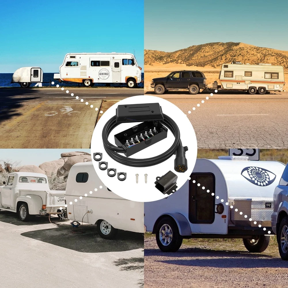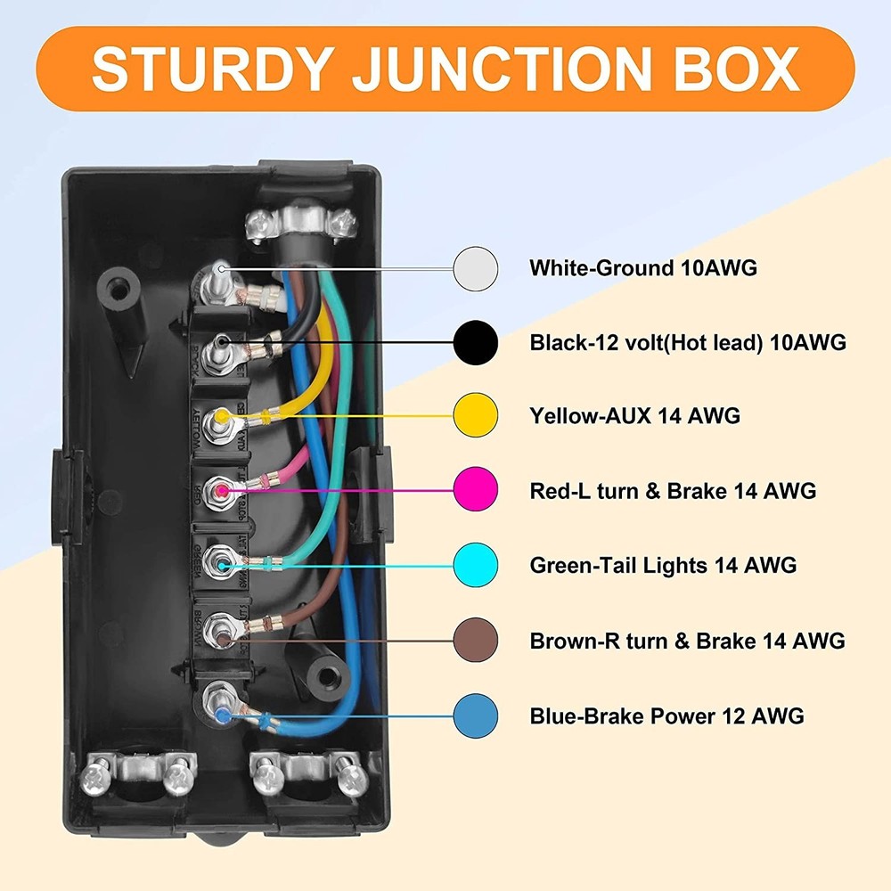 Features: PRACTICAL TRAILER CORD SET: This set includes a 7-way trailer cord with junction box- for your trailer wiring, for safer towing by connecting your vehicle to your trailer's breakaway battery and trailer brakes, and a plastic trailer plug holder that keeps the plug from dragging on the ground. CONVENIENT TRAILER WIRING: 7-way molded plug and pre-wired junction box makes it much easier for wire connections as well as keeping all your wires organized and protected, eliminates troublesome splicing, and simplify installation. DURABLE CONSTRUCTION: 100% copper wire ensures great conductivity, soft and rugged PVC material jacket providing flexibility in use. Weatherproof, moisture, abrasion, and corrosion-resistant. GOOD SEALING PERFORMANCE: ABS housing junction box coupled with rubber grommets providing superb protection against rough weather condition. WIRING INSTRUCTIONS: The color of the wiring may not match the color of your trailer, please compare the wiring diagram in the picture or manual. 7 Pole junction Box: wired with color marked 7-poles that can be easily identified. BROWN: 14AWG Right Turn& Brake, BLACK: 10AWG 12V Battery Power, GREEN: 14AWG Tail & Running Lights, RED: 14AWG Left Turn & Brake, WHITE: 10AWG Ground, BLUE: 12AWG Brake Controller Output, YELLOW: 14AWG Reverse Lights Weatherproof, heavy-duty plastic junction box protects wires and terminals from the elements. Notice: In case the item is defective, please inform us within 15 days of receipt, we will arrange reship or refund. Buyers have to pay for the return cost and we will pay the cost for resend. If you are unsatisfied with our item or service, please contact us before leaving any feedback. We are committed to resolve all issues in a friendly and satisfactory manner. We always reply to messages within 2 business days (off-duty at weekend).If you do not get a response from us, then please check your junk or spam mailbox.