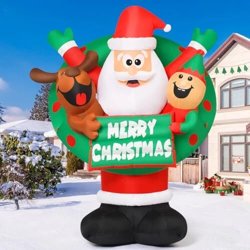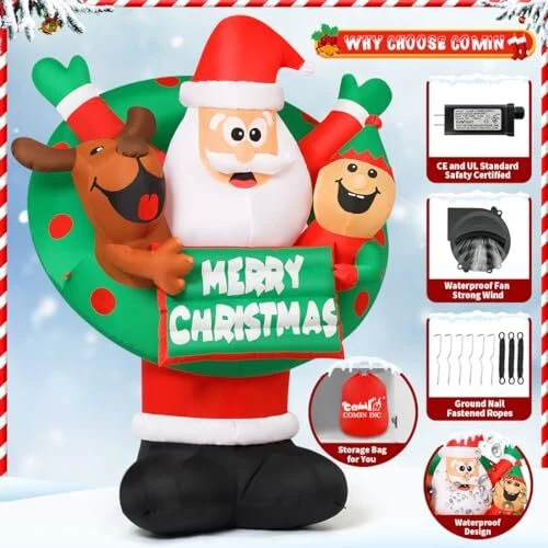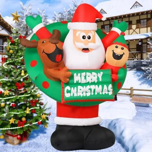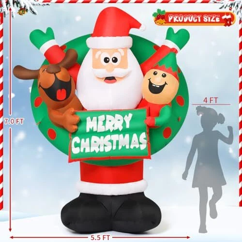 30 Days Return Policy Fast Delivery Trusted seller 7 FT Christmas Inflatables Santa Outdoor Decorations Blow Up Yard Reindeer and Elf with Built-in LEDs for Indoor Party Garden Lawn Decor Product Description 【 Christmas Decoration】Come and light up your holiday decorations with this fun inflatable Santa! The inflatable Santa Claus is flanked by reindeer and elves, holding a Merry Christmas sign, and wearing a wreath together to bring you Christmas wishes. Perfect for lighting up your winter nights, grab this eye-catching decoration to make your holiday happy and bright! 【Fast Inflation and Certified Safety】 - Our christmas decorations outdoor are equipped with a high-performance waterproof fan, which can inflate by itself quickly. Supported by a CE and UL Standard safety certified adapter, complemented by a 10-foot power cord. 【Waterproof and Sturdy】 - Crafted of high-quality waterproof polyester, our christmas inflatable blow up decoration is sturdy and for use. Rain or snow, inflatable christmas decorations are sturdy enough to last throughout the holiday season. 【Easy Use and Storage】 - Our package included everything needed for an easy setup and storage: sandbag,ground stakes,securing ropes,and a storage bag. After the holiday,just deflate,fold,and store for the next festive season using the provided storage bag. 【Customer Service】- Purchase with confidence! is a professional U.S. seller.We offer 24-hour service for you.If you have any questions,please message to us.Our American service team will be always ready to solve any problems for you Shipping Returns Payment Shipping Shipping is FREE to all addresses other than APO/PO boxes in the lower 48 states. All our stock ships from US-based warehouses. Shipped via USPS or UPS (depending on location and package weight) Unless stated otherwise, all orders will ship within 24-72 hours of your payment being processed. Check our feedback to see the great reviews of FAST shipping we offer. Returns As our valued customer, we will do our best to make sure the product you receive arrives to you on time and as expected. If you are not satisfied with your purchase, please contact us within 30 days of receiving your order to process a return. Payment We currently accept payment via eBay managed payments only. Once payment is cleared, we will dispatch your shipment within 1-3 business days. Please refer to the "Shipping" tab for more information regarding shipping speed to your destination.