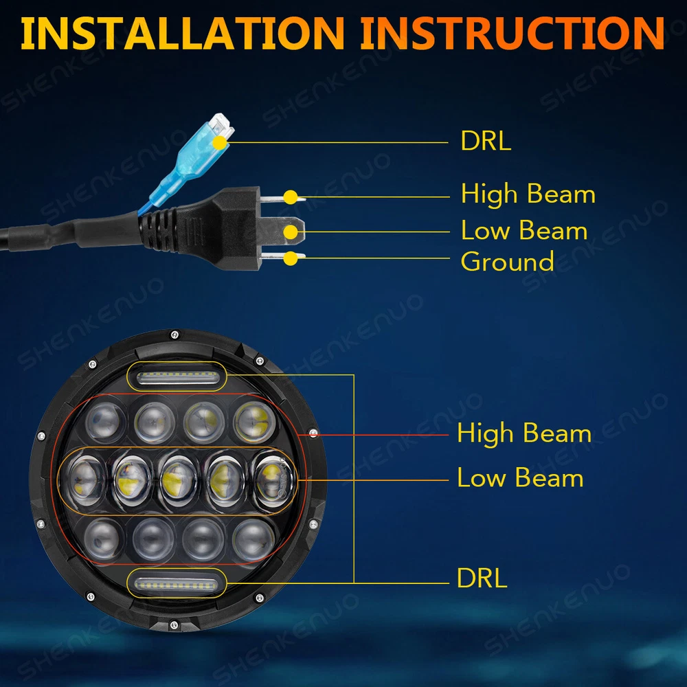 Car Light Bulb GJ Series Bulb HK Series Bulb BY Series Bulb C6 Series Bulb C9 Series Bulb S1 Series Bulb S2 Series Bulb F2 Series Bulb X7 4Side Series Bulb K9 4Side Series Bulb X15 4Side Series Bulb HID Series Bulb Other Type Bulb(Fog,DRL...etc) V5 4Side Series Bulb DF Series Bulb 6 Side Series Bulb Z4 Series Bulb LX Series Bulb DSX Series Bulb K9L 4Side Series Bulb LED Light Strip Work Light Bar Protection Sticker Car Interior/Exterior Trim Tool Promotion Other Item Description 。 Package included: 2PCS 7 inch Round LED Headlights 2PCS H4-H13 9008 Adapter Wires (Installation instruction is NOT included) Note: Without mounting bracket, some models may need mounting bracket! Specification: Power: 75W/Pcs 150W/Pair Dimension: 7" Inch Round Input: 12-24V DC Operating Voltage: 9-30V DC Material: Aluminum Lens Pattern:High & Low Beam & Day time running light Color Temperature: 6000K Cool White Housing Color: Black Waterproof:IP68 Connector: H4/H13 (Ground and High Beam) Function: High Beam,Low Beam, DRL (Day time running light) Features: 1.7 inch led headlights are made with real LED Chips, 100% brighter than other similar stock 7" headlight or halogen headlight 2. Waterproof IP67, DOT Approved, Built-in anti-flicker hardness, no need extra decoder anymore. Perfect sealed to prevent moisture and water build-up. 3. Quick and convenient installation, just plug and play. The headlight is durable, lifetime is over 50,000 hours. About the Adapter: Note:Package Do not Include the adapter. They might be slight flickering cuz the voltage instability characteristics of For JEEP WRANGLER rather than headlights themselves. You couldn't notice the original halogen headlight flickers because of luminance not strong enough. Be aware of that,Plug the headlight first, if the headlights are not flickering, just keep the adapter away. (Including but not limit the following applications) Application: For Alfa Romeo Spider (1988-1994) For AM General Hummer (1992-2001) For American Motors AMX (1968-1978) For American Motors Gremlin (1970-1978) For American Motors Hornet (1970-1977) For American Motors Javelin (1968-1974) For American Motors Matador (1974-1978) For American Motors Pacer (1975-1980) For Bertone X 1/9 (1984-1989) For Chevy Blazer (1969-1974) For Chevy C10 (1975-1980) For Chevy C10 Pickup (1969-1974) For Chevy C10 Suburban (1969-1980) For Chevy C20 (1975-1980) For Chevy C20 Pickup (1969-1974) For Chevy C20 Suburban (1969-1980) For Chevy C30 (1975-1980) For Chevy C30 Pickup (1969-1974) For Chevy Camaro (1967-1981) For Chevy Chevelle (1971-1973) For Chevy Chevette (1976-1978) For Chevy El Camino (1971-1975) For Chevy G10 G20 G30 (1975-1987) For Chevy K10 K20 K30 K5 Blazer (1969-1980) For Chevy Laguna (1973-1975) For Chevy Lux (1980-1982) For Chevy Malibu (1973-1975) For Chevy Monte Carlo (1970-1975) For Chevy Monza (1975-1980) For Chevy Nova (1963-1978) For Chevy Pickup Truck (1967-1973) For Chevy Truck (1947-1957 and 1962-1972) For Chrysler (1949-1955) For Datsun 240Z 260Z 280Z 280ZX (1970-1978) For DeSoto (1949-1955) For Dodge (1949-1955) For Dodge B100 (1975-1978) For Dodge B100 Van (1971-1974) For Dodge B150 (1984-1987) For Dodge B200 (1975-1978) For Dodge B200 Van (1971-1974) For Dodge B250 (1984-1987) For Dodge B300 (1975-1978) For Dodge B300 Van (1971-1974) For Dodge B350 (1984-1987) For Ford Bronco (1966-1977) For Ford Custom 500 (1971/1976) For Ford E-100 Econoline (1969-1978) For Ford E-100 Econoline Club Wagon (1975-1978) For Ford E-150 Econoline (1969-1978) For Ford E-150 Econoline Club Wagon (1975-1978) For Ford F-100 (1975-1979) For Ford F-100 Pikcup (1969-1974) For Ford F-150 (1975-1979) For Ford F-250 (1975-1979) For Ford F-250 Pickup (1969-1974) For Ford F-350 (1975-1979) For Ford F-350 Pickup (1969-1974) For Ford Falcon Sedan Delivery (1961-1965) For Ford Mustang (1965-1973) For Freightliner Century Class (1996-2011) For Freightliner Coronado (2001-2016) For Honda Civic (1976-1981) For Hummer AM General 1992-2001 For Hummer H1 2002-2006 For Hummer H2 2003-2009 (H2 needs 9007 male to H4 female adapter, package not included) For International Harvester 4200 4300 4400 For Jeep Cj-5 1955-1983 For Jeep CJ-7 (1976-1986) For Jeep CJ-8 Scrambler (1981-1985) For Jeep Wrangler JK 2 Door (2007-2018) For Jeep Wrangler JK 4 Door Unlimited (2007-2018) For Jeep Wrangler LJ Unlimited (2004-2006) For Jeep Wrangler TJ (1997-2006) For Jeep Wrangler TJ Unlimited / LJ (2003-2006) For Kenworth T2000 (1998-2010) (Buyer Note, Our Headlight plug is H4,H4-H13) For Land Rover 90/110 1983 to 1991 (including 2.5N/A, 2.5 Turbo, V8) For Land Rover 90/110 Defender 200 Tdi For Land Rover 90/110 Defender 300 Tdi For Land Rover 90/110 Defender Td5 For Land Rover 90/110 Tdi For Land Rover Defender 90 & 110 For Land Rover Defender 90 1995 For Land Rover Defender 90 1997 For Land Rover Range Rover County Classic SportUtility 4-Door 1995 For Mack DM RM RW RS RL CF For Mazda 808 1976-1977 For Mazda Miata (1990-1997) For Mazda Miata MX5 MX-5 (1990-1997) For Mazda Mizer 1976-1977 For Mazda RX-7 1979-1985 For MG Midget (1969-1979) For Oldsmobile Omega (1974-1979) For Peterbilt 359 (1981-1987) For Peterbilt 379 (1988-2009) For Plymouth (1949-1955) For Plymouth Barracuda (1964-1974) For Plymouth Valiant (1963-1976) For Porsche 944 (1983-1991) For Toyota Corolla (1969-1980) For Toyota LandCruiser (1979-1987) For Toyota Pickup (1979-1981) Motorcycle Fitment: (Fits following motorcycle:) For Any Motorcycle models with 7 inch Round headlight,such as(Not limited): For Dyna SwitchbackFLD: 2014, 2016 For Softail Convertible CVO FLSTSE : 2010-2012 For Softail Cros Bones FLSTSB: 2008-2011 For Softail Deluxe CVO FLSTNSE: 2014-2015 For Softail Deluxe EFI FLSTNI FLSTN: 2005-2017 For Softail FatBoy : 2001-2017 For Softail Heritage Classic Springer Classic EFI FLSTI FLSTC FLSTS: 1991-2017 For Softail Nostalgia FLSTN : 1993-1996 For SoftailSlim FLS S FLSS: 2012-2017 For Touring Electra GlideClassic CVO FLHTCSE EFI FLHTCUIPolice FLHTP: 1994-20