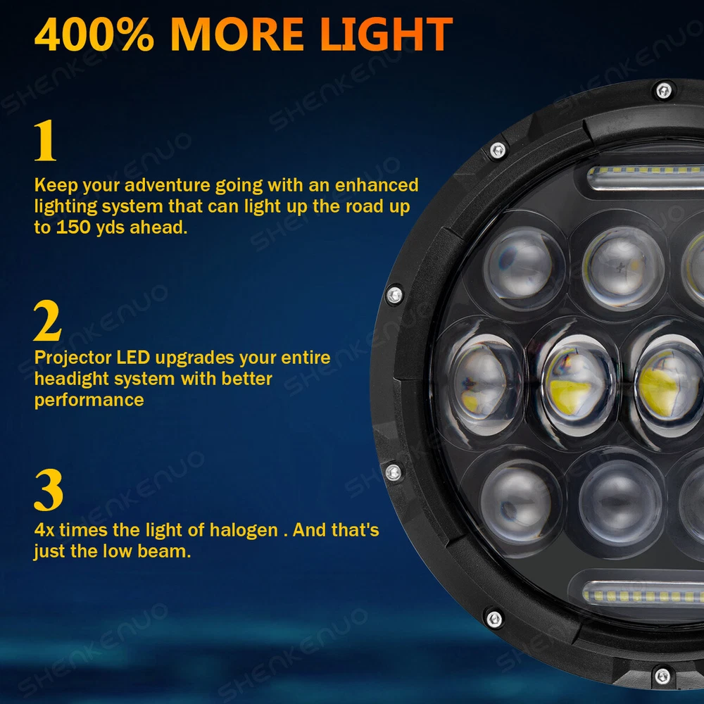 Item Description 。 Package included: 2PCS 7 inch Round LED Headlights 2PCS H4-H13 9008 Adapter Wires (Installation instruction is NOT included) Note: Without mounting bracket, some models may need mounting bracket! Specification: Power: 75W/Pcs 150W/Pair Dimension: 7" Inch Round Input: 12-24V DC Operating Voltage: 9-30V DC Material: Aluminum Lens Pattern:High & Low Beam & Day time running light Color Temperature: 6000K Cool White Housing Color: Black Waterproof:IP68 Connector: H4/H13 (Ground and High Beam) Function: High Beam,Low Beam, DRL (Day time running light) Features: 1.7 inch led headlights are made with real LED Chips, 100% brighter than other similar stock 7" headlight or halogen headlight 2. Waterproof IP67, DOT Approved, Built-in anti-flicker hardness, no need extra decoder anymore. Perfect sealed to prevent moisture and water build-up. 3. Quick and convenient installation, just plug and play. The headlight is durable, lifetime is over 50,000 hours. About the Adapter: Note:Package Do not Include the adapter. They might be slight flickering cuz the voltage instability characteristics of For JEEP WRANGLER rather than headlights themselves. You couldn't notice the original halogen headlight flickers because of luminance not strong enough. Be aware of that,Plug the headlight first, if the headlights are not flickering, just keep the adapter away. (Including but not limit the following applications) Application: For Alfa Romeo Spider (1988-1994) For AM General Hummer (1992-2001) For American Motors AMX (1968-1978) For American Motors Gremlin (1970-1978) For American Motors Hornet (1970-1977) For American Motors Javelin (1968-1974) For American Motors Matador (1974-1978) For American Motors Pacer (1975-1980) For Bertone X 1/9 (1984-1989) For Chevy Blazer (1969-1974) For Chevy C10 (1975-1980) For Chevy C10 Pickup (1969-1974) For Chevy C10 Suburban (1969-1980) For Chevy C20 (1975-1980) For Chevy C20 Pickup (1969-1974) For Chevy C20 Suburban (1969-1980) For Chevy C30 (1975-1980) For Chevy C30 Pickup (1969-1974) For Chevy Camaro (1967-1981) For Chevy Chevelle (1971-1973) For Chevy Chevette (1976-1978) For Chevy El Camino (1971-1975) For Chevy G10 G20 G30 (1975-1987) For Chevy K10 K20 K30 K5 Blazer (1969-1980) For Chevy Laguna (1973-1975) For Chevy Lux (1980-1982) For Chevy Malibu (1973-1975) For Chevy Monte Carlo (1970-1975) For Chevy Monza (1975-1980) For Chevy Nova (1963-1978) For Chevy Pickup Truck (1967-1973) For Chevy Truck (1947-1957 and 1962-1972) For Chrysler (1949-1955) For Datsun 240Z 260Z 280Z 280ZX (1970-1978) For DeSoto (1949-1955) For Dodge (1949-1955) For Dodge B100 (1975-1978) For Dodge B100 Van (1971-1974) For Dodge B150 (1984-1987) For Dodge B200 (1975-1978) For Dodge B200 Van (1971-1974) For Dodge B250 (1984-1987) For Dodge B300 (1975-1978) For Dodge B300 Van (1971-1974) For Dodge B350 (1984-1987) For Ford Bronco (1966-1977) For Ford Custom 500 (1971/1976) For Ford E-100 Econoline (1969-1978) For Ford E-100 Econoline Club Wagon (1975-1978) For Ford E-150 Econoline (1969-1978) For Ford E-150 Econoline Club Wagon (1975-1978) For Ford F-100 (1975-1979) For Ford F-100 Pikcup (1969-1974) For Ford F-150 (1975-1979) For Ford F-250 (1975-1979) For Ford F-250 Pickup (1969-1974) For Ford F-350 (1975-1979) For Ford F-350 Pickup (1969-1974) For Ford Falcon Sedan Delivery (1961-1965) For Ford Mustang (1965-1973) For Freightliner Century Class (1996-2011) For Freightliner Coronado (2001-2016) For Honda Civic (1976-1981) For Hummer AM General 1992-2001 For Hummer H1 2002-2006 For Hummer H2 2003-2009 (H2 needs 9007 male to H4 female adapter, package not included) For International Harvester 4200 4300 4400 For Jeep Cj-5 1955-1983 For Jeep CJ-7 (1976-1986) For Jeep CJ-8 Scrambler (1981-1985) For Jeep Wrangler JK 2 Door (2007-2018) For Jeep Wrangler JK 4 Door Unlimited (2007-2018) For Jeep Wrangler LJ Unlimited (2004-2006) For Jeep Wrangler TJ (1997-2006) For Jeep Wrangler TJ Unlimited / LJ (2003-2006) For Kenworth T2000 (1998-2010) (Buyer Note, Our Headlight plug is H4,H4-H13) For Land Rover 90/110 1983 to 1991 (including 2.5N/A, 2.5 Turbo, V8) For Land Rover 90/110 Defender 200 Tdi For Land Rover 90/110 Defender 300 Tdi For Land Rover 90/110 Defender Td5 For Land Rover 90/110 Tdi For Land Rover Defender 90 & 110 For Land Rover Defender 90 1995 For Land Rover Defender 90 1997 For Land Rover Range Rover County Classic SportUtility 4-Door 1995 For Mack DM RM RW RS RL CF For Mazda 808 1976-1977 For Mazda Miata (1990-1997) For Mazda Miata MX5 MX-5 (1990-1997) For Mazda Mizer 1976-1977 For Mazda RX-7 1979-1985 For MG Midget (1969-1979) For Oldsmobile Omega (1974-1979) For Peterbilt 359 (1981-1987) For Peterbilt 379 (1988-2009) For Plymouth (1949-1955) For Plymouth Barracuda (1964-1974) For Plymouth Valiant (1963-1976) For Porsche 944 (1983-1991) For Toyota Corolla (1969-1980) For Toyota LandCruiser (1979-1987) For Toyota Pickup (1979-1981) Motorcycle Fitment: (Fits following motorcycle:) For Any Motorcycle models with 7 inch Round headlight,such as(Not limited): For Dyna SwitchbackFLD: 2014, 2016 For Softail Convertible CVO FLSTSE : 2010-2012 For Softail Cros Bones FLSTSB: 2008-2011 For Softail Deluxe CVO FLSTNSE: 2014-2015 For Softail Deluxe EFI FLSTNI FLSTN: 2005-2017 For Softail FatBoy : 2001-2017 For Softail Heritage Classic Springer Classic EFI FLSTI FLSTC FLSTS: 1991-2017 For Softail Nostalgia FLSTN : 1993-1996 For SoftailSlim FLS S FLSS: 2012-2017 For Touring Electra GlideClassic CVO FLHTCSE EFI FLHTCUIPolice FLHTP: 1994-2017 For Touring Road King Classic EFI FLHRCI Police CA FLHR: 1994-2017 For Touring Street Glide CVO FLHXSE EFI FLHXI FLHX: 2006-2017 For Touring Street Glide Special FLHXS: 2014-2017 For Touring Ultra Limited: 2010-2017 For Trike FreewheelerFLRT : 2015-2017 For Trike Street Glide FLHXXX: 2010-2011 For Trike TriGlide Ultra Classic FLHTCUTG : 2009-2017 For Yamaha Models For Yamaha Road Star 1600 1999-2003 For Yamaha Road Star 1600 Midnight 2000-2003 For Yamaha Road 