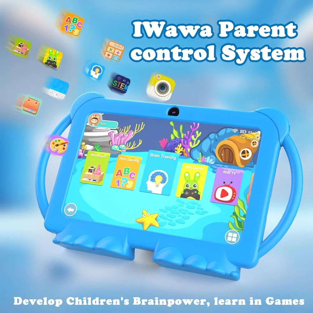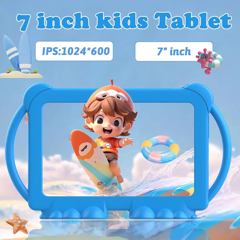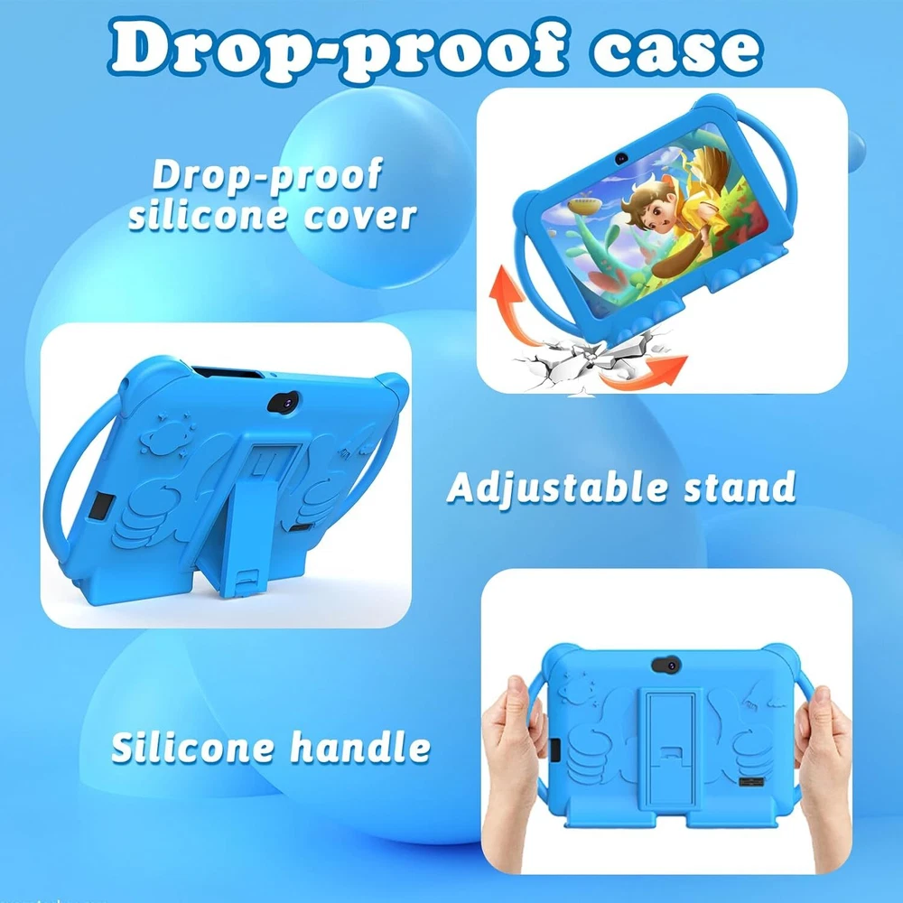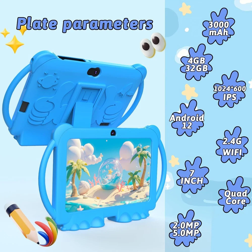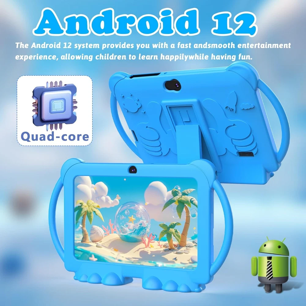 7 inch Tablet Kids Android 12 32GB ROM 2+5MP Dual Camera, Blue Product Details Standing screen display size: 7 Max Screen Resolution: 1280*800 Card Description: Integrated Brand: WUIUHOU Model Name: WUQ8K Memory Storage Capacity: 32 GB Screen Size: 7 Display Resolution Maximum: 1280*800 [Tablet for Kids] This 7-inch tablet comes with a parental control mode that allows parents to set up individual profiles and accounts for their kids, control screen time, add or block apps, and make sure they're browsing safe websites. [FUN DESIGN KIDS TABLET] Tablet comes with rear kickstand and cartoon design. Shockproof protective cover is durable and effective in minimizing damage caused by drops. Light weight, easy to hold and carry. [LEARNING TODDLER TABLET] Children's tablet comes with iwawa apps pre-installed. Includes music, drawing, learning, stories, calculations, games and more. You can also download educational apps from Google Play. [Kids Multi-functional Tablet] This kids tablet has a built-in high performance quad-core processor and Android 12 OS. 1280x800 IPS display, Wifi, Bluetooth, Dual Camera, 4GB RAM and 32GB ROM. supports 512GB Sd card expansion. You can store more cartoons, songs and photos. [BEST GIFT CHOICE] Special Cartoon Design. Whether it's a birthday or a holiday like Easter, Christmas or school supplies, this kids tablet will be a good choice for your child. 7 inch Tablet Kids Tablet Android 12 Tablet 32GB ROM 2+5MP Dual Camera, Shockproof Case Educational, Games, Parental Control.