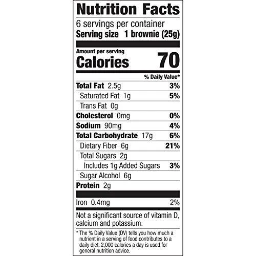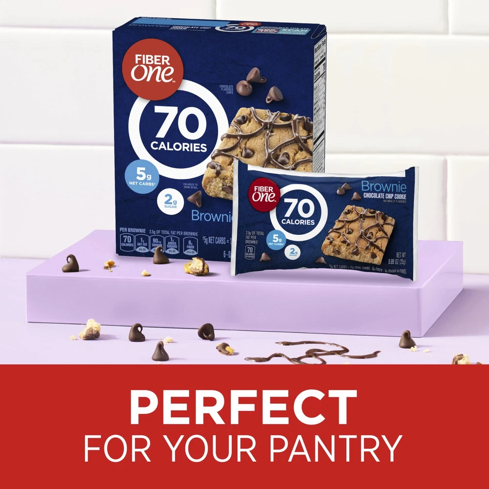 Enjoy an indulgent moment without the guilt with 70 Calorie Chocolate Chip Cookie Flavored Bars. Every bar with chocolatey chips and decadent drizzle is inspired by chocolate chip cookies, with 70 calories, 2g of sugar, and 5g of net carbs. Each delicious fiber bar makes a quick and convenient snack that contains 21% daily value of fiber.* Diets high in fiber can help keep your digestive system on track. Choose as a snack for after breakfast, at the office, or for the lunch box. bars come in great-tasting flavor options including Chocolate Fudge, Cinnamon Coffee Cake, and Chocolate Chip Cookie. Contains 6 bars. 5g net carbs = 17g total carbs - 6g fiber - 6g sugar alcohol. *2.5g total fat per brownie. BROWNIE BAR: 70 Calorie Chocolate Chip Cookie Flavored Brownies; Delicious treats with chocolatey chips and drizzle that you can enjoy as part of a balanced diet FIBER SNACKS: Provides 21% daily value of fiber per bar so you'll feel like one smart cookie when you say 'yes' to your sweet tooth; 2.5g total fat per brownie CHOCOLATE CHIP COOKIE FLAVOR: Don't compromise on deliciousness when you can enjoy the irresistible taste of chocolate chip cookies in these 70 Calorie Brownie Bars PANTRY FAVORITE: Choose as a snack for after breakfast, at the office, or for the lunch box CONTAINS: Eight 5.34 oz boxes of 70 Calorie Chocolate Chip Cookie Flavored Brownies; 6 bars per box