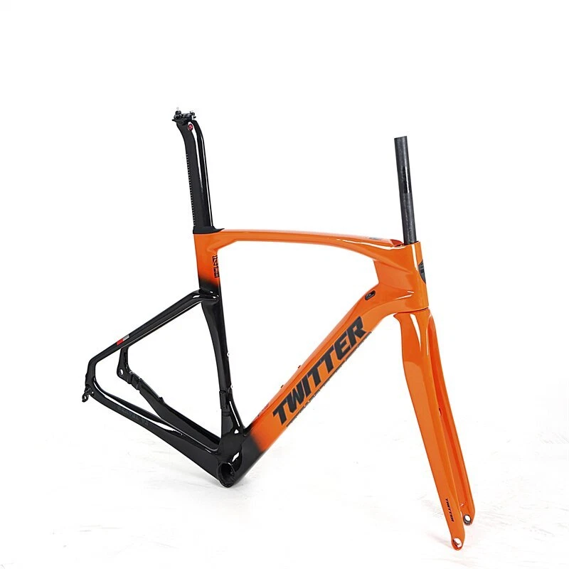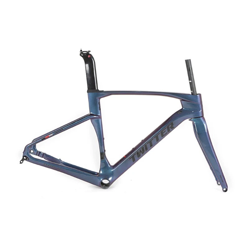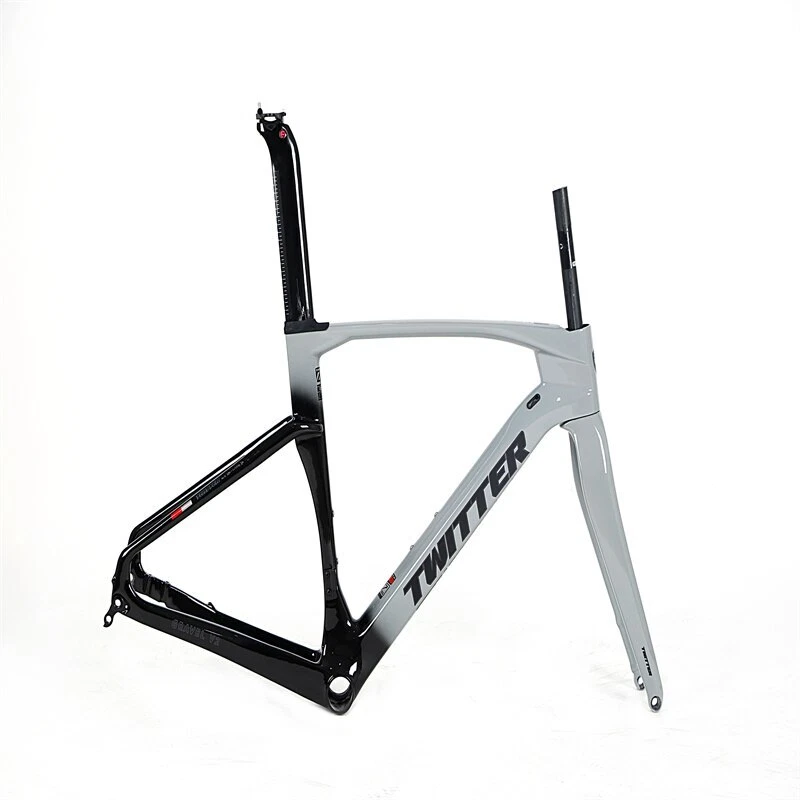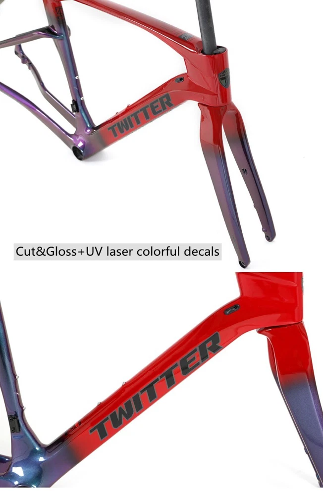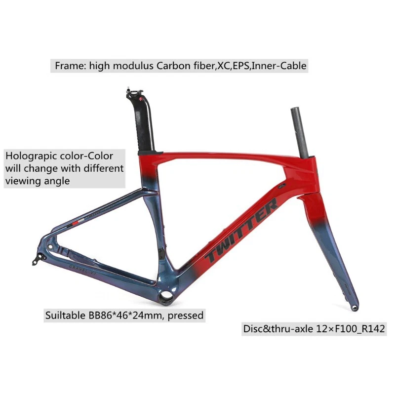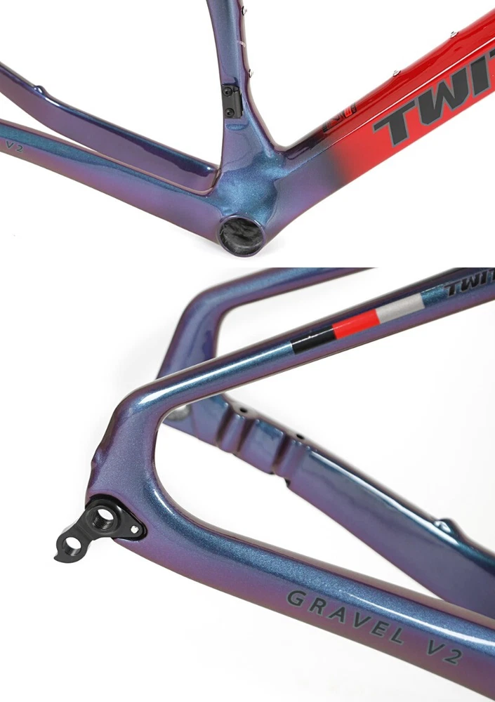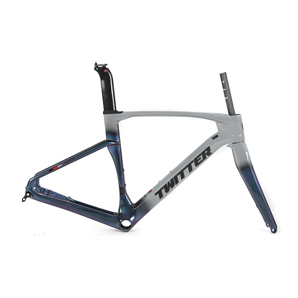 Brand: TWITTER/OEM Model/Name: GRAVEL-V2(disc&thru-axle 12×142), high modulus Carbon fiber,XC,EPS,Inner-Cable,Cut&Gloss+UV laser colorful decals Size(Height): 45cm / 48cm / 51cm / 54cm Applicable wheel Size: 700C*40C Material: Carbon T900 ASSY Size: Inner fixed to seat post+Head tube 52*52+BB86*46mm Pressed+ Hanging fixed to front deraillure, Thru-axle F12*100_R12*142mm, Flat-mount Post Process: Aero-design, EPS, Inner-Cables, Glittering paint&UV laser wire drawing decals Weight: Frame≈1.2KG, Fork≈0.37KG, Seat post≈0.25KG Certifications: ISO-9001 Product Description