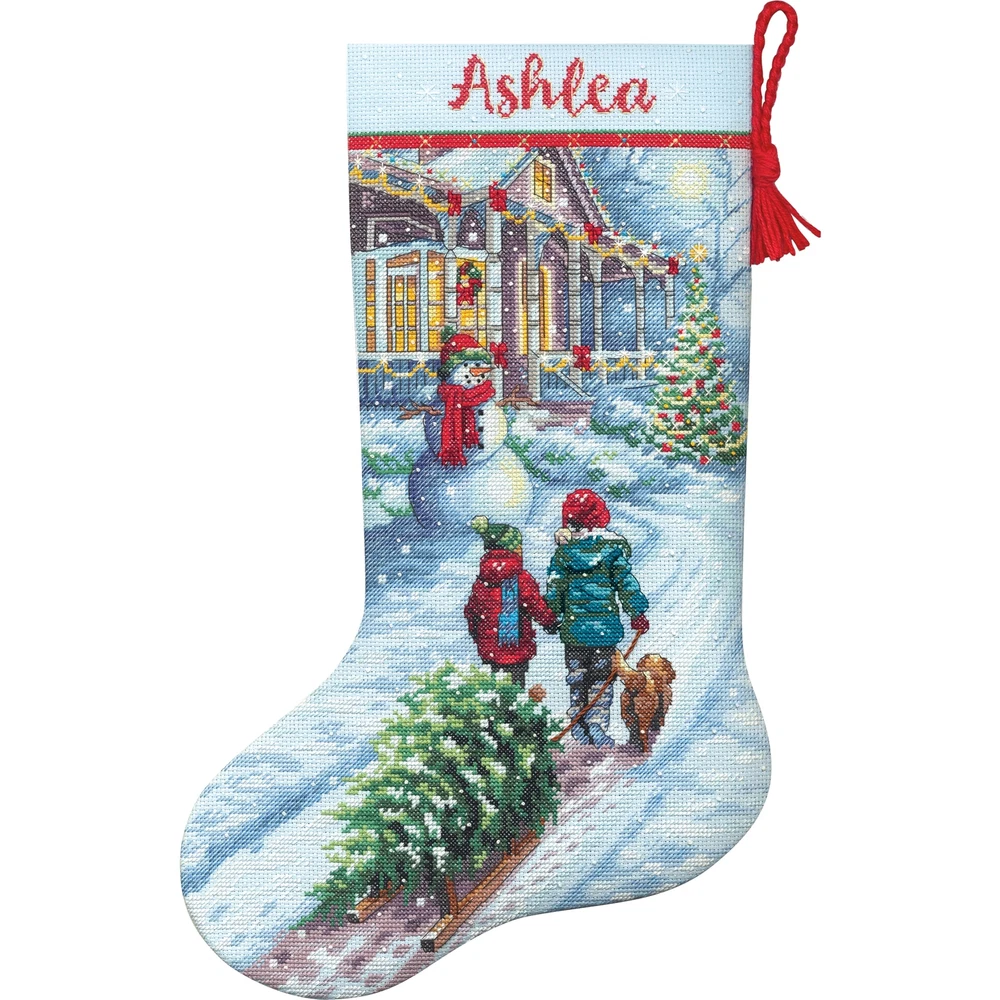 A delicious cup of hot cocoa awaits this young tree-transport team in this darling Christmas counted cross stitch pattern. This holiday scene in counted cross stitch is sure to warm the heart and makes a wonderful Christmas keepsake. Finished size: 16" long. Copyright Simon Treadwell, courtesy of Advocate Art Inc. Counted cross stitch set contains presorted thread, 14 count lt. blue Aida, felt for stocking back, needle 100% wool yarn for hanger, needle, and instructions with an alphabet for personalizing. counted cross stitch kit for adults comes with presorted thread, wool yarn for stocking hanger, 14 count lt. blue Aida, felt, needle and instructions with an alphabet for customizing. Finished cross stitch Christmas stocking measures 16 L. Inspired by classic holiday traditions, this counted cross stitch Christmas stocking kit will warm your heart just like a hot cup of cocoa. A fun and festive Christmas craft, you can add custom names, dates, and more to this stocking cross stitch pattern for an instant family keepsake. Stitch this stocking and fill it with presents and treats for a fun Christmas gift.