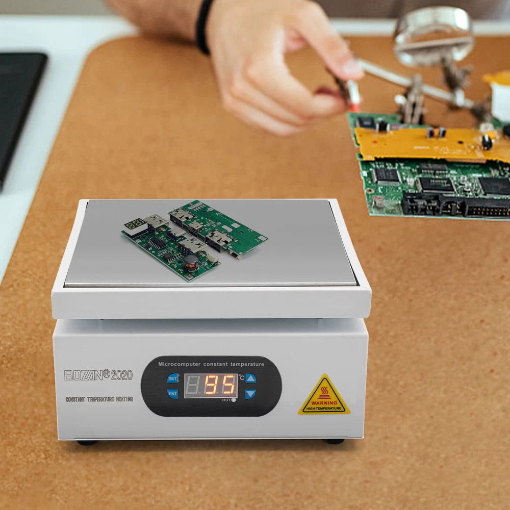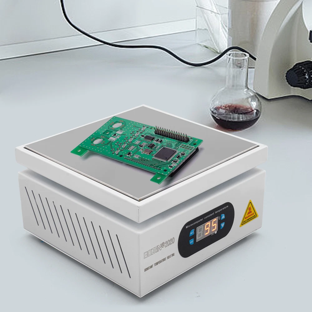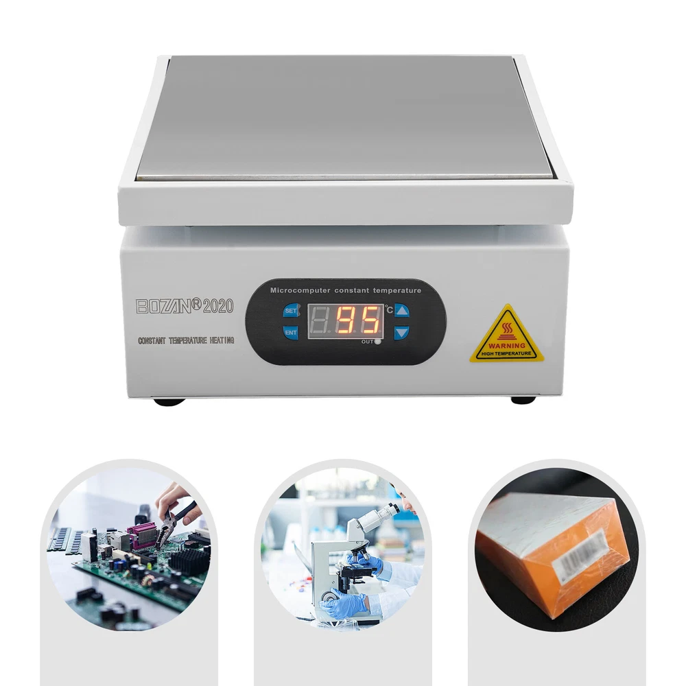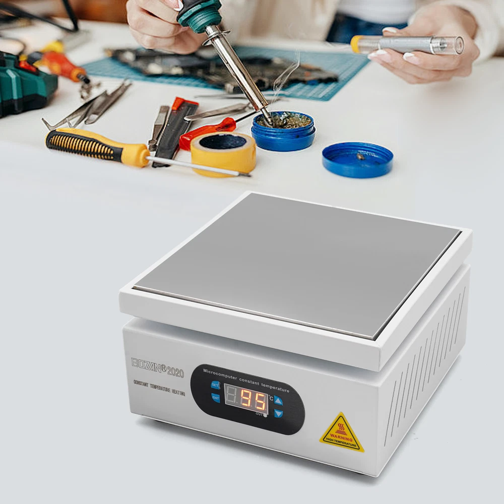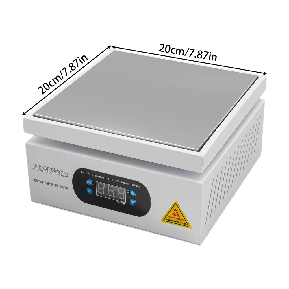 700W 110V Electric Soldering Hot Plate Microcomputer Preheating Welder Hot Plate Description This microcomputer electric hot plate allows for fast, even, and stable heating, making your work more efficient. The product is made of aluminum alloy and metal plate, which is sturdy and durable while ensuring good heat conductivity. It is easy to operate and has a wide range of temperature adjustments and a 7.87*7.87-inch heat plate, making it widely available in different industries. Key Features Sturdy and Durable: The product is mainly made of aluminum alloy and metal plate and adopted wire drawing and spray paint processes, making it not easy to corrode and deform so that it can bear high-tension use and has a long service life. High Heating Efficiency: The 700W high power and aluminum alloy heating plate with high thermal conductivity can ensure that the heating plate and the workpiece are heated evenly and quickly to improve your working efficiency. Multi-functions: The product comes with multiple functions to make your work easier, which include the menu-locking function, temperature correction, and the auto-tuning function. Constant Temperature: The product adopts a microcomputer chip with low energy consumption, which can control the temperature intelligently and accurately for even, stable, and quick heating. Simple Operation: It comes with a digital display that can show you the temperature so that you can easily and precisely control the temperature from 32-932℉ through the operation panel. In addition, the product also has a memory function. After saving the temperature, the next time the product starts it will automatically heat up to the last set temperature. Safety Guarantee: The product is equipped with a three-prong power cord socket made of insulating material to avoid leakage of electricity. The fuse tube next to the socket helps avoid fire while protecting the circuit heater core and allowing for easy replacement. Wide Compatibility: The 7.87*7.87-inch heating plate and 32-932℉ adjustable temperature make our products suitable for heat shrink film packaging, PCB removal, chemistry experiments, and other fields. Protective Packaging: The pearl cotton can better protect your product during transportation so that it can be delivered to you completely to the greatest extent. Customer Service: We aim to provide quality products and services. If you have any problems, please feel free to contact us. We will reply and solve the problem for you as soon as possible. Details Non-slip Feet: They provide stable support to prevent the product from sliding during operation, and protect the countertop from scratches. Heat Emission Holes: The heat-sink holes on the left and right sides allow air convection to promote heat dissipation and increase the service life of the heater. Surrounding Edge Wrapping: The heating platform is designed with edges around it to prevent accidental contact and scalding during operation. This design also avoids slips or scratches. Tools for Shrinking Packaging: These tools can be used to press and secure film packages for heat-shrink packaging. Application The products can be used for splitting, repairing cell phone screens, LED displays, component work, PCB dismantling, soldering work, component heating work, SMD rebuilding work, packaging box plastic sealing hot film work, etc. Temperature Range (For Reference Only) 300-400°C/572-752℉: Pre-heating of mold cores and various metal materials 200-300°C/392-572℉: BGA ball welding 200-250°C/392-482℉: LED bead soldering, maintenance 150-200°C/302-392℉: Preheating and repair for electronic circuit board 80-120°C/176-248℉: Remove cell phone screen 30-100°C/86-212℉: Heating laboratory reagents 30°C/86℉: Heating Medical Experiment, Cell Culture, and Liquid Specifications Color: White+Silver Material: Metal Plate, Aluminum Alloy Process: Wire Drawing, Spray Paint Plug Type: US Standard Power: 700W Voltage: 110V Power Cord Length: About 1.5m/4.92ft Power Cord Diameter: About 6.7mm/0.26in Heating Area: 20*20cm/7.87*7.87in Adjustable Temperature Range: 0-500℃/32-932℉ Packaging Size: 26.5*26.5*18.5cm/10.43*10.43*7.28in Gross Weight: 3.1kg/6.8lbs Package Included 1* Microcomputer Electric Hot Plate 1*Power Cord 1*English Manual Other Needed Accessories Notes Please check the size carefully before ordering. Please read the operating manual completely before use. And pay particular attention to the safety instructions included. Please make sure the machine is well grounded before use. Please do not let the airflow blow directly onto the circuit board, otherwise, it will affect the heating of the heater. Before use, please make sure that the ventilation window on the chassis of the thermostatic platform is not blocked by foreign objects, so as not to affect its heat dissipation effect. Please do not place the product in damp and corrosive places for use or storage. Please make sure that the tabletop with the thermostatic platform is flat and not inclined to keep the aluminum heating platform level. Please also make sure that the desktop material must be heat-resistant . The surface of the workpiece and the surrounding area are very hot during product operation, so please do not use the hot plate near flammable materials, and please take care not to allow yourself to be scalded or burned. If you need to move or touch the machine, please turn off the power and wait for the heating plate to cool down completely to room temperature. To prolong the service life of the heating element and the machine, please do not use the machine for a long time under high temperatures (higher than 300℃/572℉). Under normal circumstances, the machine should not work continuously for more than 8 hours. This machine is a high-temperature electrically heated product. Please disconnect the power supply if the machine is not in use to avoid danger and accidents. Please allow the slight color difference caused by the shoot