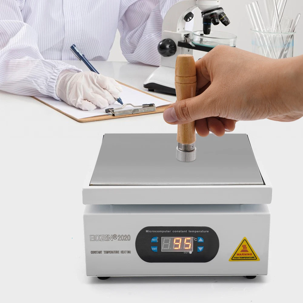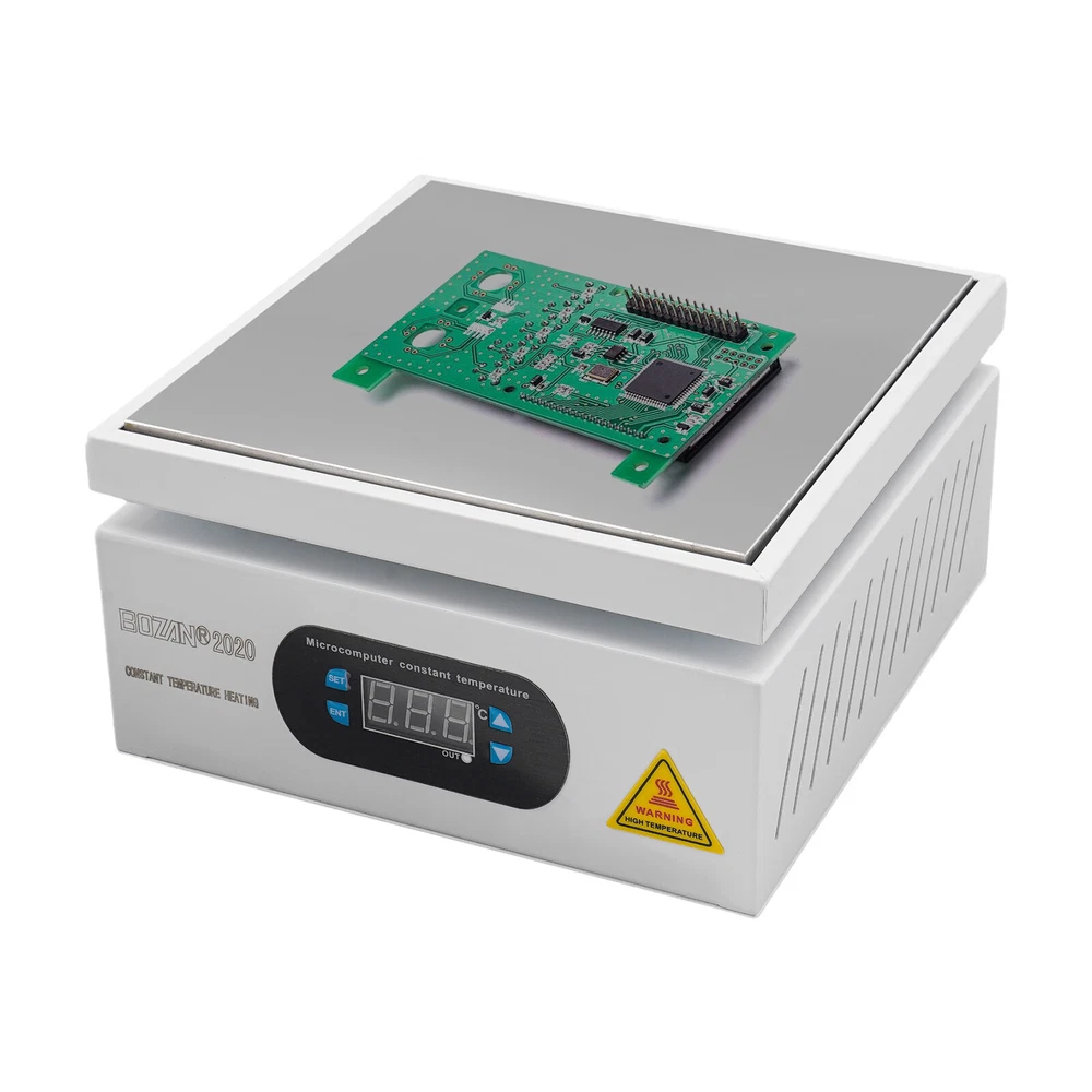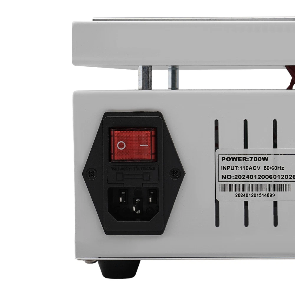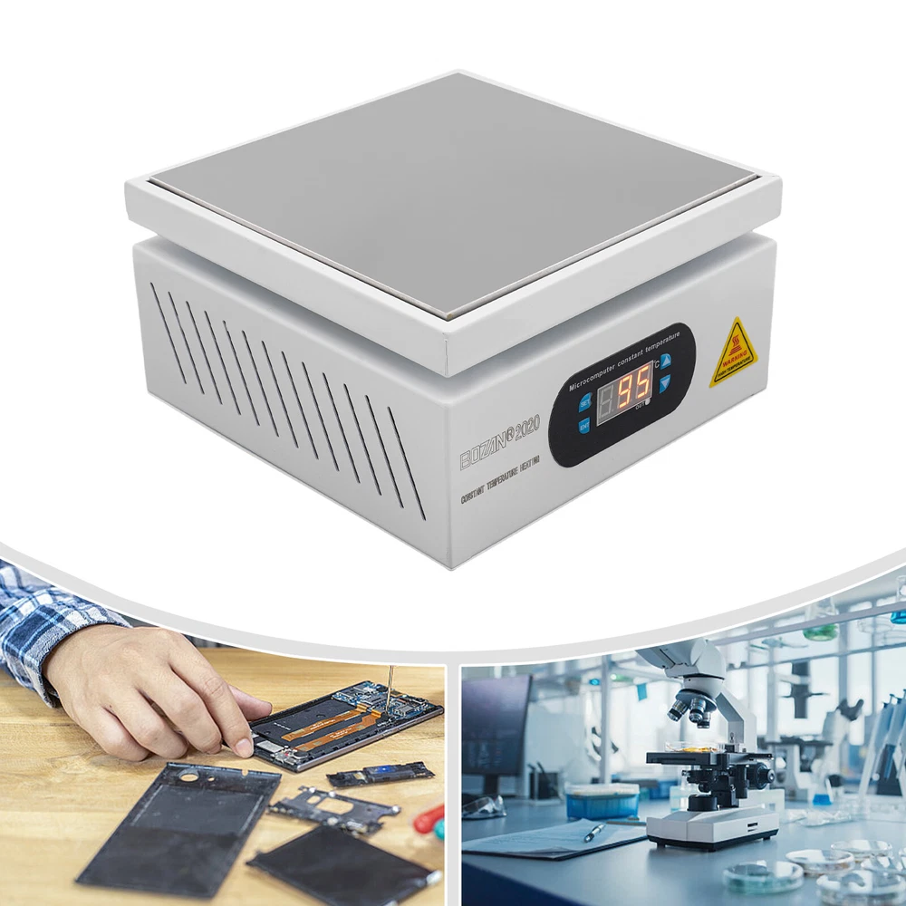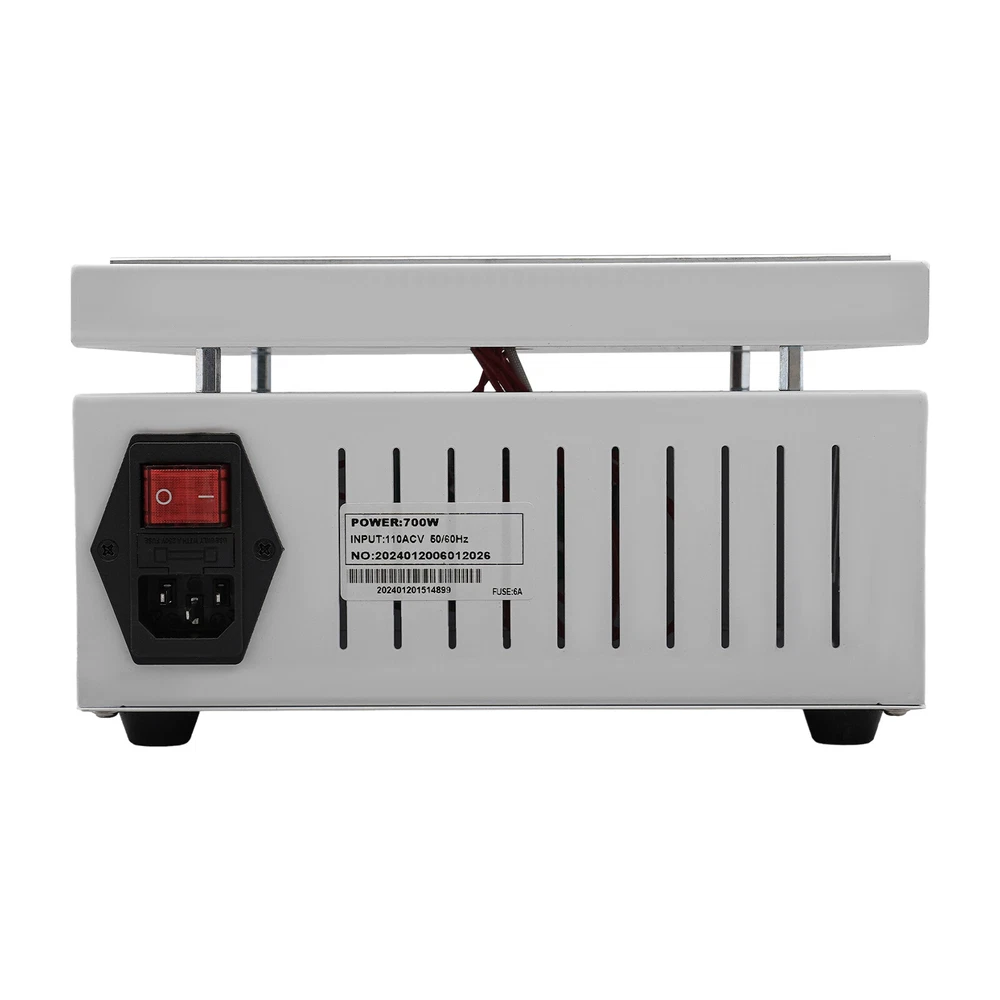 700W 110V Electric Soldering Hot Plate Microcomputer Preheating Welder Hot Plate Description This microcomputer electric hot plate allows for fast, even, and stable heating, making your work more efficient. The product is made of aluminum alloy and metal plate, which is sturdy and durable while ensuring good heat conductivity. It is easy to operate and has a wide range of temperature adjustments and a 7.87*7.87-inch heat plate, making it widely available in different industries. Key Features Sturdy and Durable: The product is mainly made of aluminum alloy and metal plate and adopted wire drawing and spray paint processes, making it not easy to corrode and deform so that it can bear high-tension use and has a long service life. High Heating Efficiency: The 700W high power and aluminum alloy heating plate with high thermal conductivity can ensure that the heating plate and the workpiece are heated evenly and quickly to improve your working efficiency. Multi-functions: The product comes with multiple functions to make your work easier, which include the menu-locking function, temperature correction, and the auto-tuning function. Constant Temperature: The product adopts a microcomputer chip with low energy consumption, which can control the temperature intelligently and accurately for even, stable, and quick heating. Simple Operation: It comes with a digital display that can show you the temperature so that you can easily and precisely control the temperature from 32-932℉ through the operation panel. In addition, the product also has a memory function. After saving the temperature, the next time the product starts it will automatically heat up to the last set temperature. Safety Guarantee: The product is equipped with a three-prong power cord socket made of insulating material to avoid leakage of electricity. The fuse tube next to the socket helps avoid fire while protecting the circuit heater core and allowing for easy replacement. Wide Compatibility: The 7.87*7.87-inch heating plate and 32-932℉ adjustable temperature make our products suitable for heat shrink film packaging, PCB removal, chemistry experiments, and other fields. Protective Packaging: The pearl cotton can better protect your product during transportation so that it can be delivered to you completely to the greatest extent. Customer Service: We aim to provide quality products and services. If you have any problems, please feel free to contact us. We will reply and solve the problem for you as soon as possible. Details Non-slip Feet: They provide stable support to prevent the product from sliding during operation, and protect the countertop from scratches. Heat Emission Holes: The heat-sink holes on the left and right sides allow air convection to promote heat dissipation and increase the service life of the heater. Surrounding Edge Wrapping: The heating platform is designed with edges around it to prevent accidental contact and scalding during operation. This design also avoids slips or scratches. Tools for Shrinking Packaging: These tools can be used to press and secure film packages for heat-shrink packaging. Application The products can be used for splitting, repairing cell phone screens, LED displays, component work, PCB dismantling, soldering work, component heating work, SMD rebuilding work, packaging box plastic sealing hot film work, etc. Temperature Range (For Reference Only) 300-400°C/572-752℉: Pre-heating of mold cores and various metal materials 200-300°C/392-572℉: BGA ball welding 200-250°C/392-482℉: LED bead soldering, maintenance 150-200°C/302-392℉: Preheating and repair for electronic circuit board 80-120°C/176-248℉: Remove cell phone screen 30-100°C/86-212℉: Heating laboratory reagents 30°C/86℉: Heating Medical Experiment, Cell Culture, and Liquid Specifications Color: White+Silver Material: Metal Plate, Aluminum Alloy Process: Wire Drawing, Spray Paint Plug Type: US Standard Power: 700W Voltage: 110V Power Cord Length: About 1.5m/4.92ft Power Cord Diameter: About 6.7mm/0.26in Heating Area: 20*20cm/7.87*7.87in Adjustable Temperature Range: 0-500℃/32-932℉ Packaging Size: 26.5*26.5*18.5cm/10.43*10.43*7.28in Gross Weight: 3.1kg/6.8lbs Package Included 1* Microcomputer Electric Hot Plate 1*Power Cord 1*English Manual Other Needed Accessories Notes Please check the size carefully before ordering. Please read the operating manual completely before use. And pay particular attention to the safety instructions included. Please make sure the machine is well grounded before use. Please do not let the airflow blow directly onto the circuit board, otherwise, it will affect the heating of the heater. Before use, please make sure that the ventilation window on the chassis of the thermostatic platform is not blocked by foreign objects, so as not to affect its heat dissipation effect. Please do not place the product in damp and corrosive places for use or storage. Please make sure that the tabletop with the thermostatic platform is flat and not inclined to keep the aluminum heating platform level. Please also make sure that the desktop material must be heat-resistant . The surface of the workpiece and the surrounding area are very hot during product operation, so please do not use the hot plate near flammable materials, and please take care not to allow yourself to be scalded or burned. If you need to move or touch the machine, please turn off the power and wait for the heating plate to cool down completely to room temperature. To prolong the service life of the heating element and the machine, please do not use the machine for a long time under high temperatures (higher than 300℃/572℉). Under normal circumstances, the machine should not work continuously for more than 8 hours. This machine is a high-temperature electrically heated product. Please disconnect the power supply if the machine is not in use to avoid danger and accidents. Please allow the slight color difference caused by the shoot