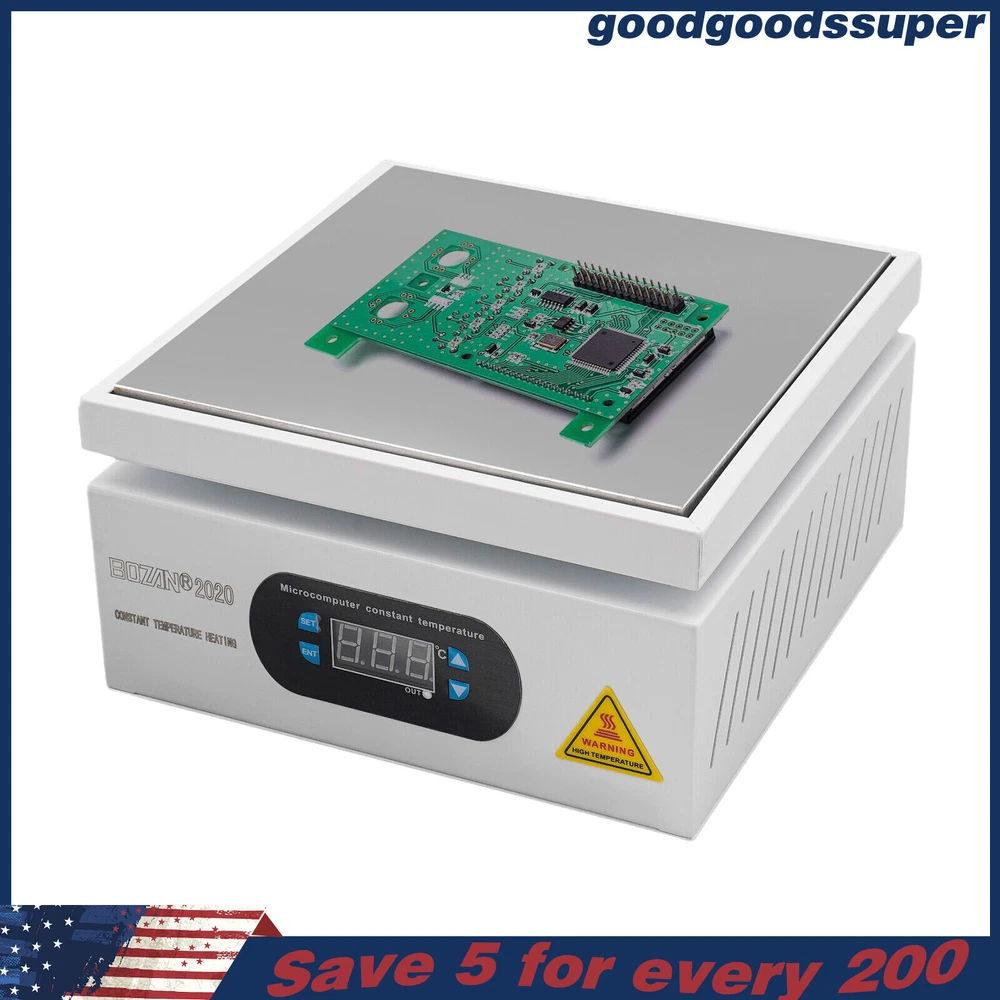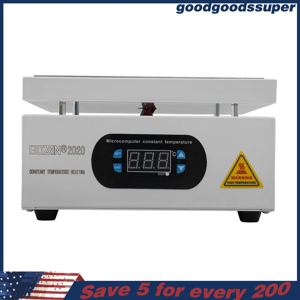 welcome to goodgoodssuper Description This microcomputer electric hot plate allows for fast, even, and stable heating, making your work more efficient. The product is made of aluminum alloy and metal plate, which is sturdy and durable while ensuring good heat conductivity. It is easy to operate and has a wide range of temperature adjustments and a 7.87*7.87-inch heat plate, making it widely available in different industries. Key Features Sturdy and Durable: The product is mainly made of aluminum alloy and metal plate and adopted wire drawing and spray paint processes, making it not easy to corrode and deform so that it can bear high-tension use and has a long service life. High Heating Efficiency: The 700W high power and aluminum alloy heating plate with high thermal conductivity can ensure that the heating plate and the workpiece are heated evenly and quickly to improve your working efficiency. Multi-functions: The product comes with multiple functions to make your work easier, which include the menu-locking function, temperature correction, and the auto-tuning function. Constant Temperature: The product adopts a microcomputer chip with low energy consumption, which can control the temperature intelligently and accurately for even, stable, and quick heating. Simple Operation: It comes with a digital display that can show you the temperature so that you can easily and precisely control the temperature from 32-932℉ through the operation panel. In addition, the product also has a memory function. After saving the temperature, the next time the product starts it will automatically heat up to the last set temperature. Safety Guarantee: The product is equipped with a three-prong power cord socket made of insulating material to avoid leakage of electricity. The fuse tube next to the socket helps avoid fire while protecting the circuit heater core and allowing for easy replacement. Wide Compatibility: The 7.87*7.87-inch heating plate and 32-932℉ adjustable temperature make our products suitable for heat shrink film packaging, PCB removal, chemistry experiments, and other fields. Protective Packaging: The pearl cotton can better protect your product during transportation so that it can be delivered to you completely to the greatest extent. Customer Service: We aim to provide quality products and services. If you have any problems, please feel free to contact us. We will reply and solve the problem for you as soon as possible. Details Non-slip Feet: They provide stable support to prevent the product from sliding during operation, and protect the countertop from scratches. Heat Emission Holes: The heat-sink holes on the left and right sides allow air convection to promote heat dissipation and increase the service life of the heater. Surrounding Edge Wrapping: The heating platform is designed with edges around it to prevent accidental contact and scalding during operation. This design also avoids slips or scratches. Tools for Shrinking Packaging: These tools can be used to press and secure film packages for heat-shrink packaging. Application The products can be used for splitting, repairing cell phone screens, LED displays, component work, PCB dismantling, soldering work, component heating work, SMD rebuilding work, packaging box plastic sealing hot film work, etc. Temperature Range (For Reference Only) 300-400°C/572-752℉: Pre-heating of mold cores and various metal materials 200-300°C/392-572℉: BGA ball welding 200-250°C/392-482℉: LED bead soldering, maintenance 150-200°C/302-392℉: Preheating and repair for electronic circuit board 80-120°C/176-248℉: Remove cell phone screen 30-100°C/86-212℉: Heating laboratory reagents 30°C/86℉: Heating Medical Experiment, Cell Culture, and Liquid Specifications Color: White+Silver Material: Metal Plate, Aluminum Alloy Process: Wire Drawing, Spray Paint Plug Type: US Standard Power: 700W Voltage: 110V Power Cord Length: About 1.5m/4.92ft Power Cord Diameter: About 6.7mm/0.26in Heating Area: 20*20cm/7.87*7.87in Adjustable Temperature Range: 0-500℃/32-932℉ Packaging Size: 26.5*26.5*18.5cm/10.43*10.43*7.28in Gross Weight: 3.1kg/6.8lbs Package Included 1* Microcomputer Electric Hot Plate 1*Power Cord 1*English Manual Other Needed Accessories Notes Please check the size carefully before ordering. Please read the operating manual completely before use. And pay particular attention to the safety instructions included. Please make sure the machine is well grounded before use. Please do not let the airflow blow directly onto the circuit board, otherwise, it will affect the heating of the heater. Before use, please make sure that the ventilation window on the chassis of the thermostatic platform is not blocked by foreign objects, so as not to affect its heat dissipation effect. Please do not place the product in damp and corrosive places for use or storage. Please make sure that the tabletop with the thermostatic platform is flat and not inclined to keep the aluminum heating platform level. Please also make sure that the desktop material must be heat-resistant . The surface of the workpiece and the surrounding area are very hot during product operation, so please do not use the hot plate near flammable materials, and please take care not to allow yourself to be scalded or burned. If you need to move or touch the machine, please turn off the power and wait for the heating plate to cool down completely to room temperature. To prolong the service life of the heating element and the machine, please do not use the machine for a long time under high temperatures (higher than 300℃/572℉). Under normal circumstances, the machine should not work continuously for more than 8 hours. This machine is a high-temperature electrically heated product. Please disconnect the power supply if the machine is not in use to avoid danger and accidents. Please allow the slight color difference caused by the shooting light and 1-3cm error due to manual measurement, an